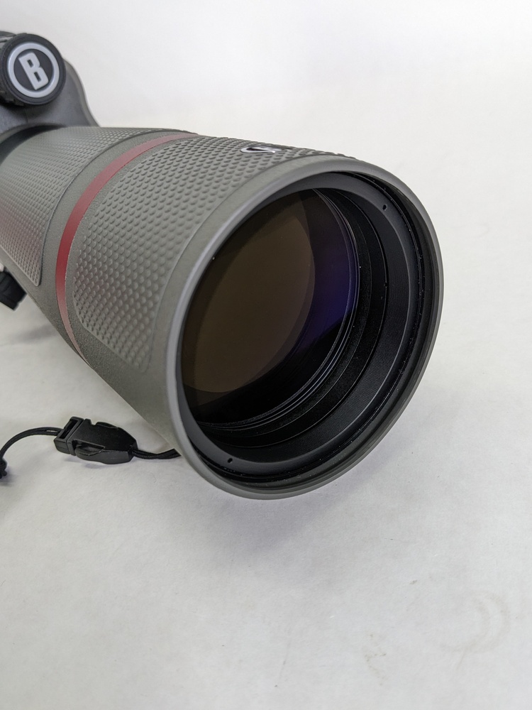 The Bushnell Nitro 20-60x65 ED is a compact spotting scope with an unobtrusive rubber body. The use of special ED Prime lens elements ensures a clear and sharp image without chromatic aberration, which prevents white birds from turning purple or green in bright sunlight. This ensures an optimal viewing experience during birdwatching or other activities where a razor-sharp and colour-fidelity image is important. Focusing with the Nitro is done with two dials: the large knob for coarse focusing and the front knob for fine tuning.