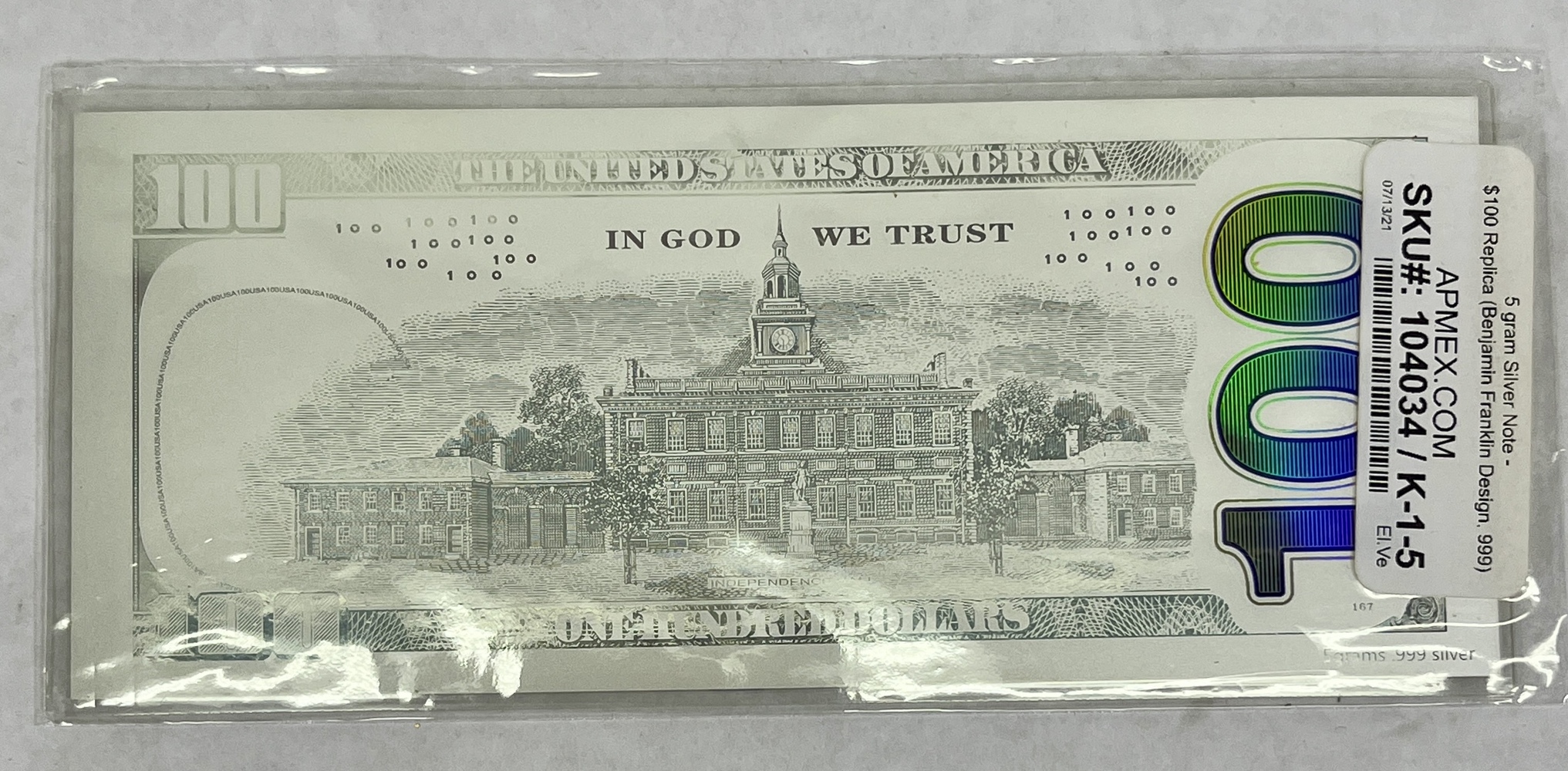 $100 Bill .999 Silver 5 Gram Franklin Note Design