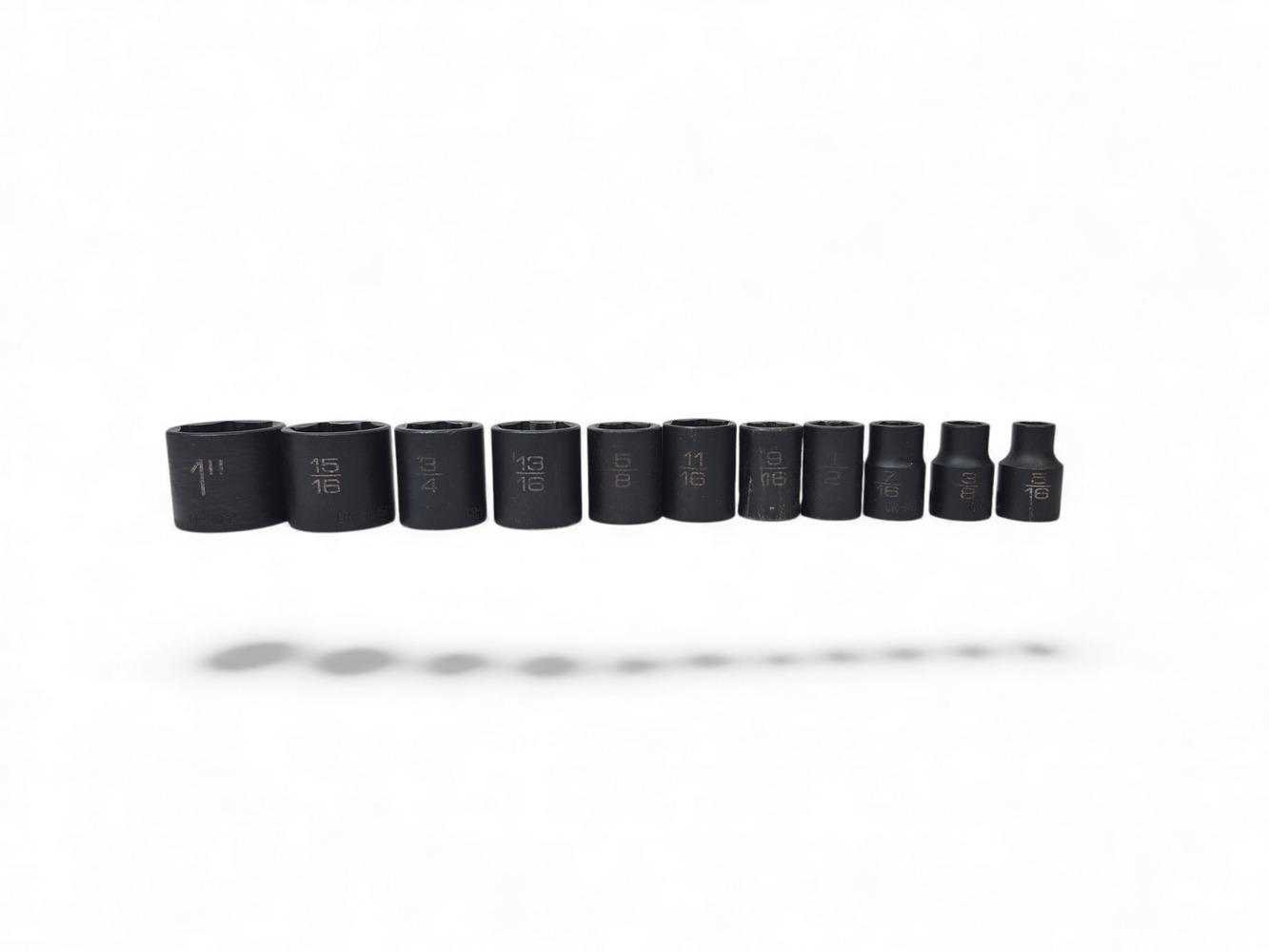 - 1", 15/16", 13/16", 3/4", 5/8", 11/16", 9/16", 1/2", 7/16", 3/8", 5/16", sockets included