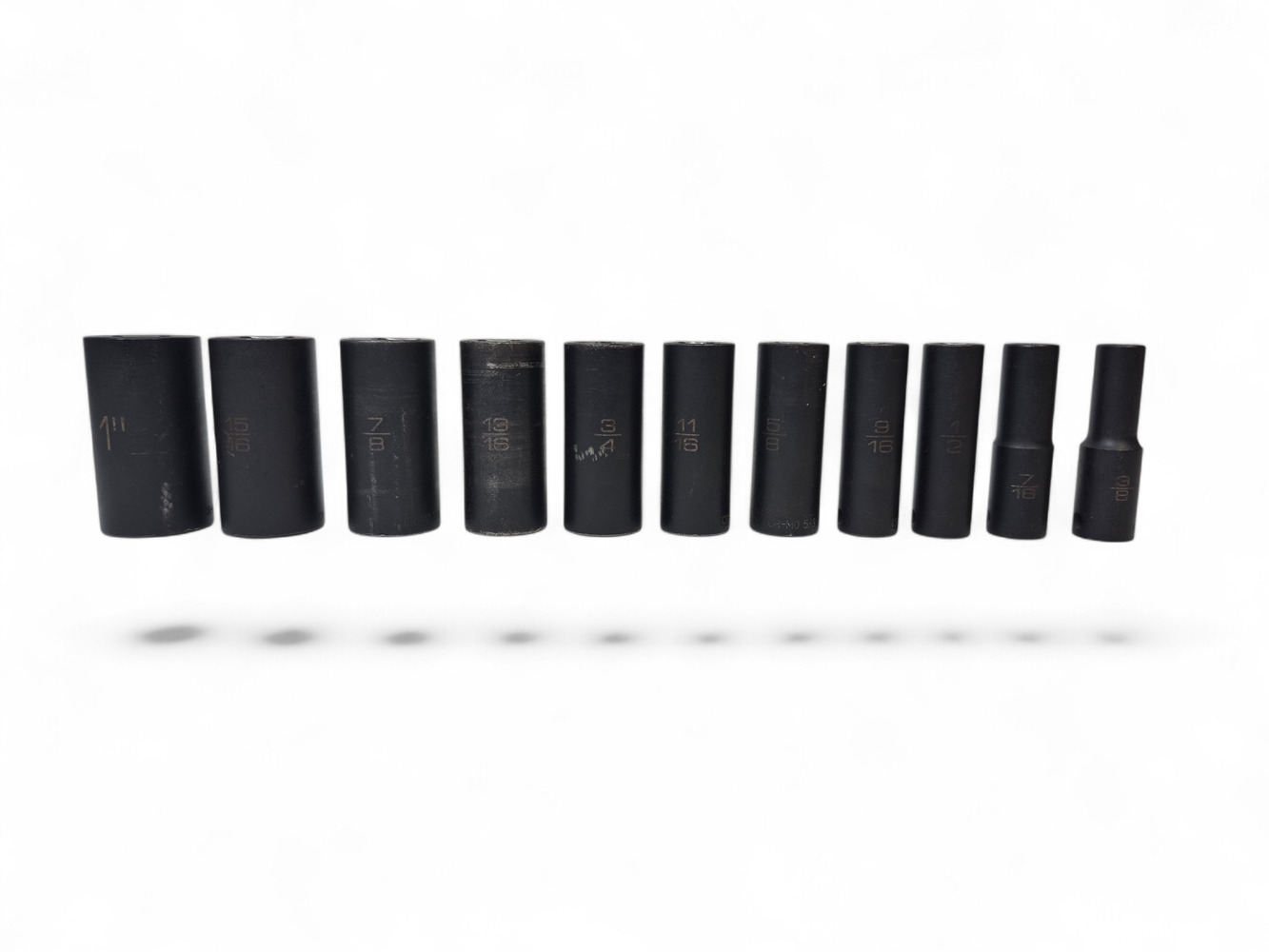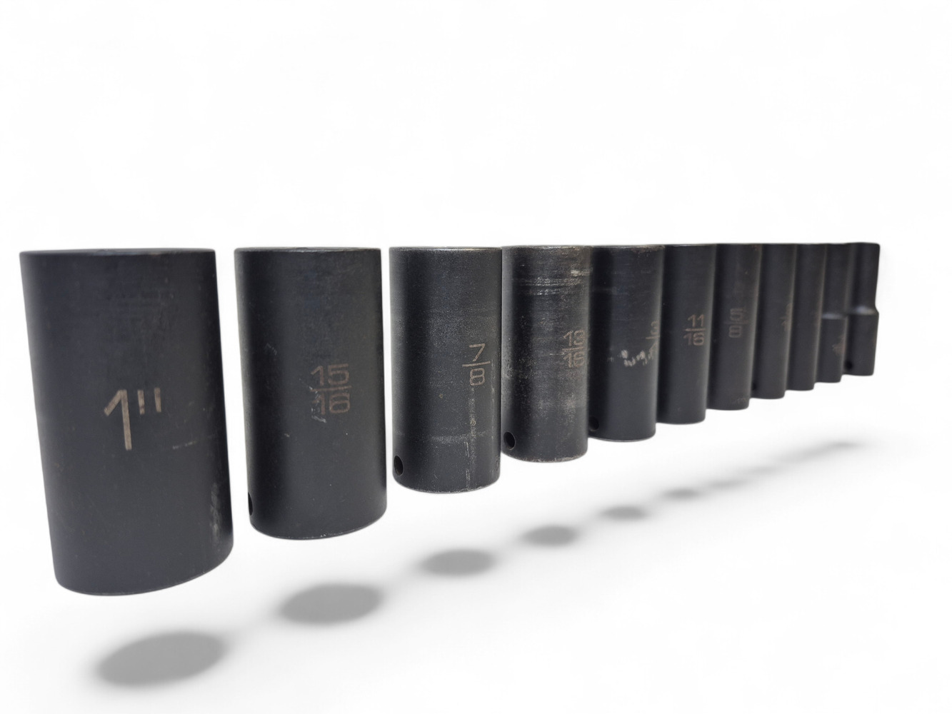 - 1", 15/16", 7/8", 13/16", 3/4", 11/16", 5.8", 9/16, 1/2", 7/16", 3/8", 5/16" inch sockets included