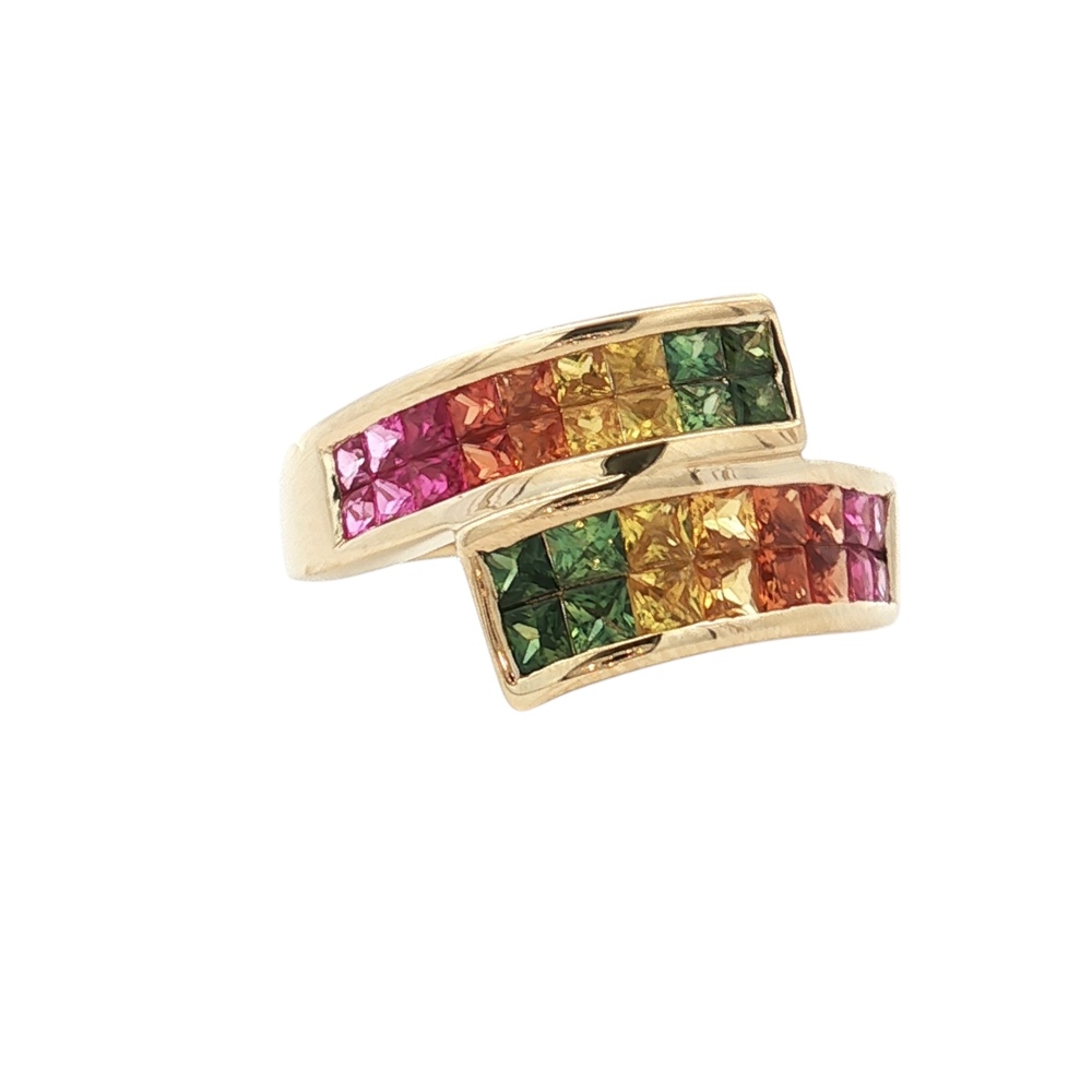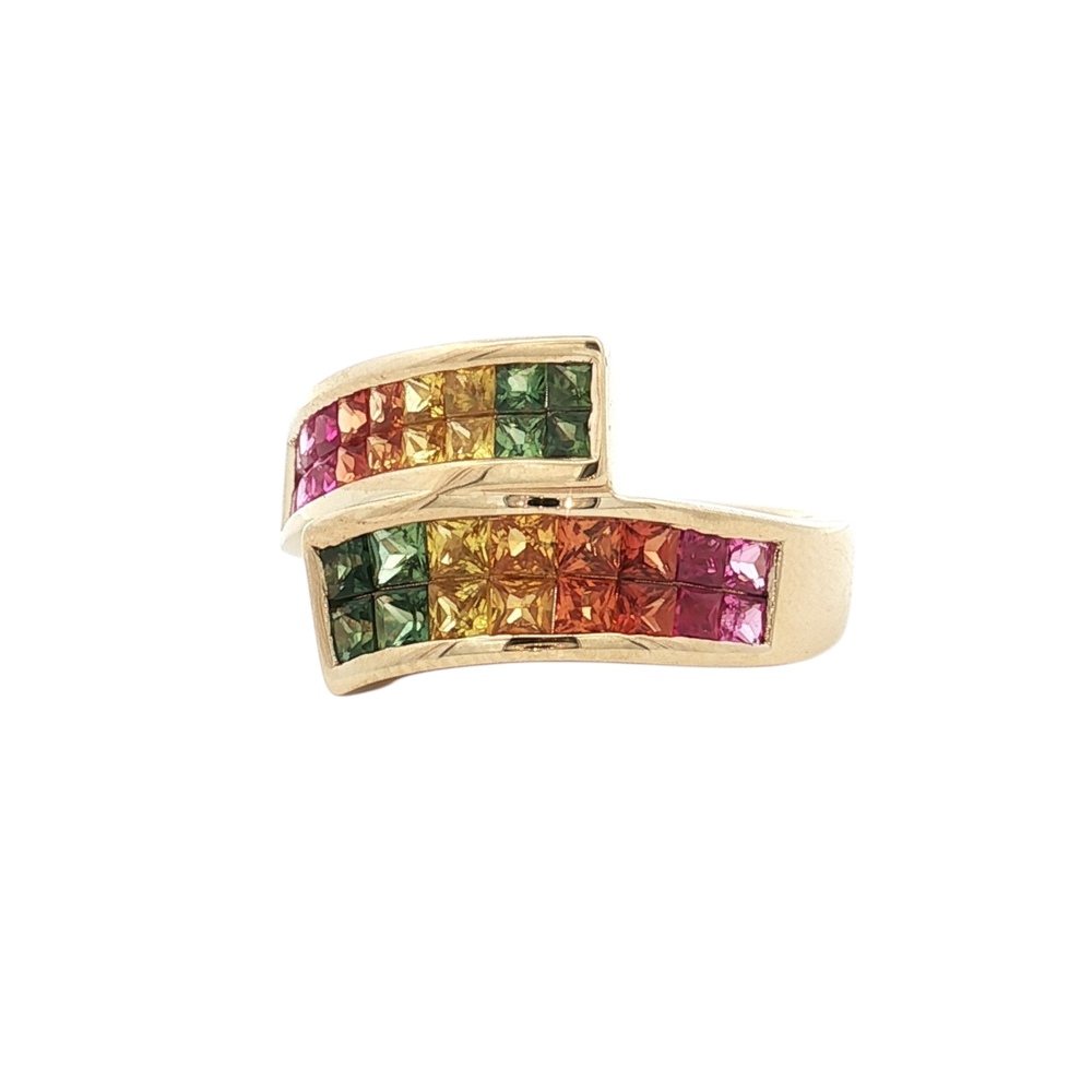 14K Yellow Gold Rainbow Sapphire Princess Gemstones Ring SZ:7