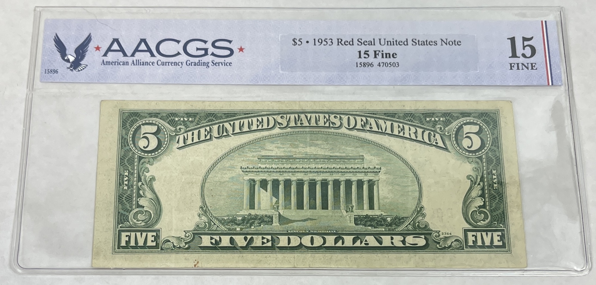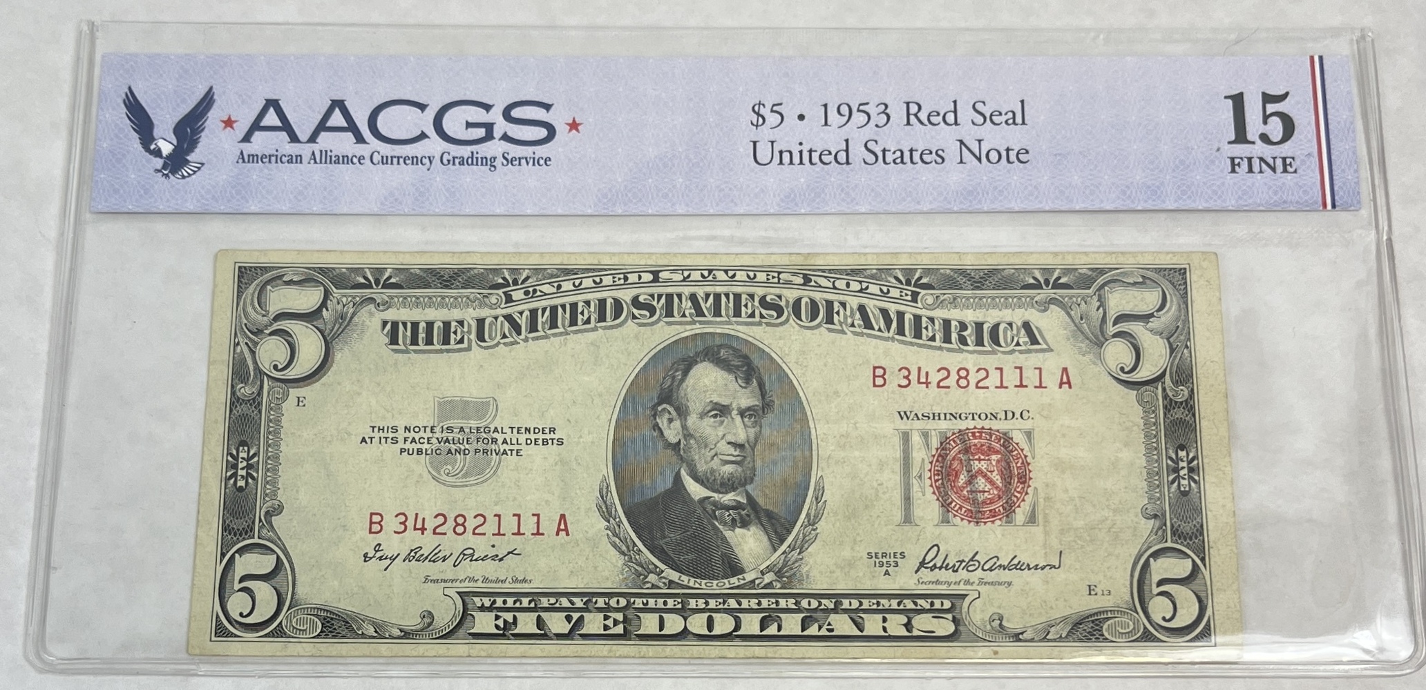 1953 A $5 Bill Red Seal AACGS 15 Fine Graded Bill