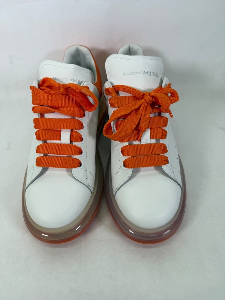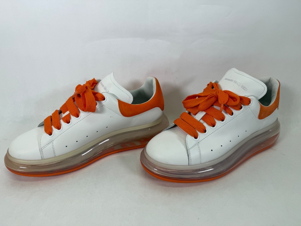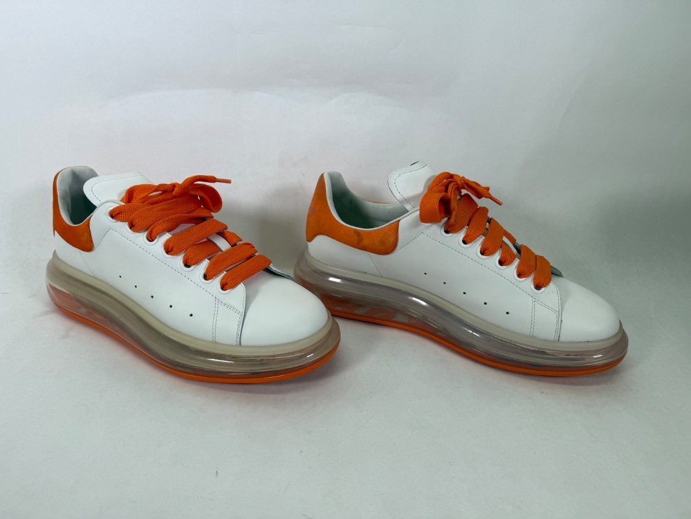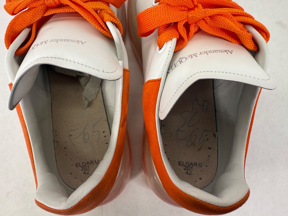 Experience unparalleled comfort and style with this pair of Alexander McQueen Over-sized Sneakers in refreshing orange color. Please note, they come in size 9 but the insoles are missing. Perfect for a casual yet luxury aesthetic.