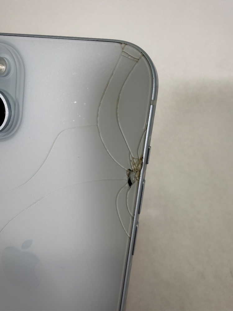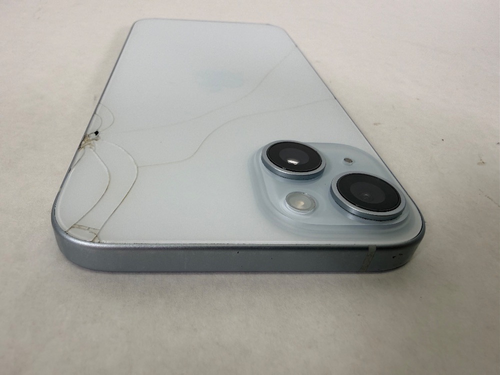 Unlocked 128GB Apple iPhone 15 Plus in blue, featuring advanced technology and user-friendly interface, available at a discounted price due to a cracked back. Ideal for those looking for high-performance functionality without mind cosmetic imperfections.