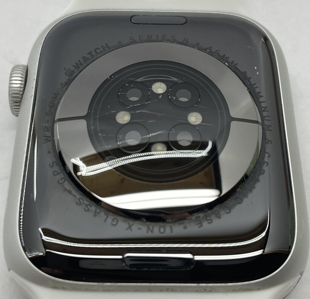 Apple Watch Series 8 (GPS). Tested and functions as intended. There are some scratches on the front and back of the watch face due to previous use. Otherwise in working condition. Featuring an always-on retina display and a strong crack-resistant front crystal. The Series 8 watch has an 18-hour battery life, wrist temperature sensing, low power mode, water resistance, emergency SOS, and international data roaming. 82% Battery Health. 32 GB of Storage. Comes with a charging cord and white wrist band. Check photos for full physical conditions of this product.