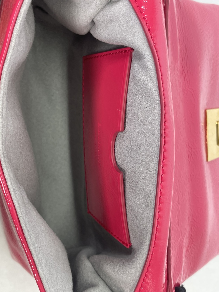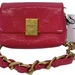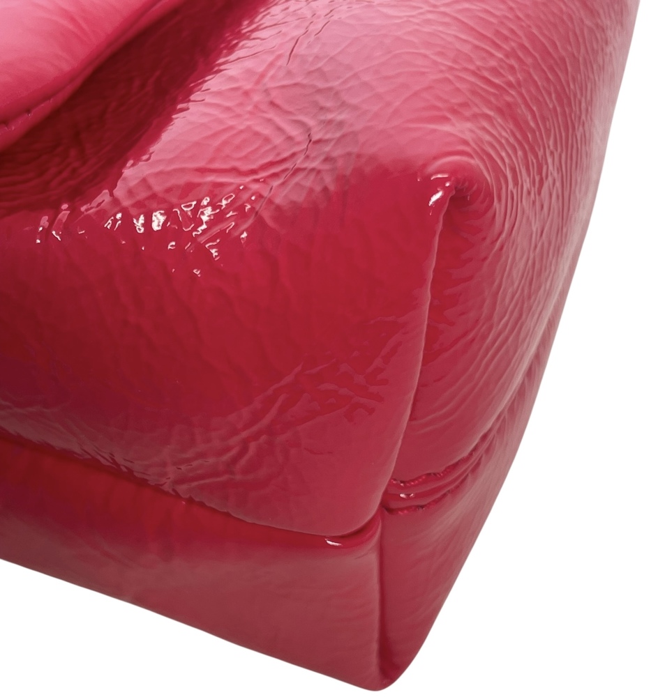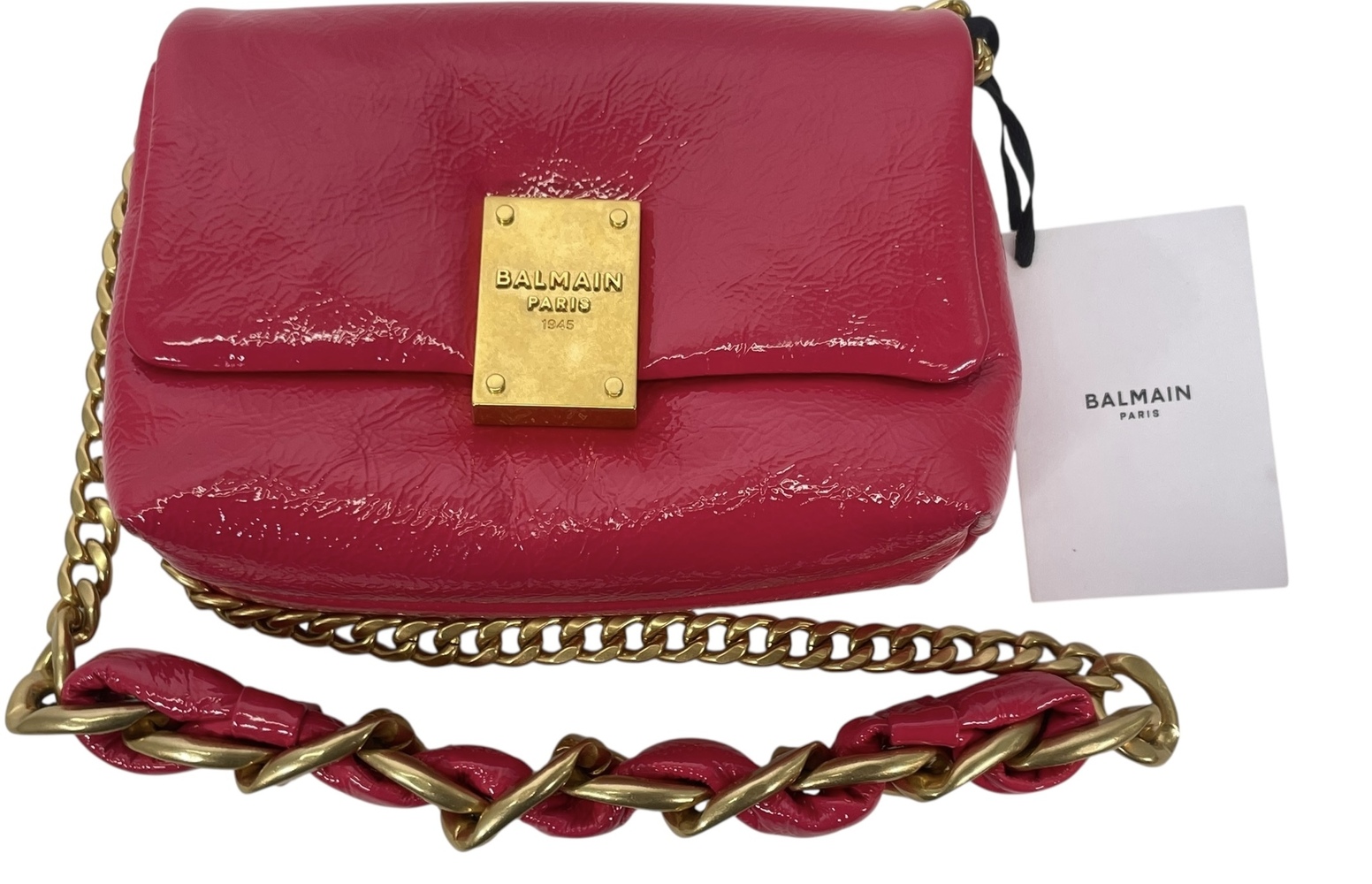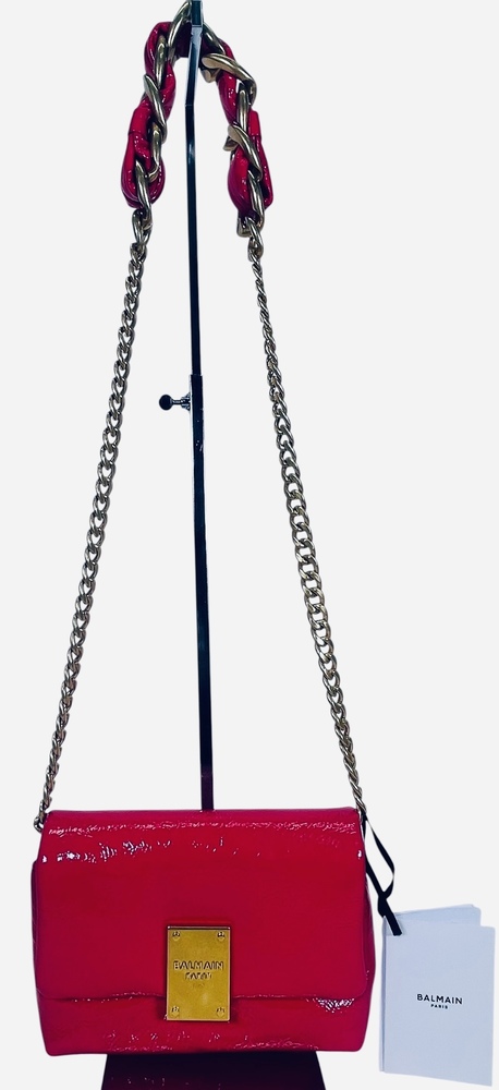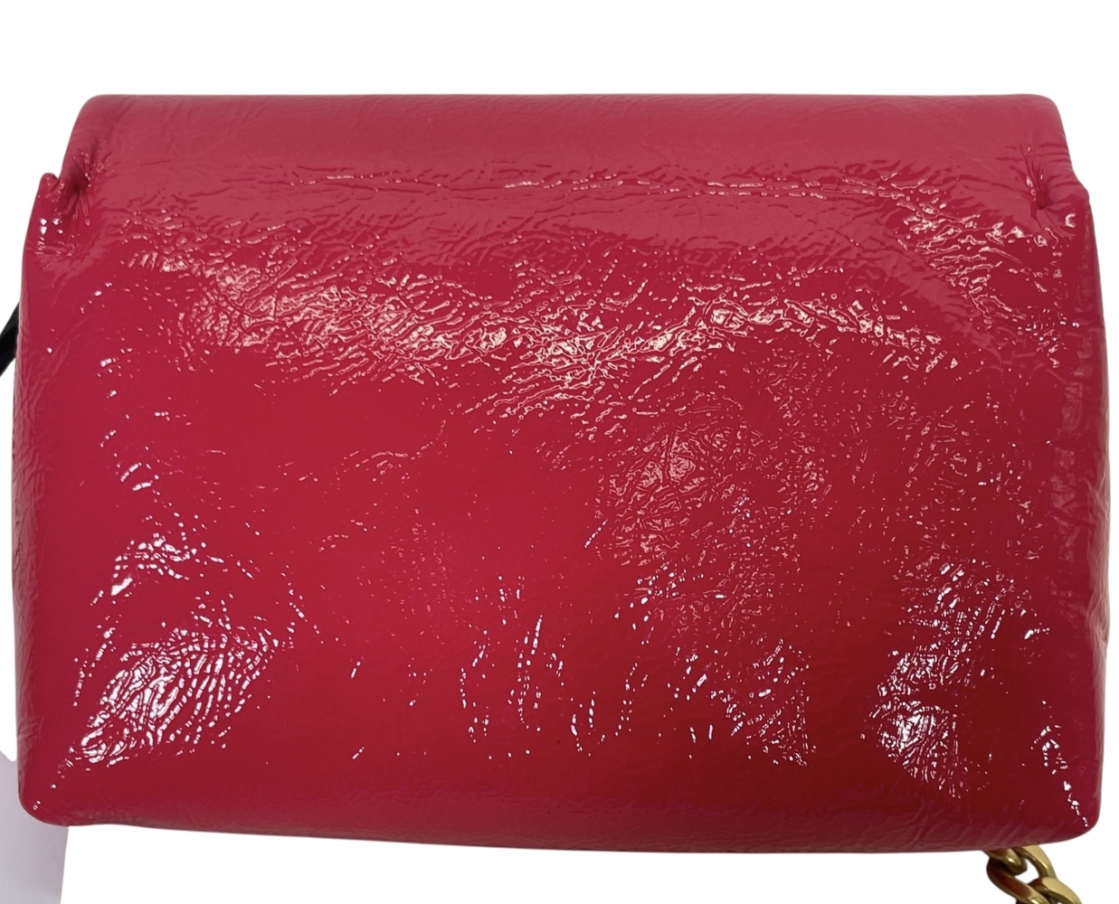 -Fuchsia pink leather patent finish antique-effect hardware gold-tone logo plaque foldover top with magnetic fastening main compartment internal slip pocket embossed internal logo internal card slot leather and chain-link shoulder strap.