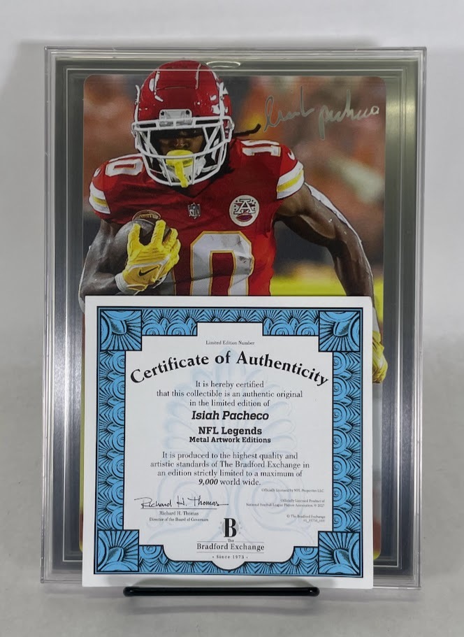 Authentic, limited edition Bradford Exchange NFL Isiah Pacheco memorabilia for sale. Certified well-preserved piece with certification of authenticity. Perfect for collectors and NFL enthusiasts. A must-have for any sports memorabilia collection. Grab this unique piece before it's gone!