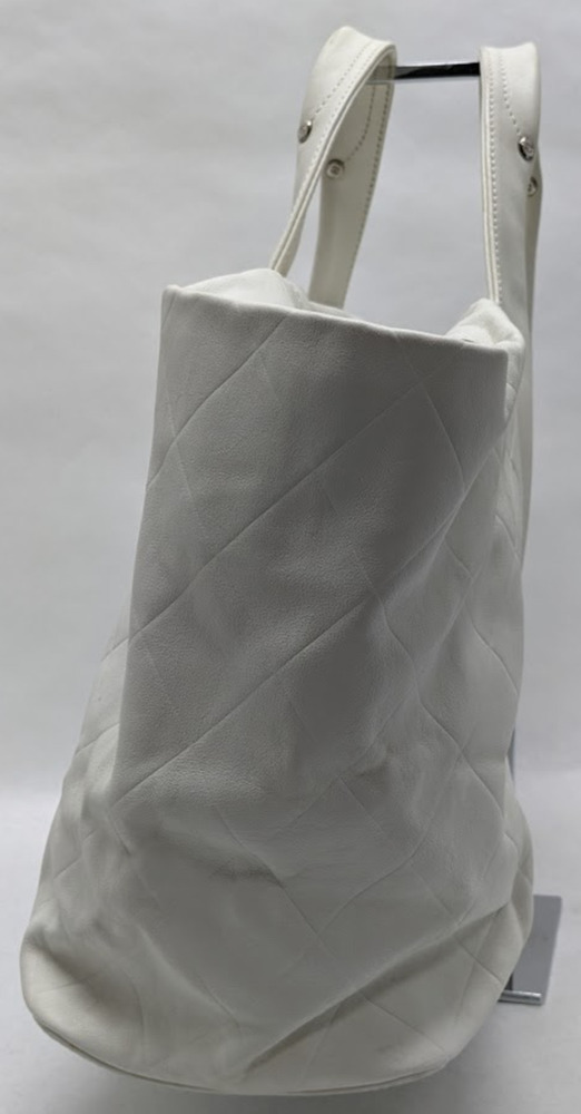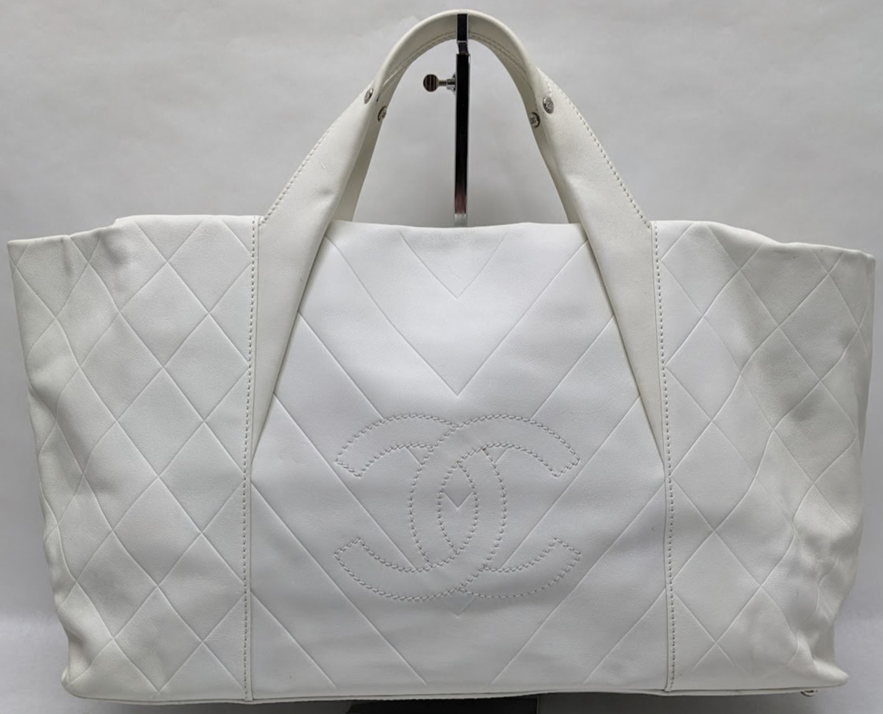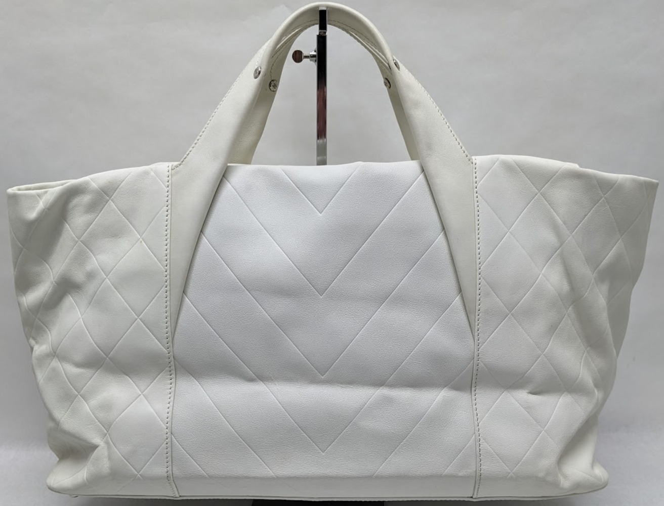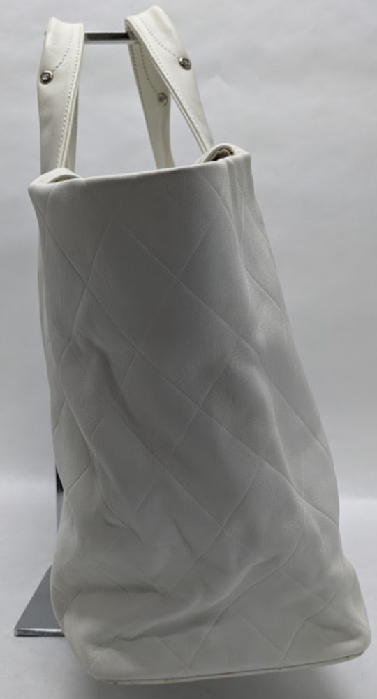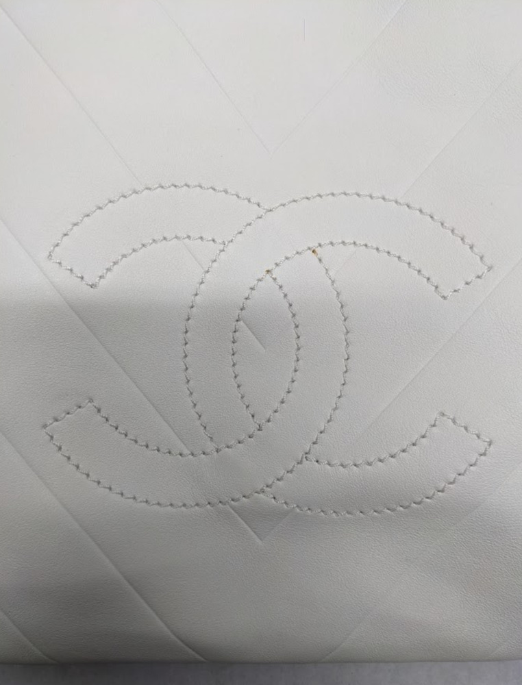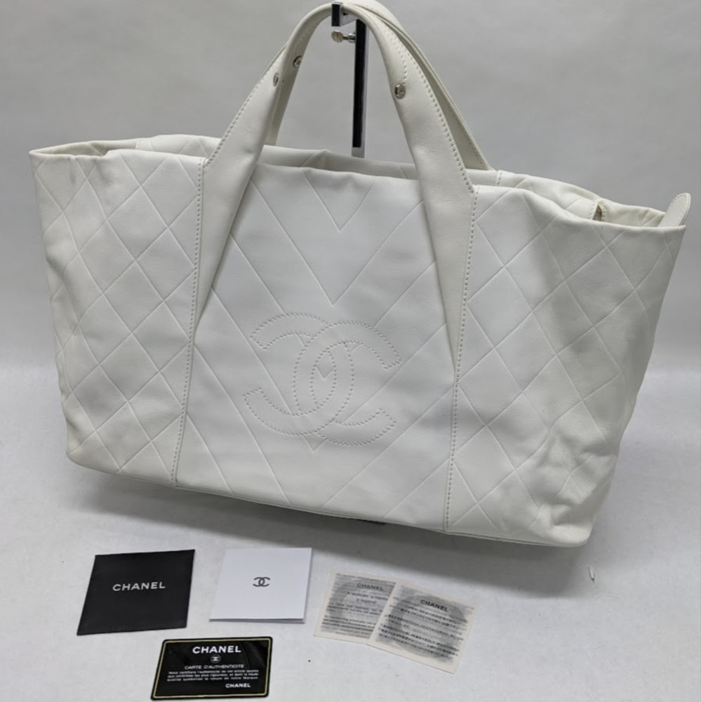 This is an authentic CHANEL Calfskin CC Chevron All Day Long Tote in White. This stylish tote has a unique chevron stitch with a large central embroidered Chanel CC logo in soft calfskin leather in white. This bag features top handles and opens to a fabric interior with a zipper pocket.