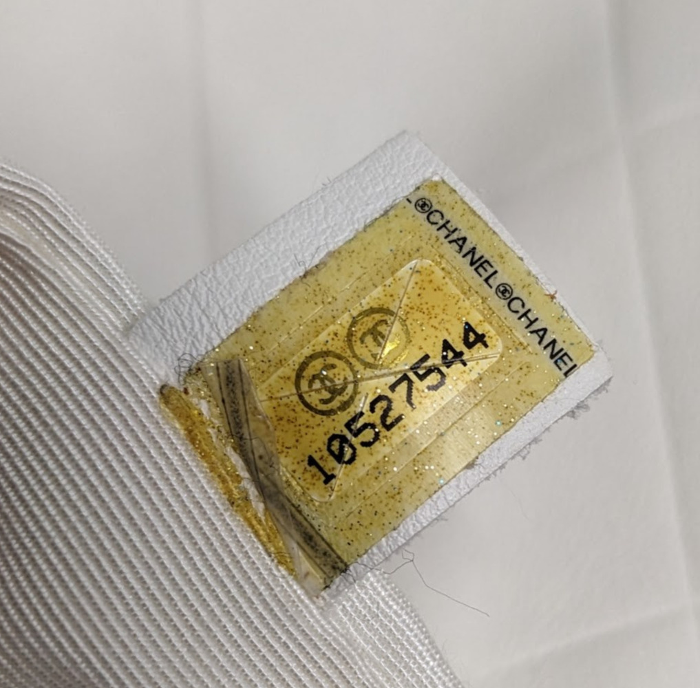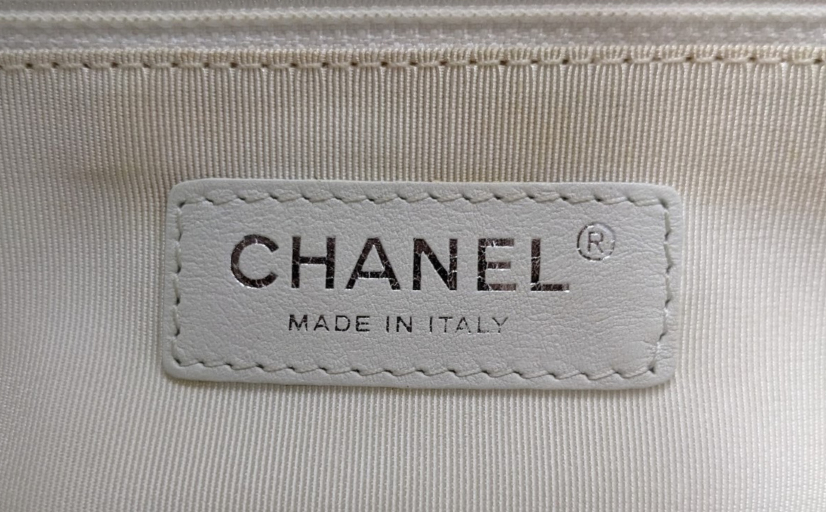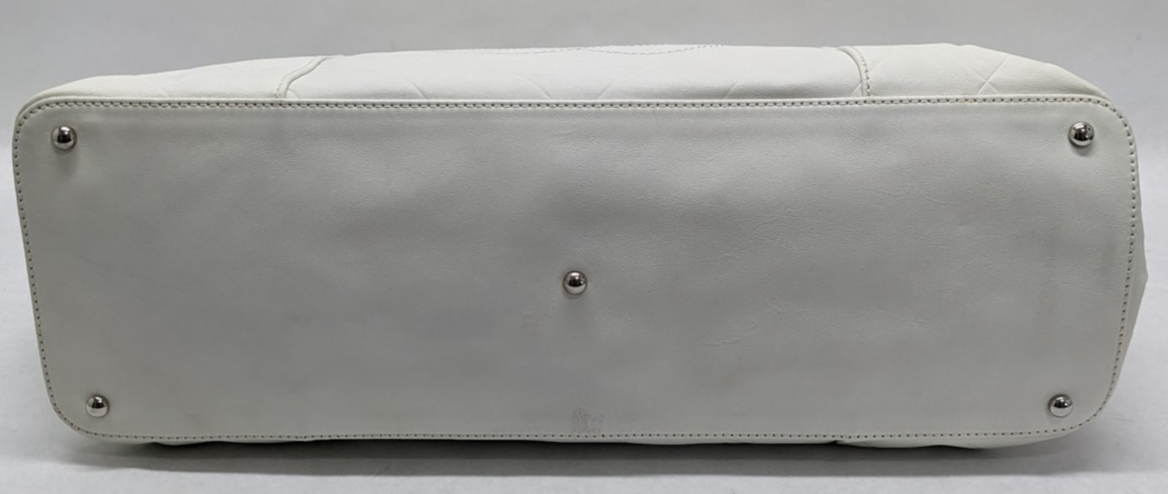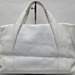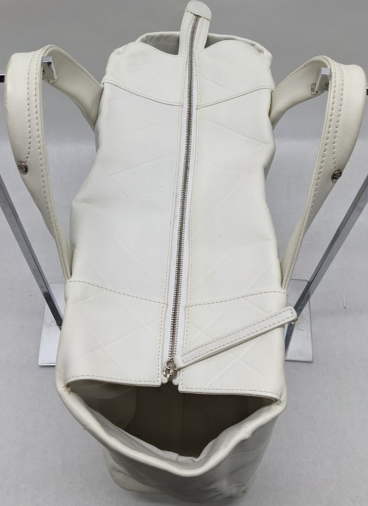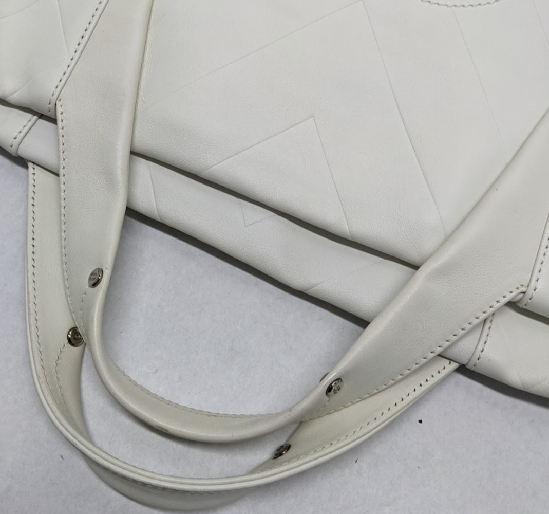 This is an authentic CHANEL Calfskin CC Chevron All Day Long Tote in White. This stylish tote has a unique chevron stitch with a large central embroidered Chanel CC logo in soft calfskin leather in white. This bag features top handles and opens to a fabric interior with a zipper pocket.