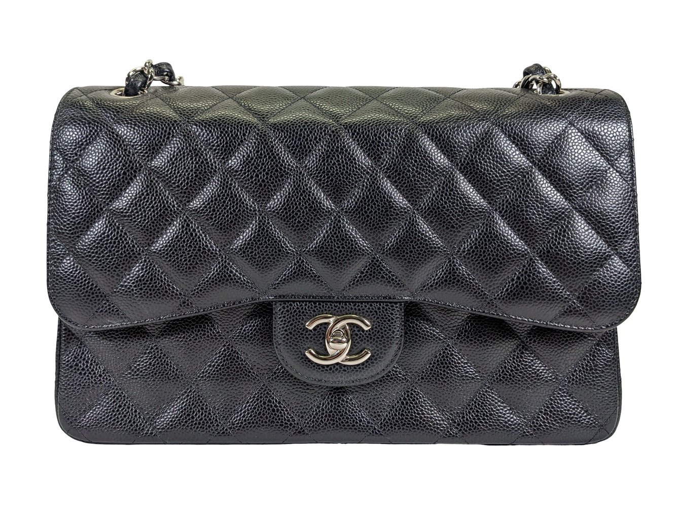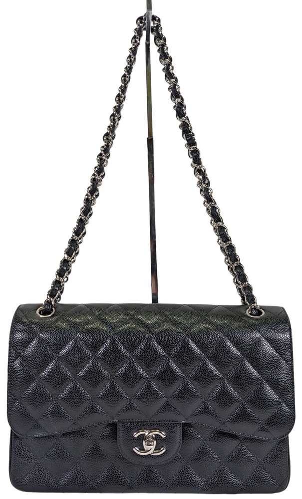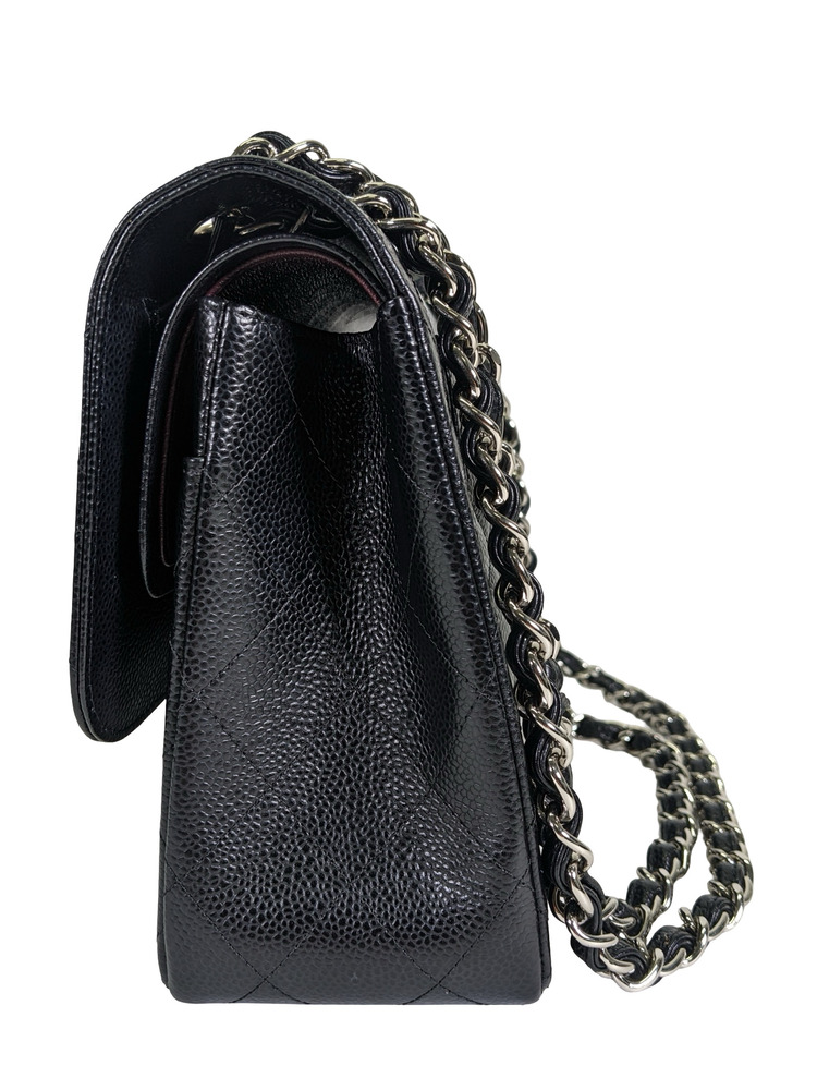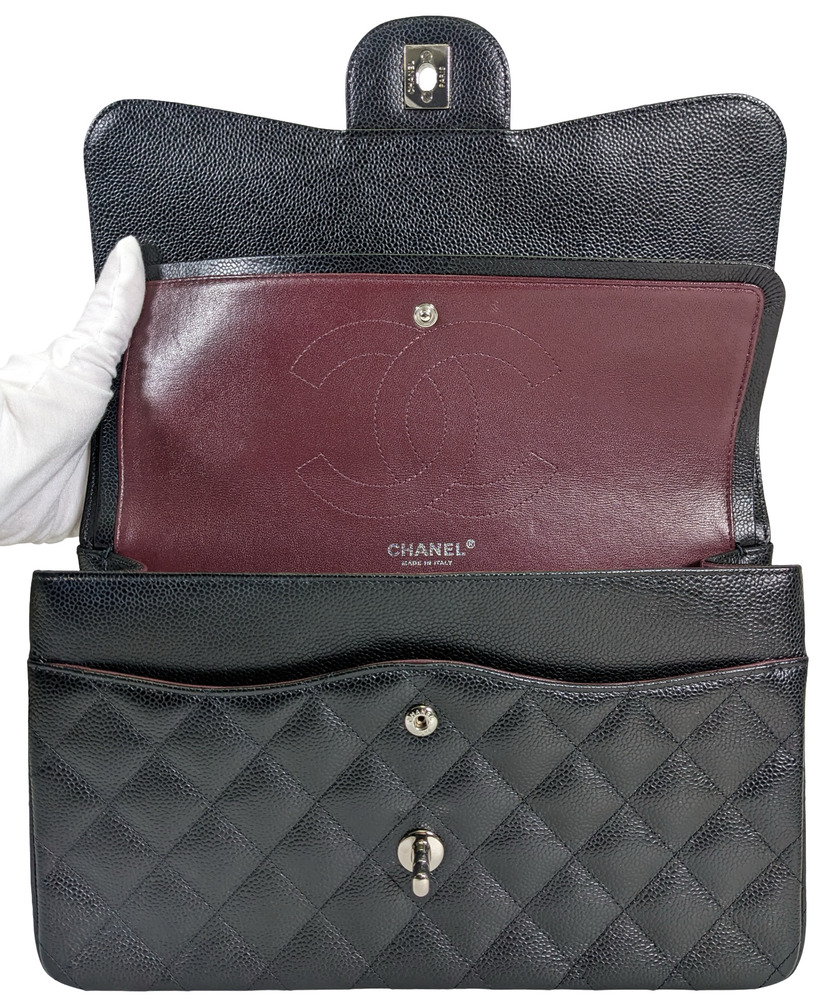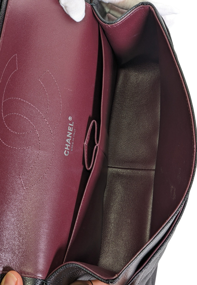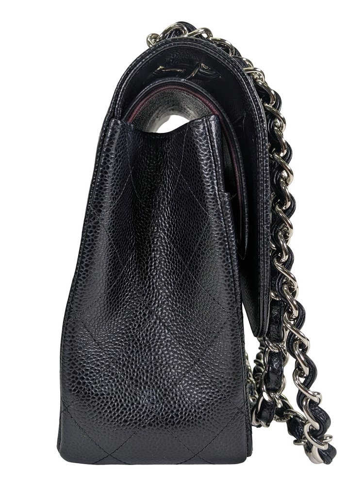 -This is an authentic CHANEL Caviar Quilted Jumbo Double Flap in Black. This stylish shoulder bag is crafted of luxurious caviar textured leather. It features leather threaded polished silver chain link shoulder straps, a rear patch pocket, and a front flap with a CC turn lock. The flap opens to an inner flap and a bordeaux leather interior with patch pockets.