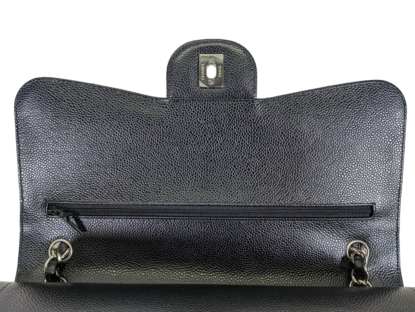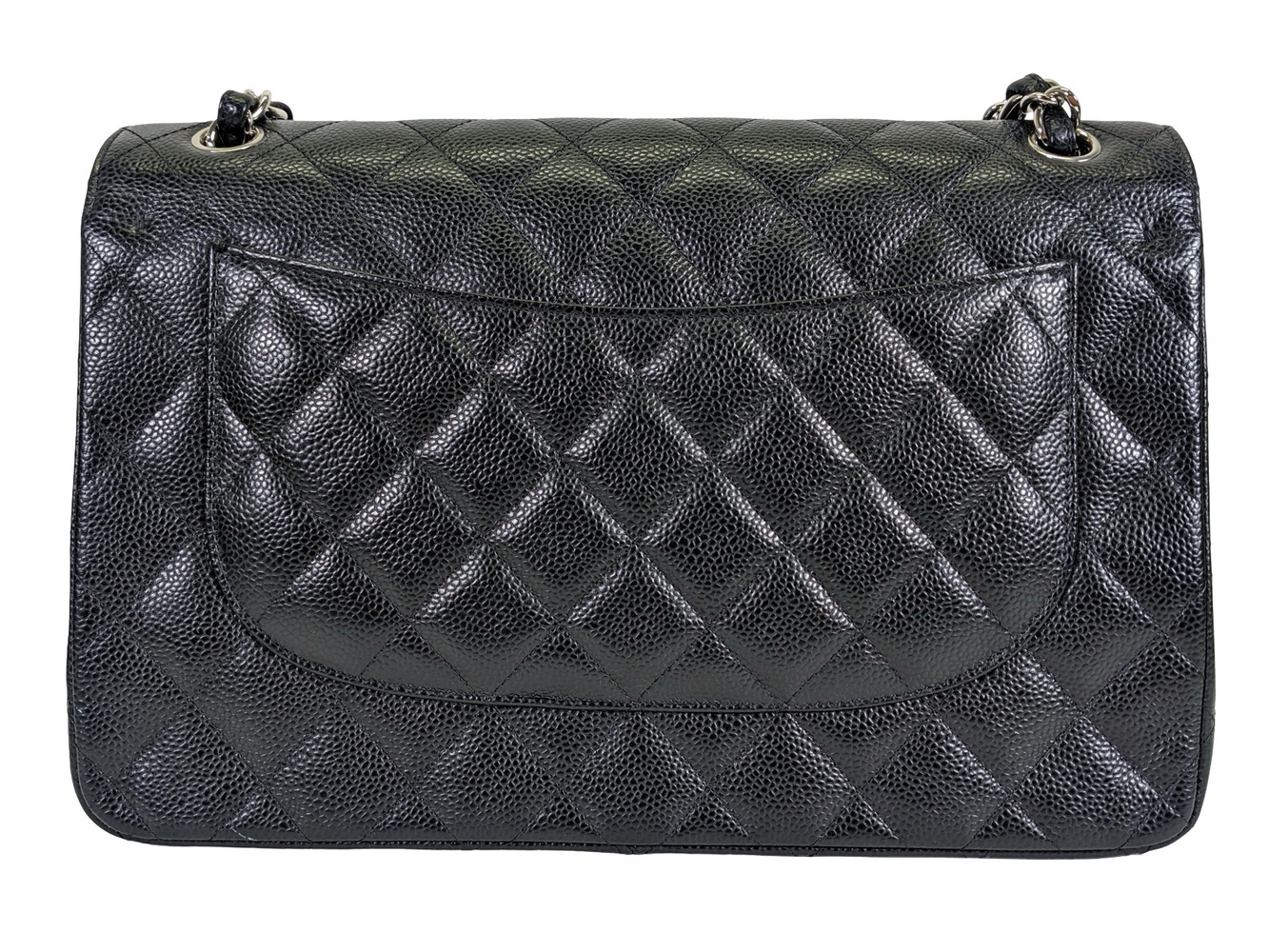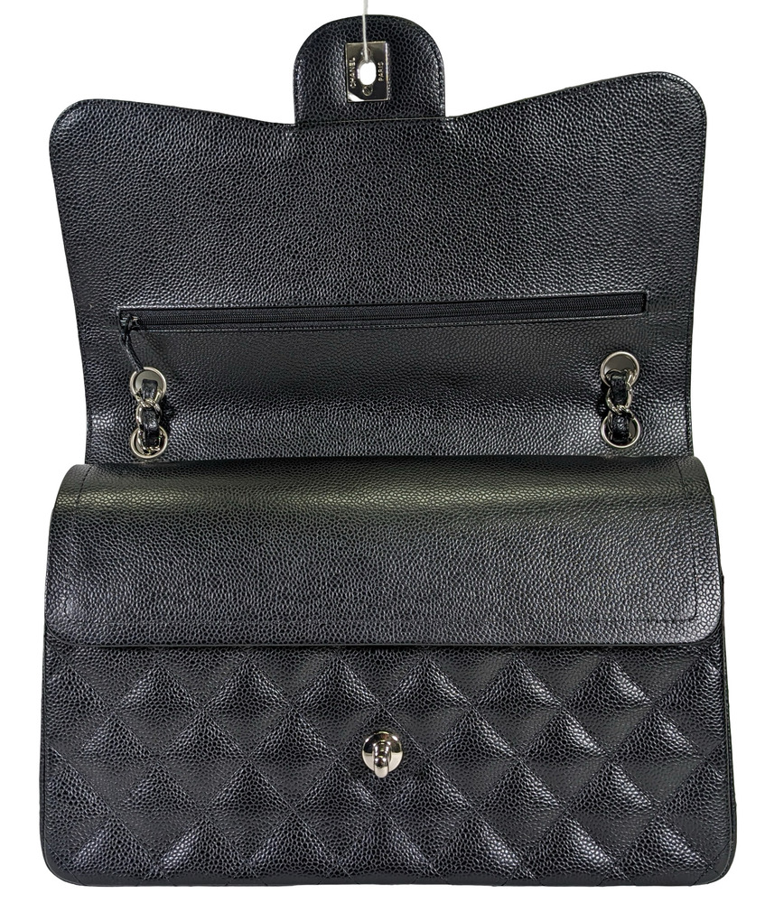-This is an authentic CHANEL Caviar Quilted Jumbo Double Flap in Black. This stylish shoulder bag is crafted of luxurious caviar textured leather. It features leather threaded polished silver chain link shoulder straps, a rear patch pocket, and a front flap with a CC turn lock. The flap opens to an inner flap and a bordeaux leather interior with patch pockets.