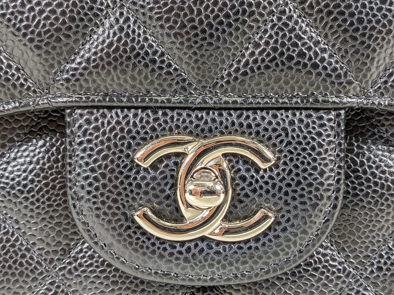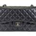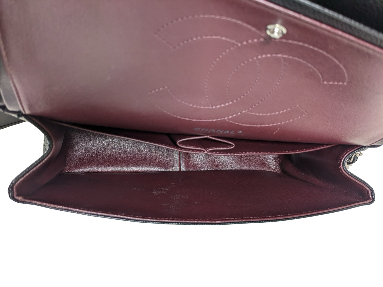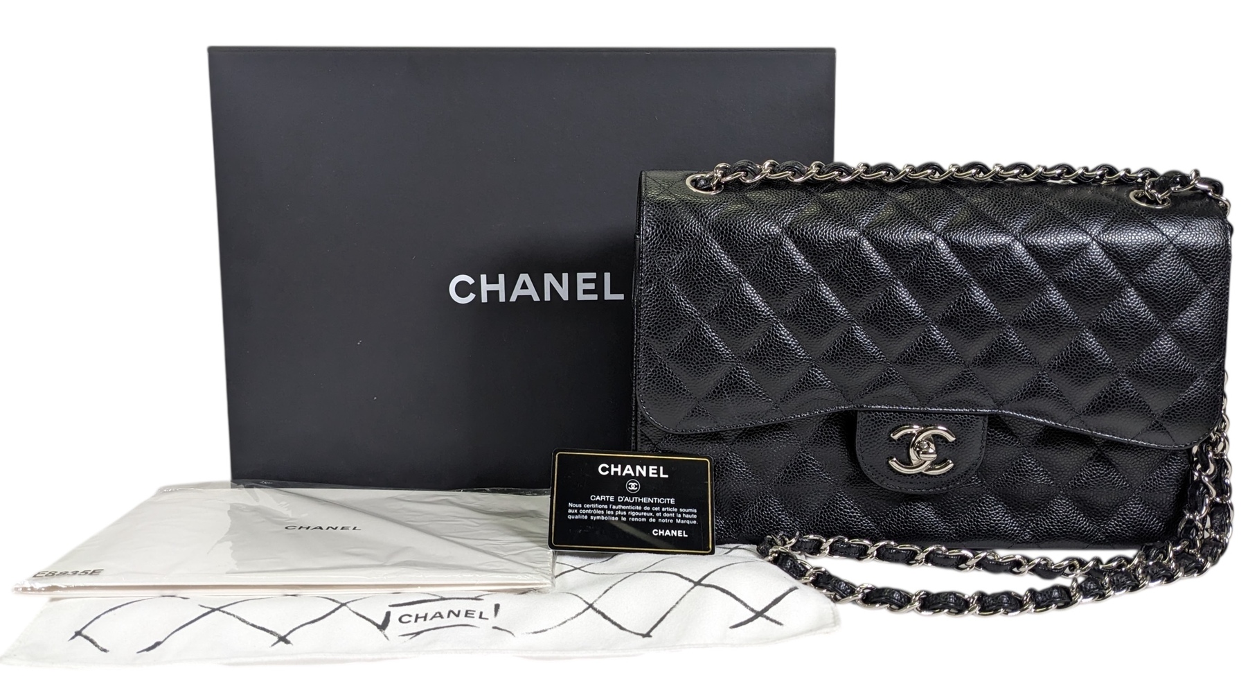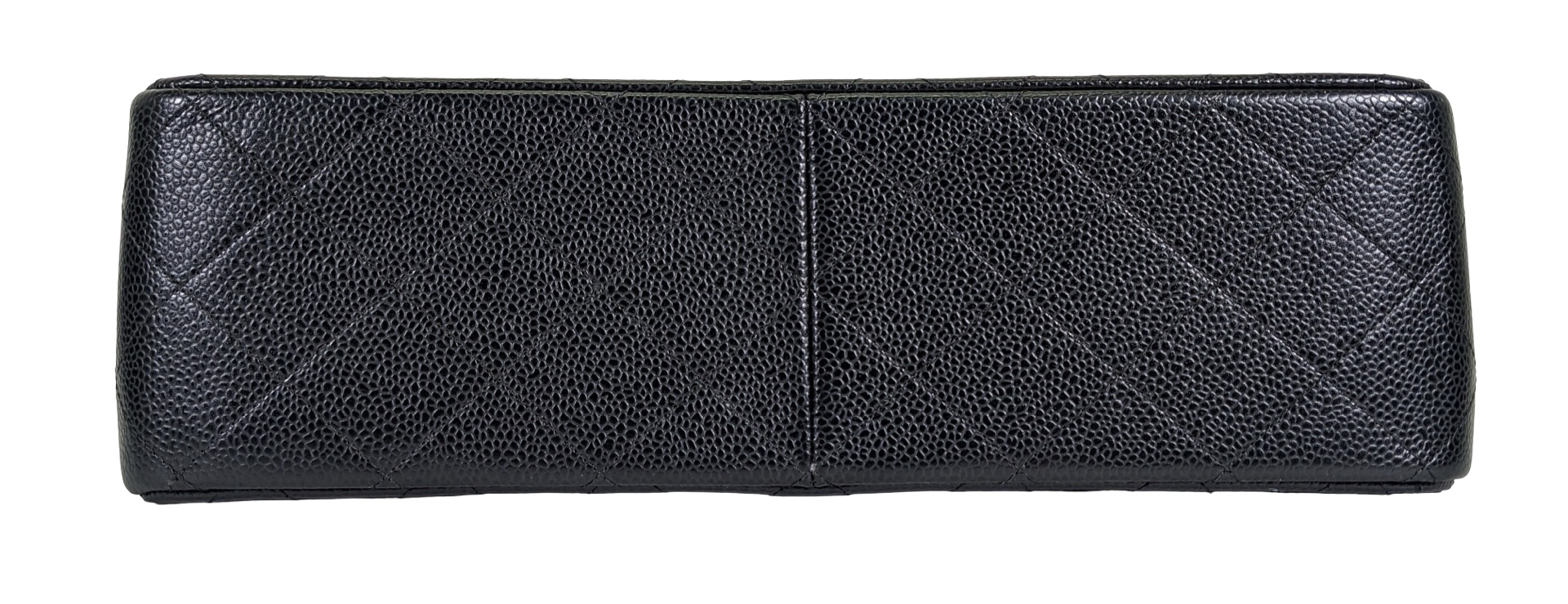 -This is an authentic CHANEL Caviar Quilted Jumbo Double Flap in Black. This stylish shoulder bag is crafted of luxurious caviar textured leather. It features leather threaded polished silver chain link shoulder straps, a rear patch pocket, and a front flap with a CC turn lock. The flap opens to an inner flap and a bordeaux leather interior with patch pockets.