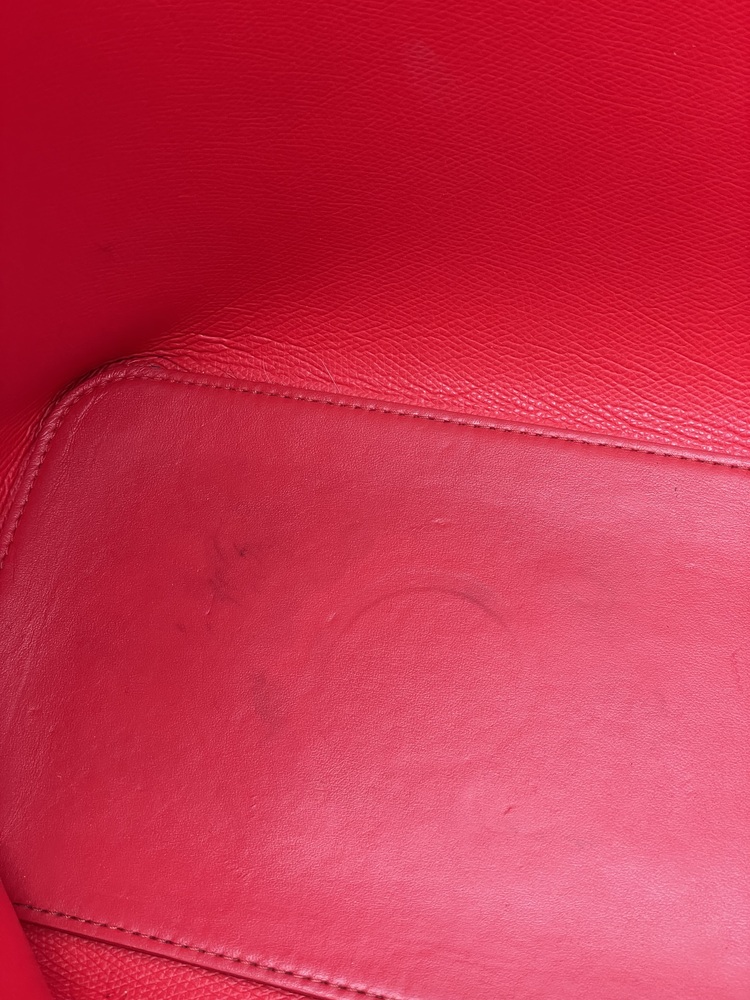 -The bag is in good pre-owned condition showing signs of wear, scratches in the hardware, wear on all four corners, small stains in the interior, and a couple of pencil marks. However, it remains beautiful and functional.