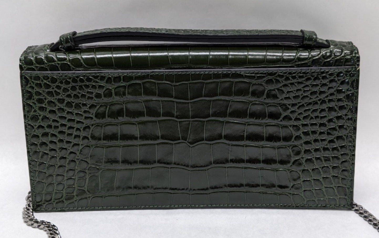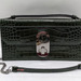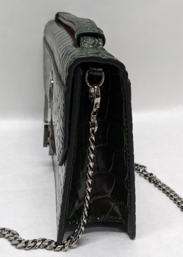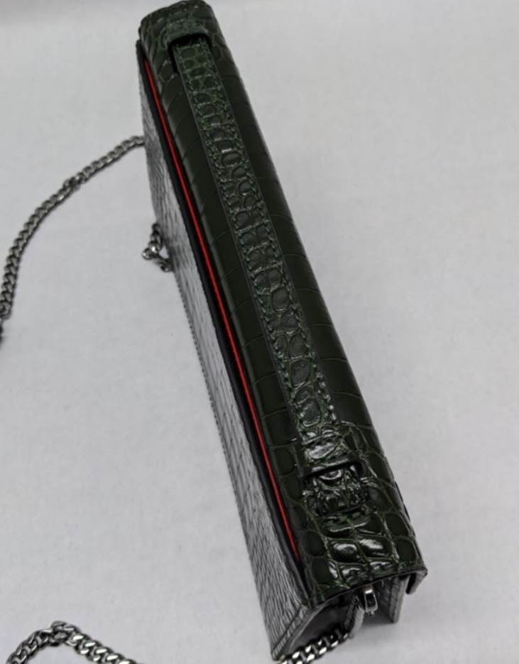 -This is an authentic CHRISTIAN LOUBOUTIN Calfskin Alligator Embossed Elisa Baguette in Black. This chic crossbody bag is beautifully crafted of alligator-embossed calfskin leather in Forest Night. The bag features a rolled leather top handle, an optional, adjustable shoulder strap with Gun metal hardware, and a matching turn-lock on the front. This opens to a red leather interior with a zipper pocket and card slots.