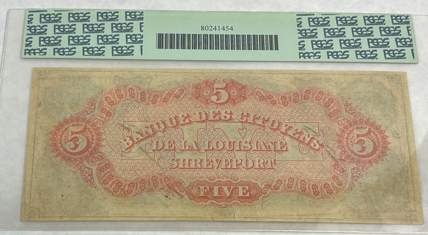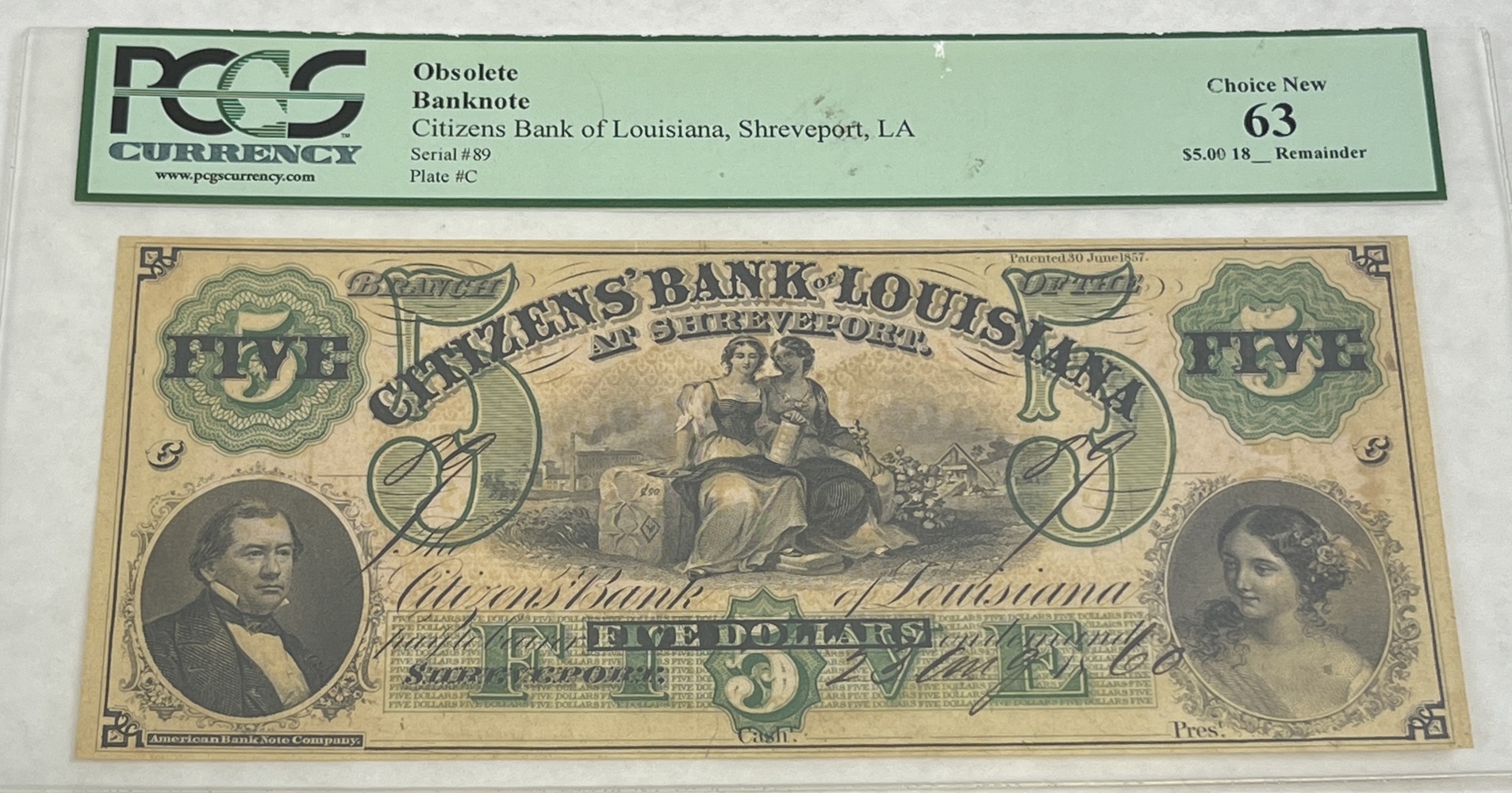 Citizens Bank of Louisiana Shreveport LA $5 Obsolete Banknote PCGS Choice New 63