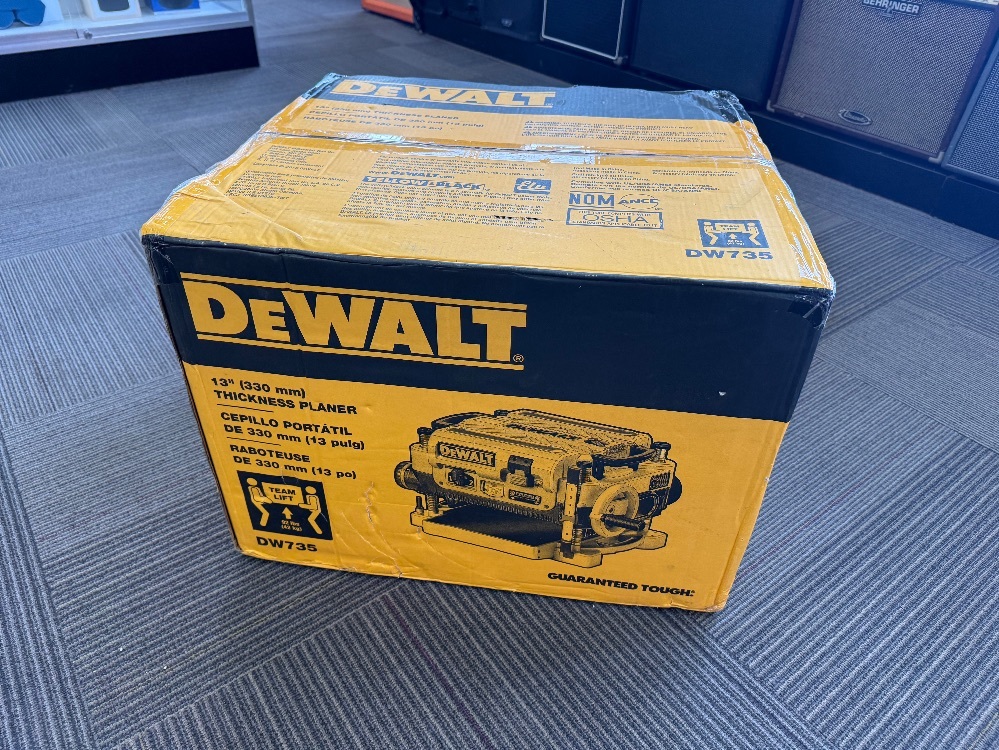 The DeWalt DW735 is a robust, corded 15 Amp planer that delivers precision woodworking with its 13-inch width capacity. Brand new in box! This high-performance tool caters to your intricate woodworking needs efficiently and consistently. Expand your carpentry skills with the reliable and powerful DeWalt planer.