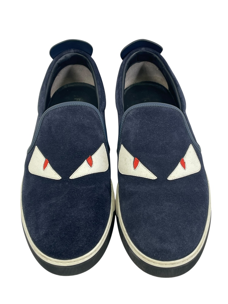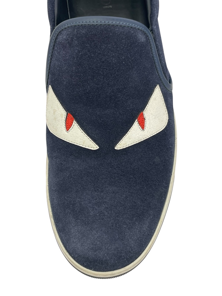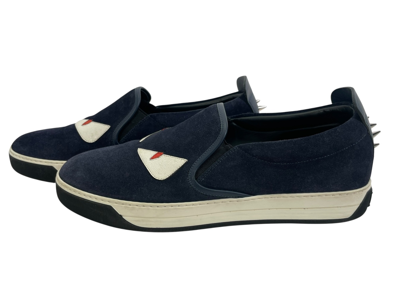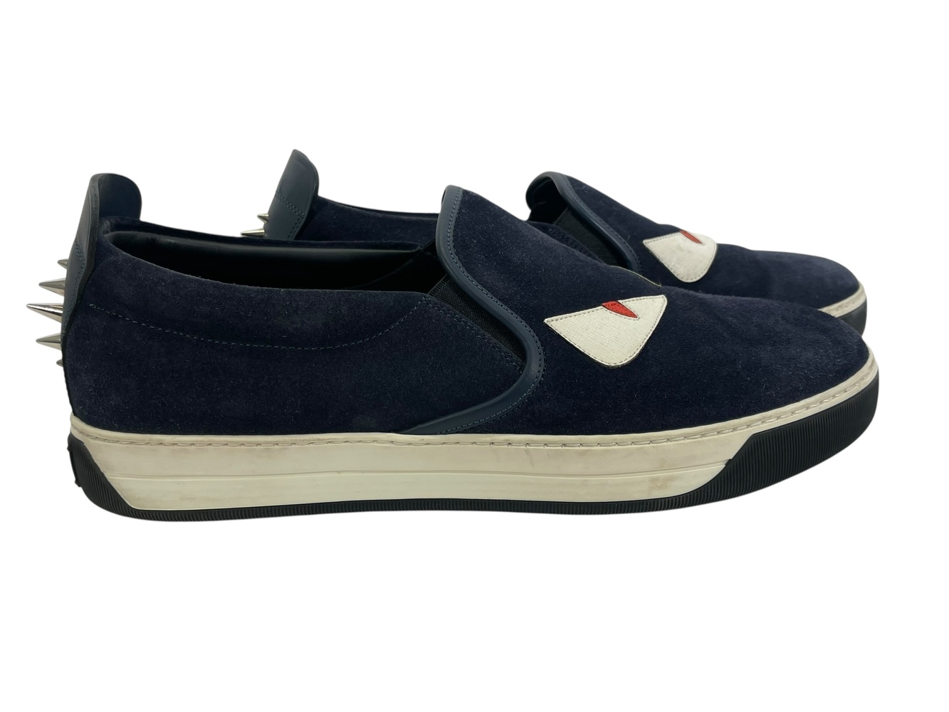-Crafted from suede and leather in navy blue, they feature a playful exterior with the signature monster eyes detailed on the uppers. Adding edge with studded spikes along with the brand's lettering on the rear.