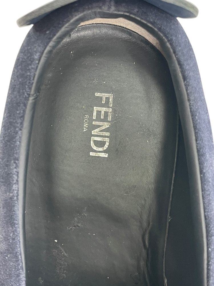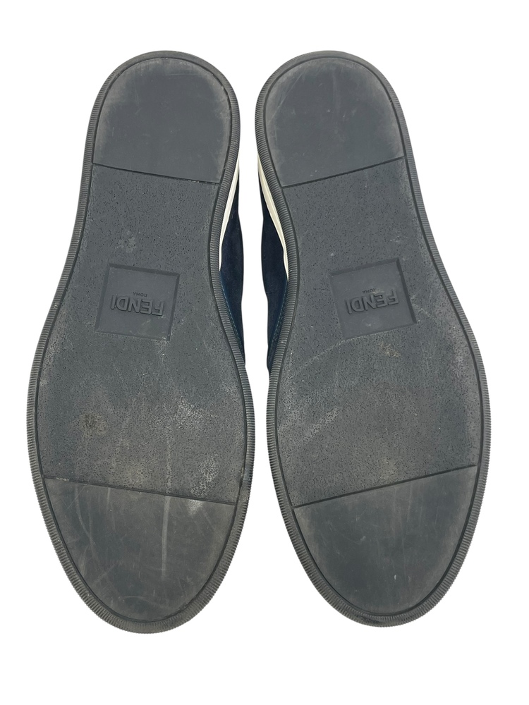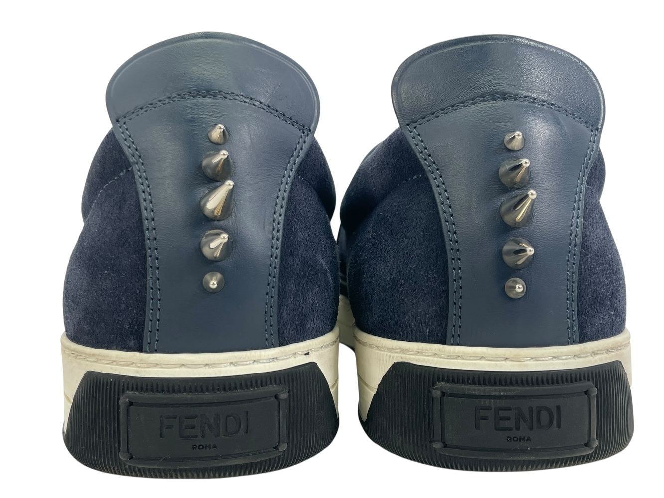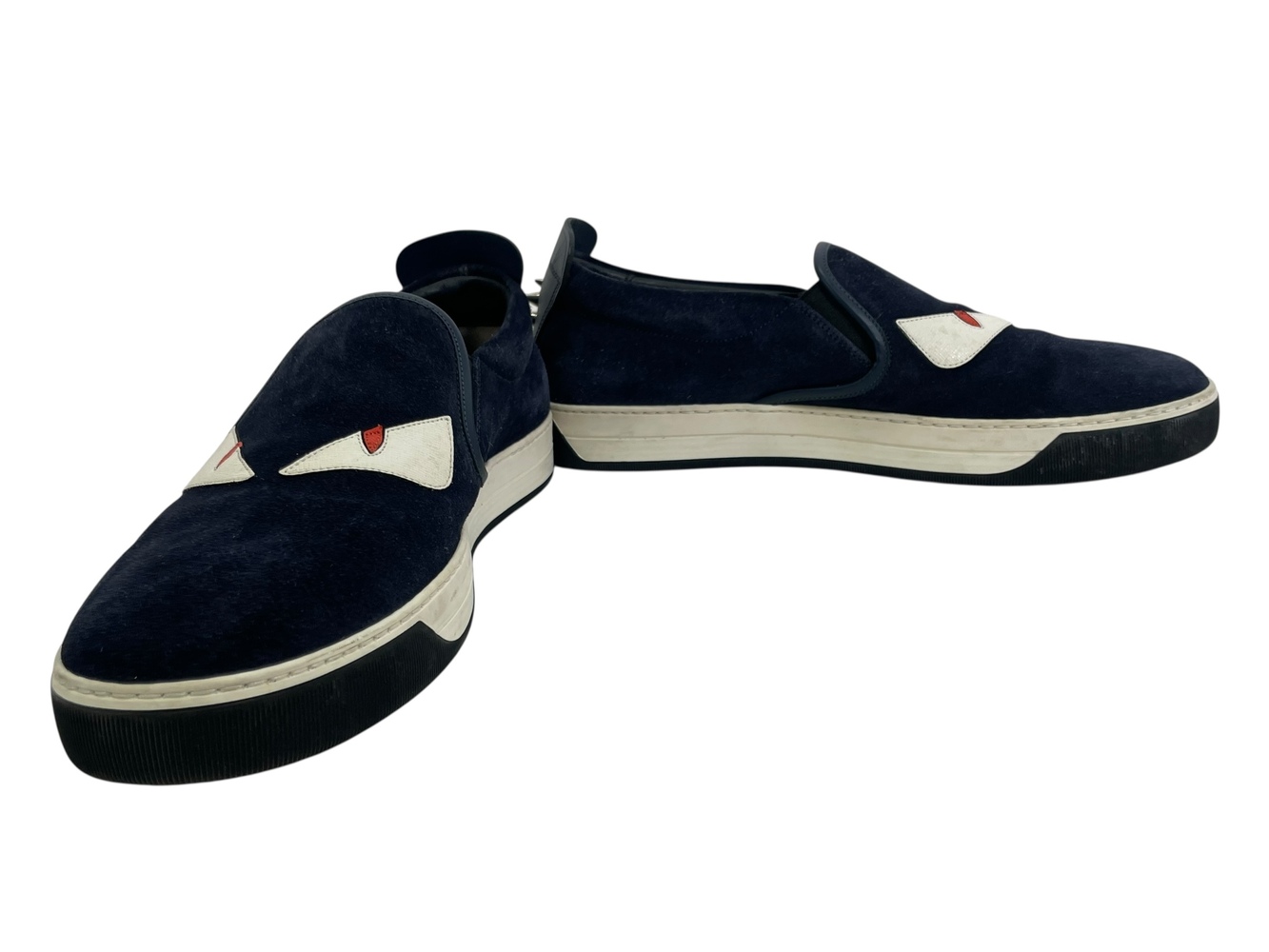 -Crafted from suede and leather in navy blue, they feature a playful exterior with the signature monster eyes detailed on the uppers. Adding edge with studded spikes along with the brand's lettering on the rear.