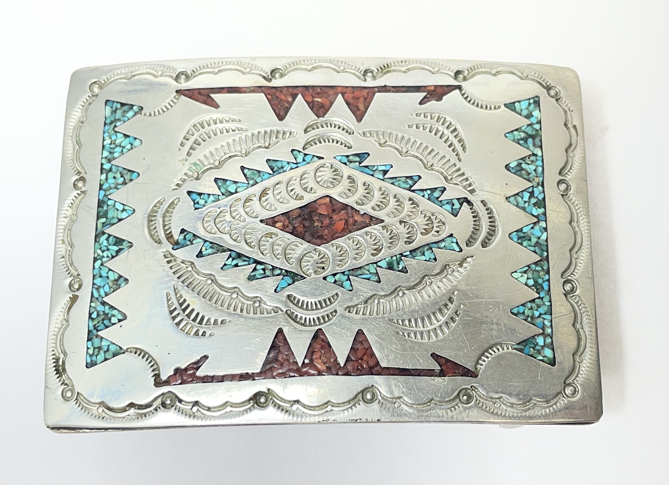 Gilo And Grace Nakai Silver Turquoise & Coral Belt Buckle