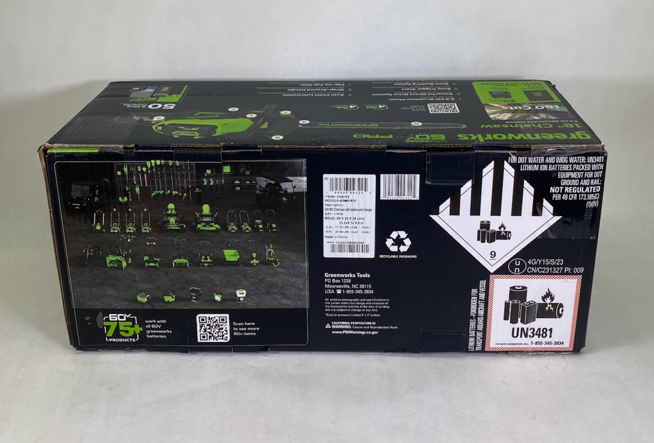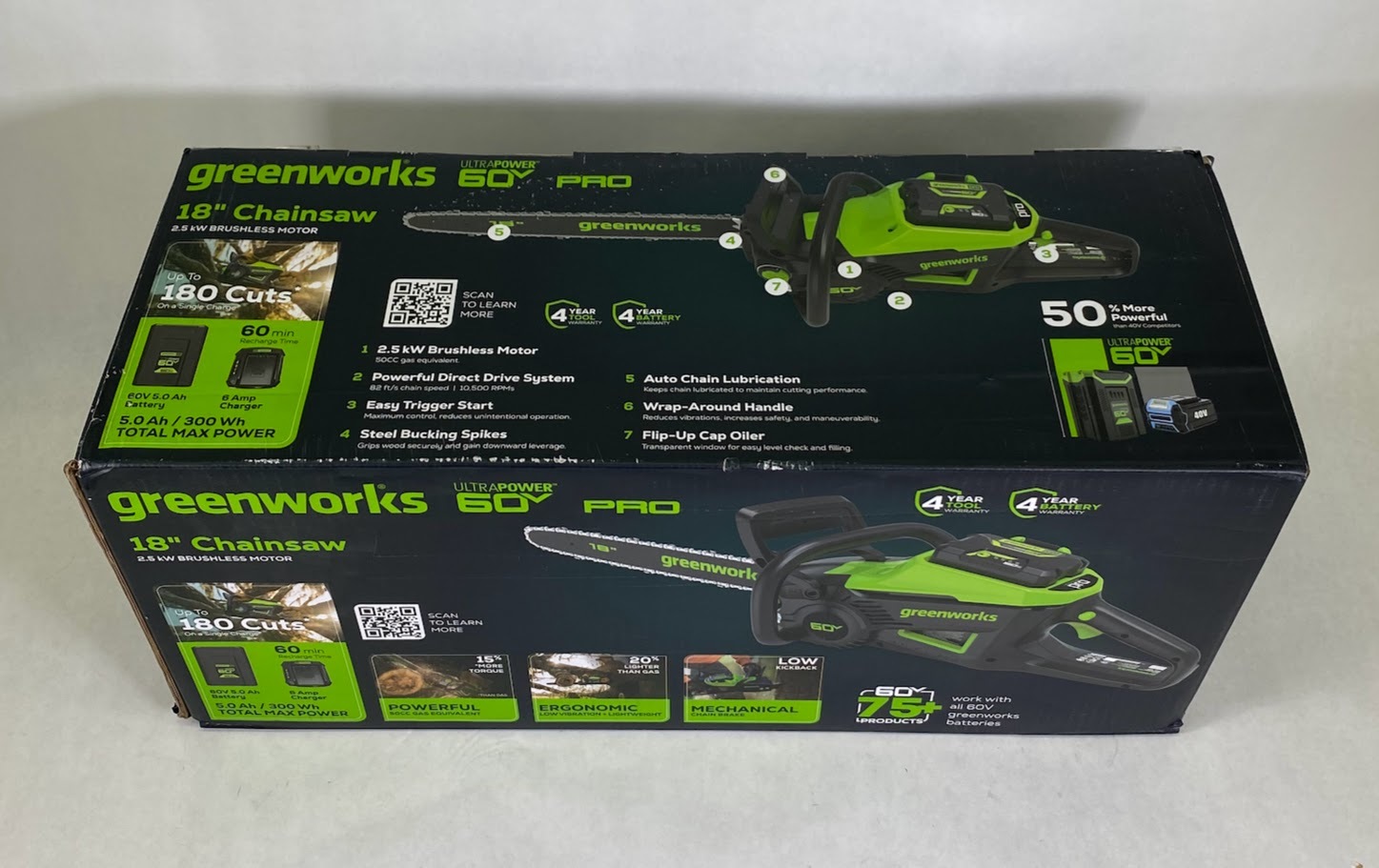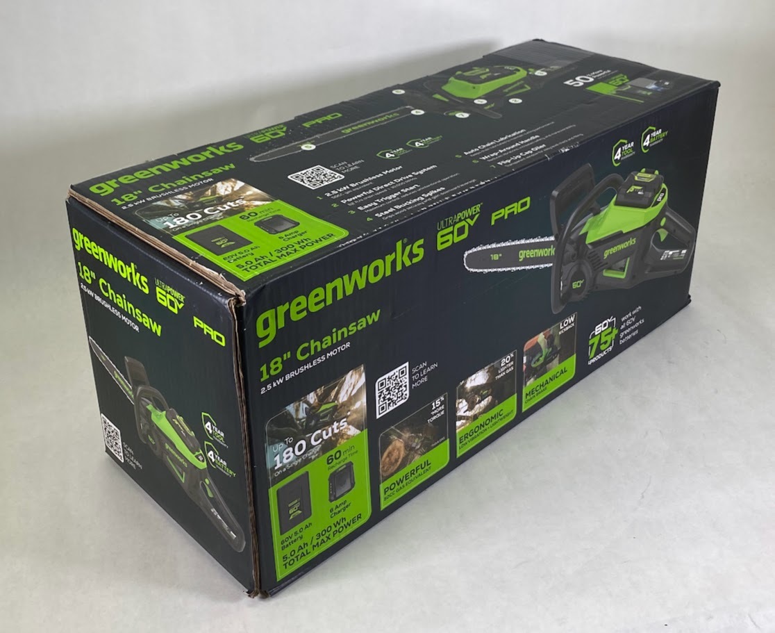 The Greenworks CS60L515 Cordless Chainsaw is ready for sale. Includes Greenworks Cordless Chainsaw with Greenworks 5.0Ah Battery and Rapid Charger. The Greenworks CS60L515 Cordless Chainsaw is New Open Box condition.