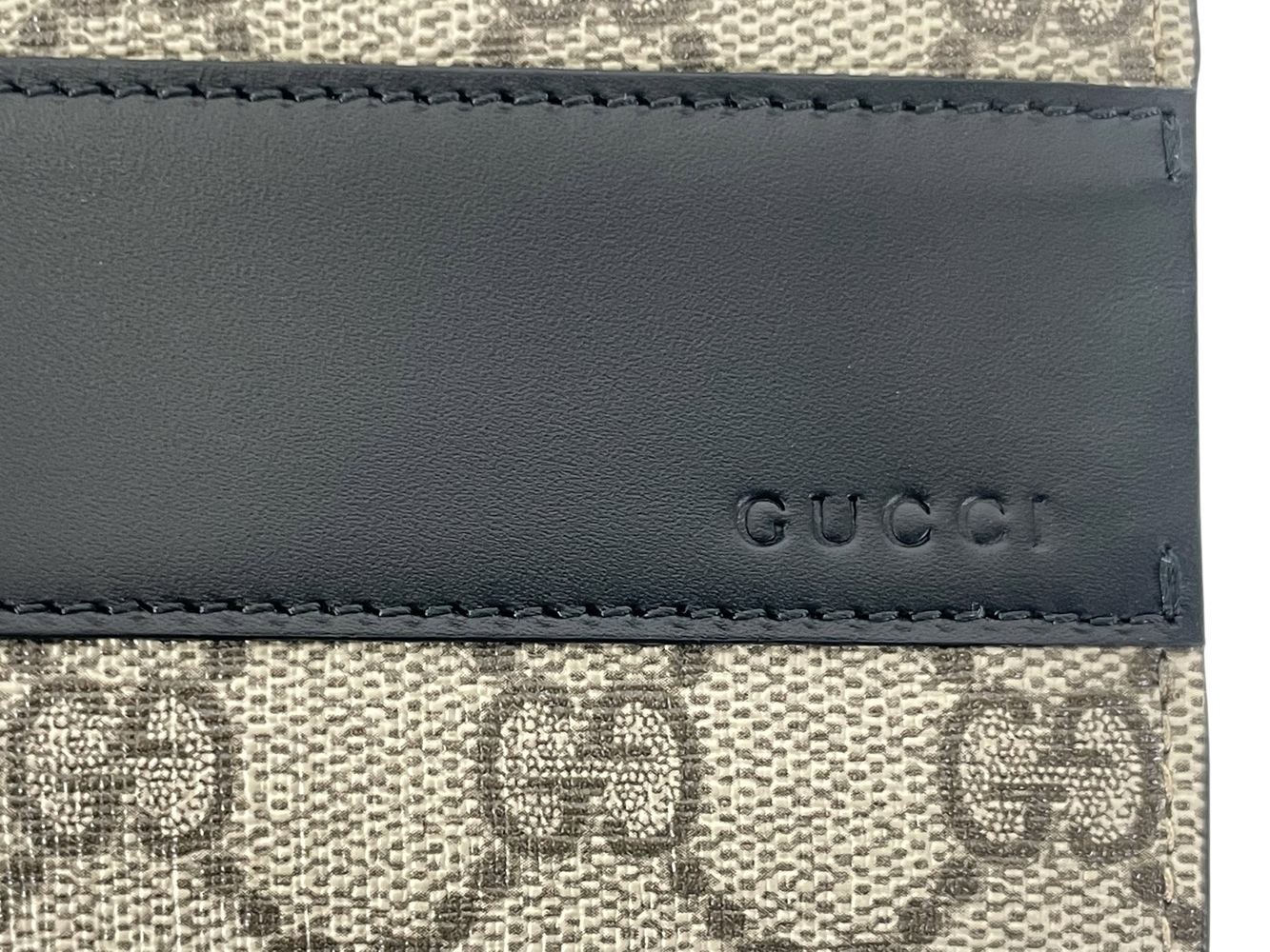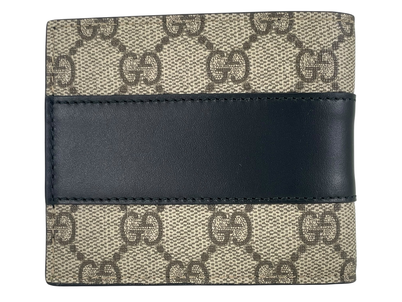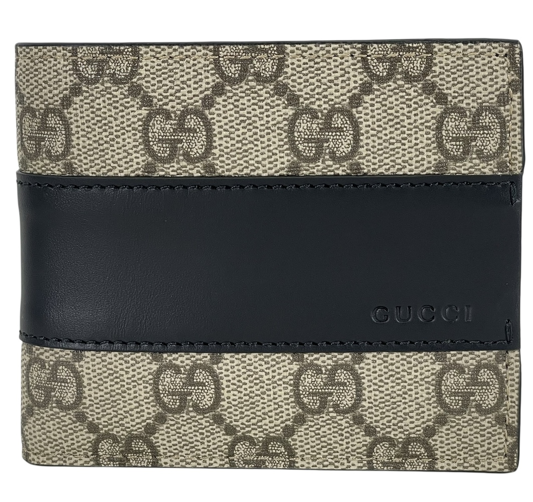 -Gucci Bi-fold wallet featuring the iconic beige GG canvas with black leather trim. The exterior is crafted from durable coated canvas with black leather trim. the exterior is crafted from durable coated canvas with a bold leather stripe and subtle embossed Gucci logo, inside, you'll find multiple card slot and a bill compartment, perfect for organizing your daily necessities.