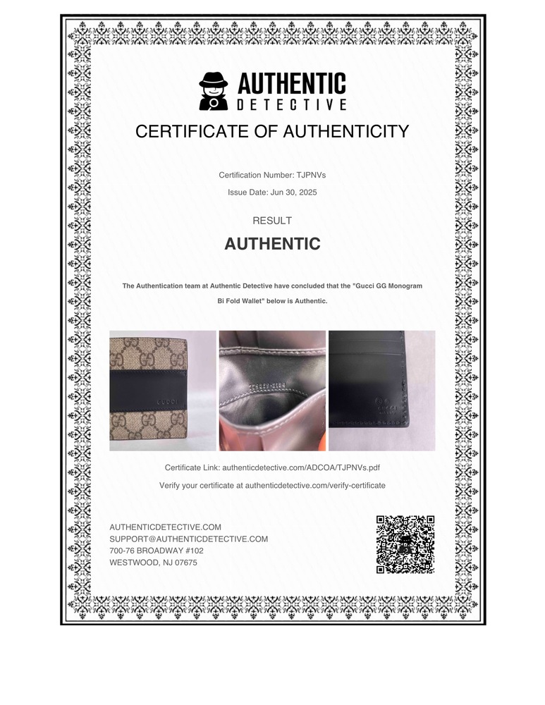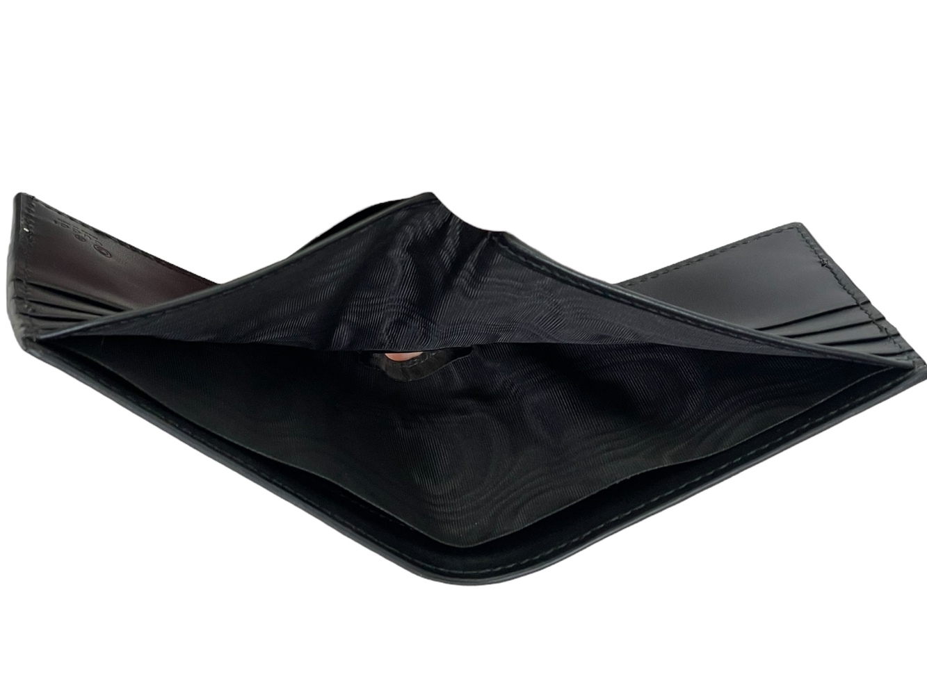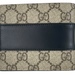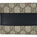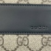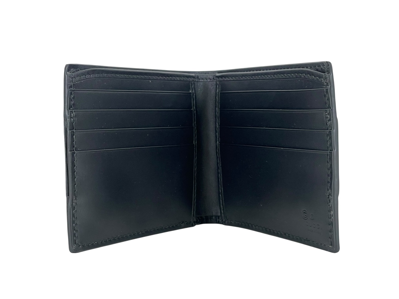 -Gucci Bi-fold wallet featuring the iconic beige GG canvas with black leather trim. The exterior is crafted from durable coated canvas with black leather trim. the exterior is crafted from durable coated canvas with a bold leather stripe and subtle embossed Gucci logo, inside, you'll find multiple card slot and a bill compartment, perfect for organizing your daily necessities.