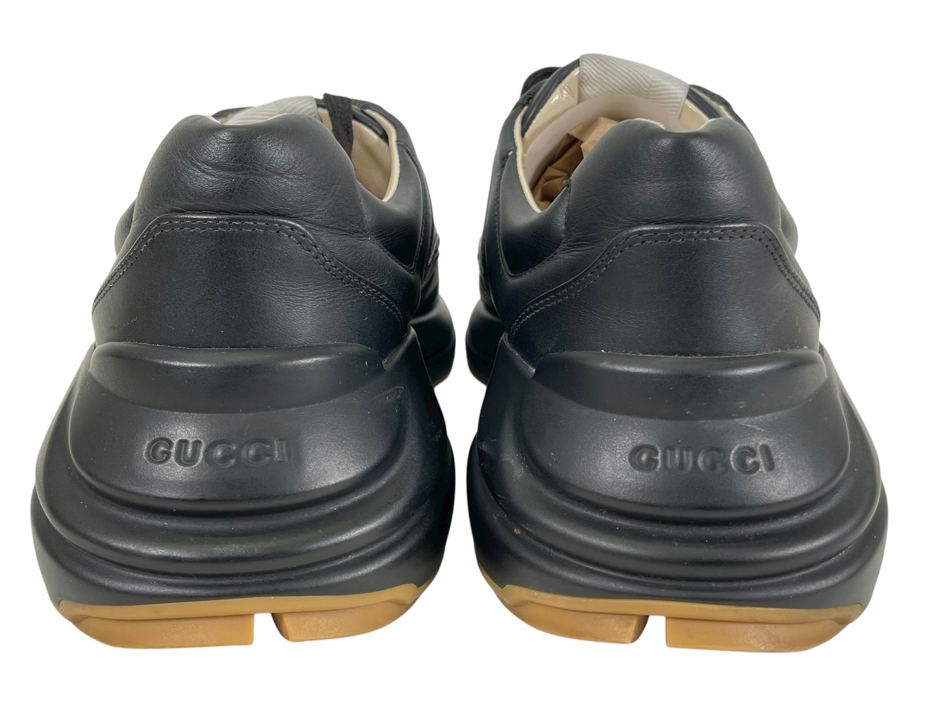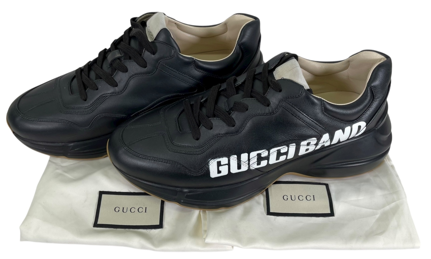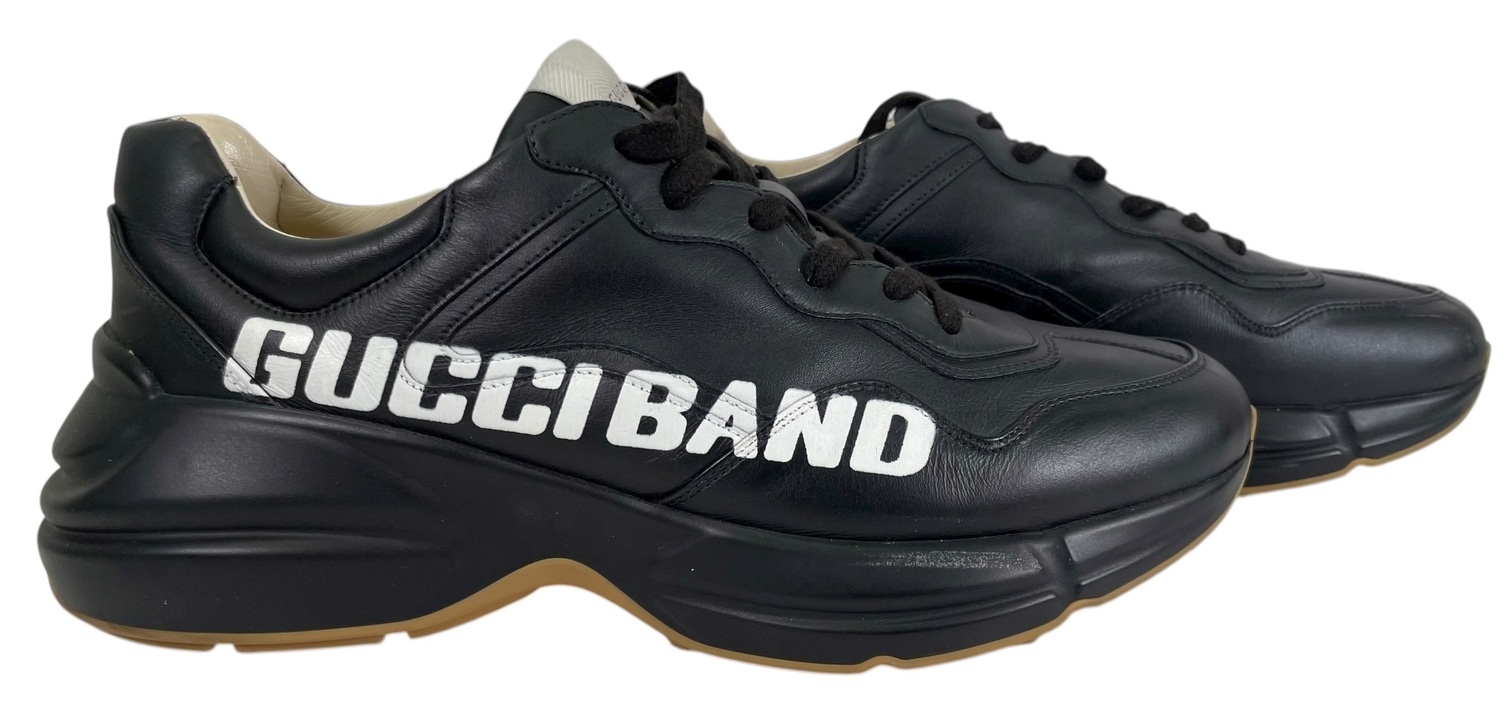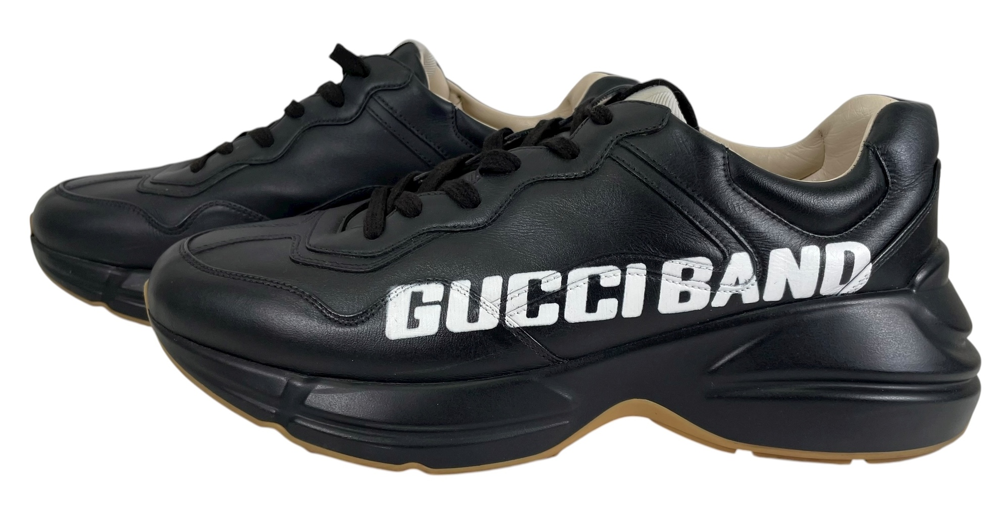 -This Gucci Rhython sneaker in men's US size 10.5 features a bold Gucci Band print, adding a modern twist to your classic sneaker. Designed in Italy, it provides a vintage feel with chunky rubber sole. Limited edition.