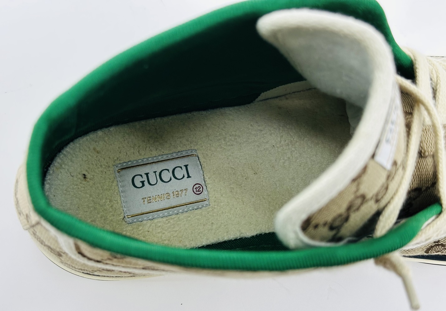 The Gucci Tennis 1977 High Top Beige GG Canvas sneakers are a sophisticated fusion of luxury and vintage aesthetics, illustrating the iconic craftsmanship and timeless designs synonymous with the Gucci brand. These high-top sneakers are expertly crafted using the house's signature GG canvas in a harmonious blend of beige and ebony, showcasing the storied GG motif that has become an emblem of elegance and status across generations. The high-top silhouette not only enhances a contemporary street-style look but also pays homage to classic tennis shoe designs from the late 20th century, bringing a nostalgic yet modern appeal to its wearer.