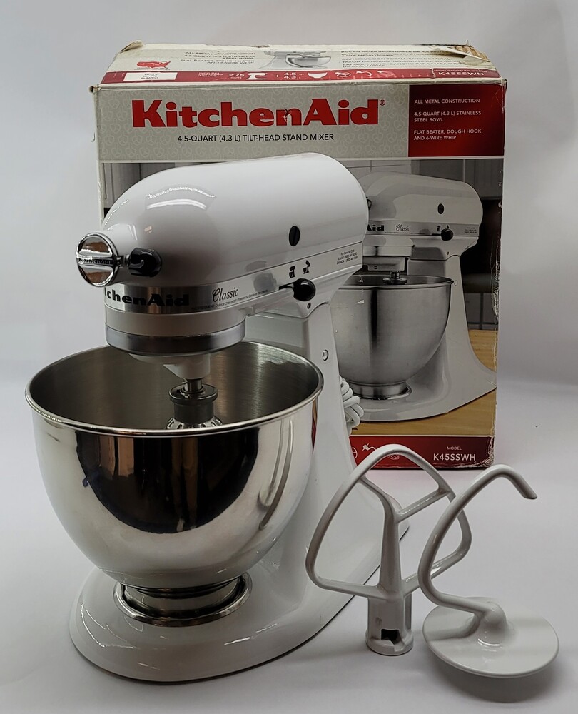 Model K45SSWH includes (1) 4.5-qt stainless steel bowl, (1) coated flat beater, (1) coated dough hook, (1) 6-wire whip