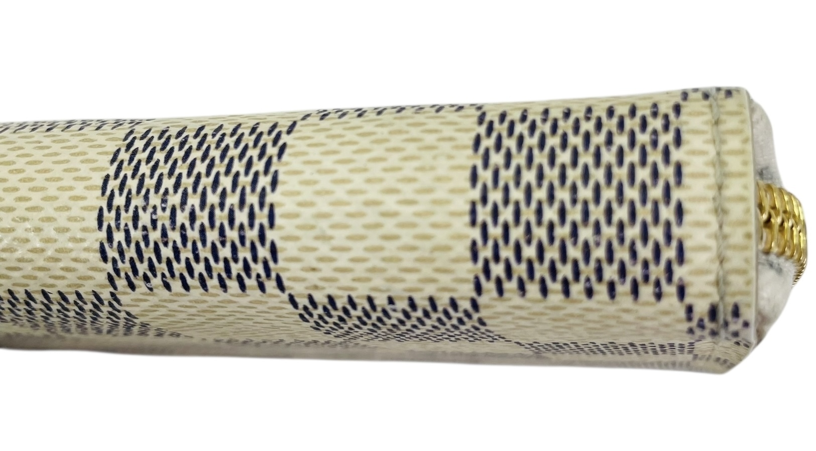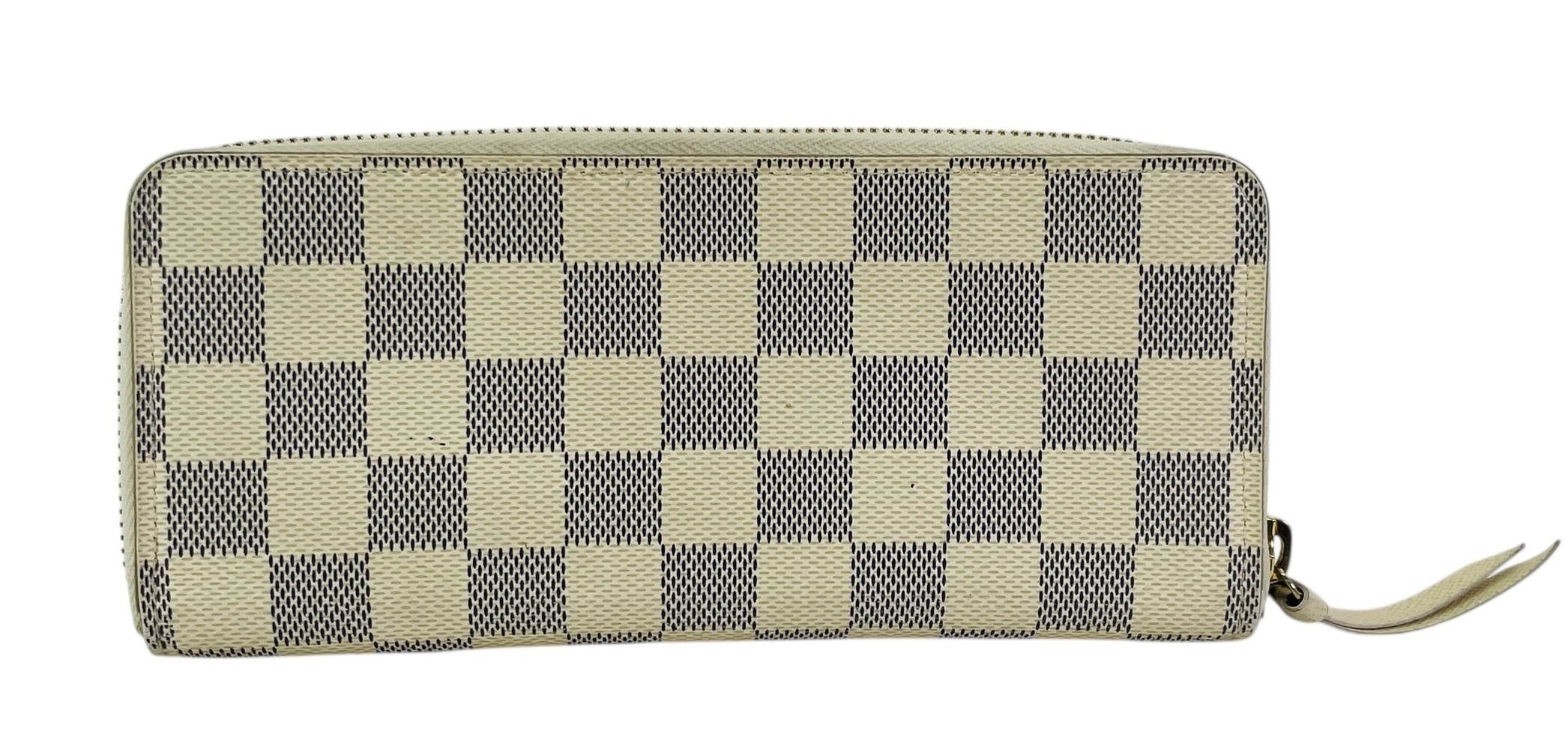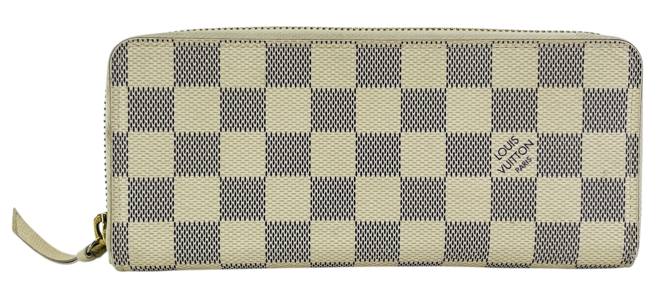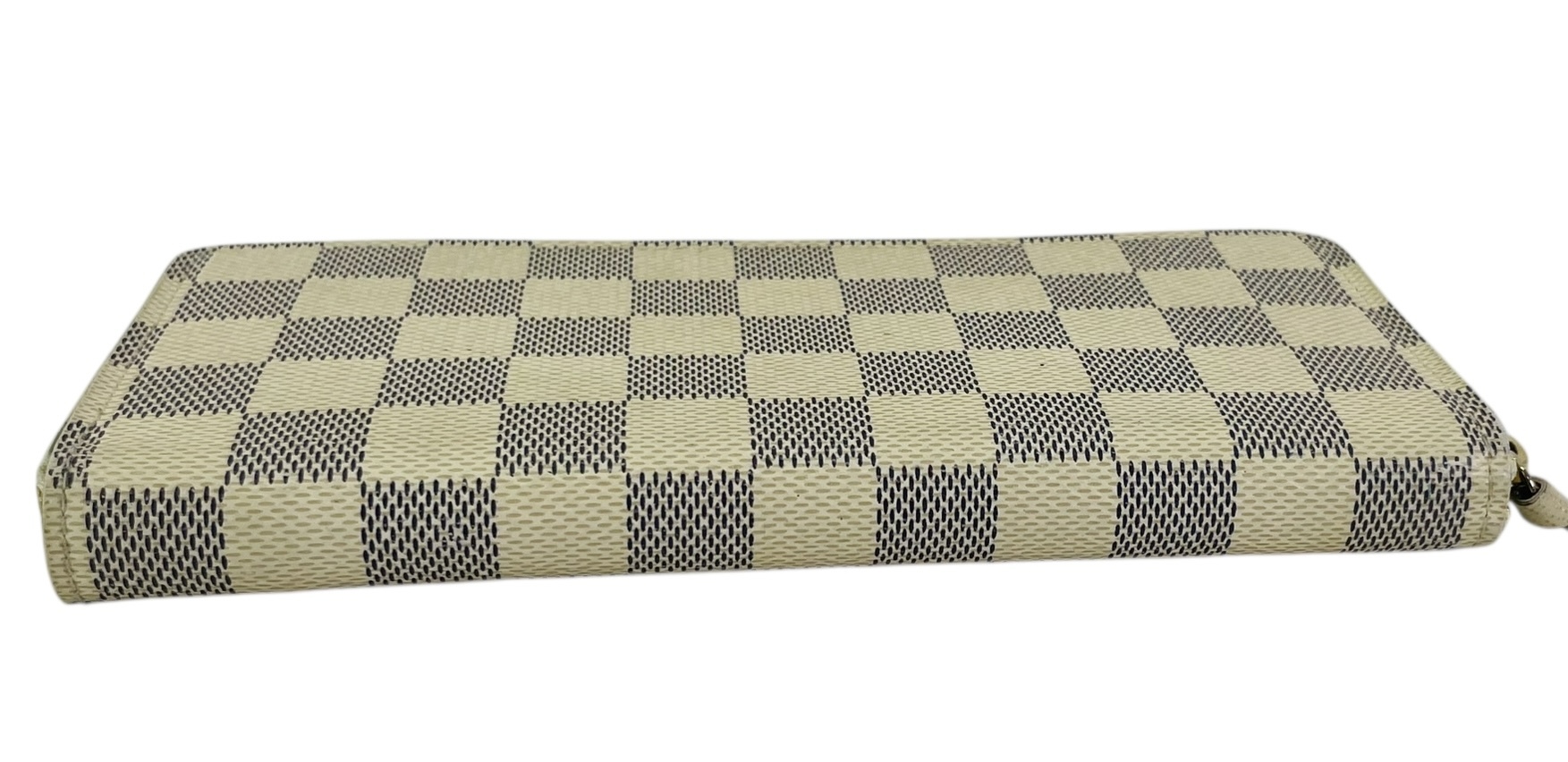 -This is a stylish zip-around wallet featuring the iconic Damier Azur Canvas pattern in a cream and blue checkerboard desing. The exterior is made of coated with a textured finish and includes gold-tone hardware on the zipper.