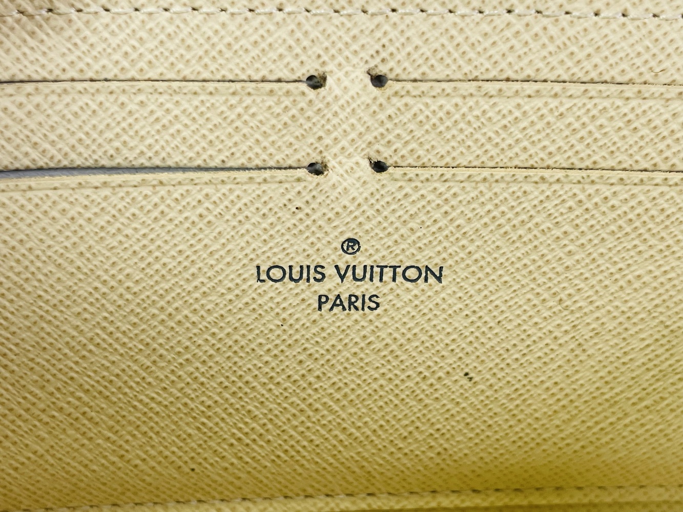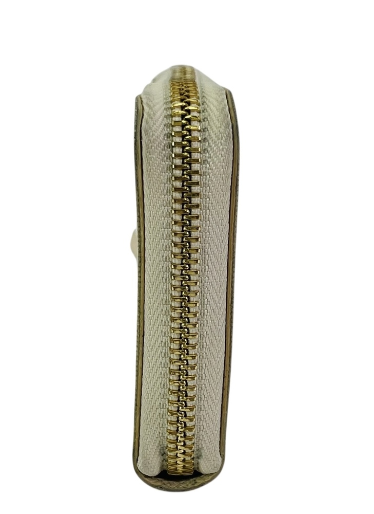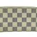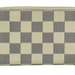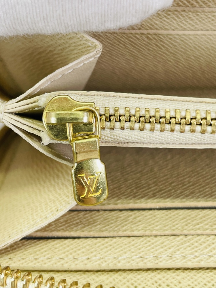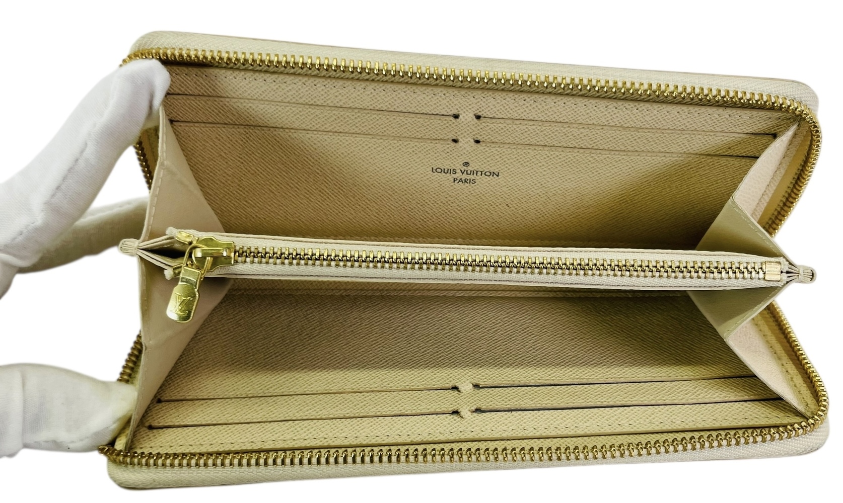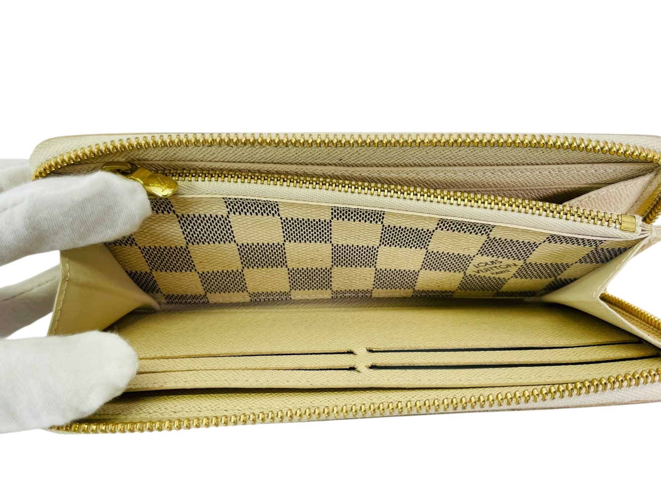 -This is a stylish zip-around wallet featuring the iconic Damier Azur Canvas pattern in a cream and blue checkerboard desing. The exterior is made of coated with a textured finish and includes gold-tone hardware on the zipper.