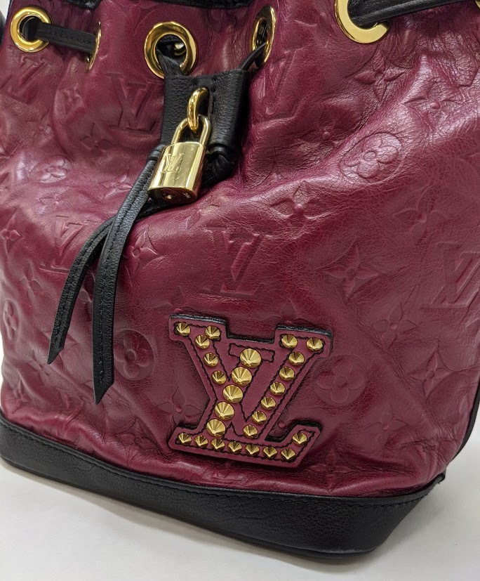 -Limited edition, burgundy Monogram leather Louis vuitton Double Jeu Neo-Neo Bag with brass hardware , single Flat top handle, black leather trim, studded logo applique at face .protective feet at base, black twinll linning, single zip pocket at interior wall and drawstring closure at top, Includes lock and dust bag.