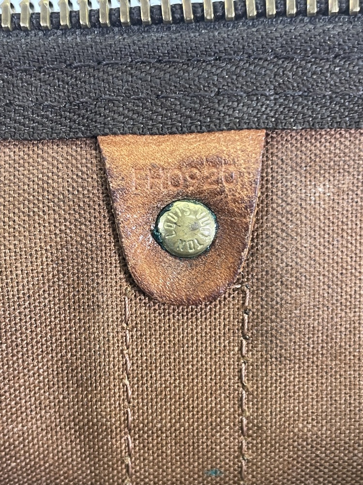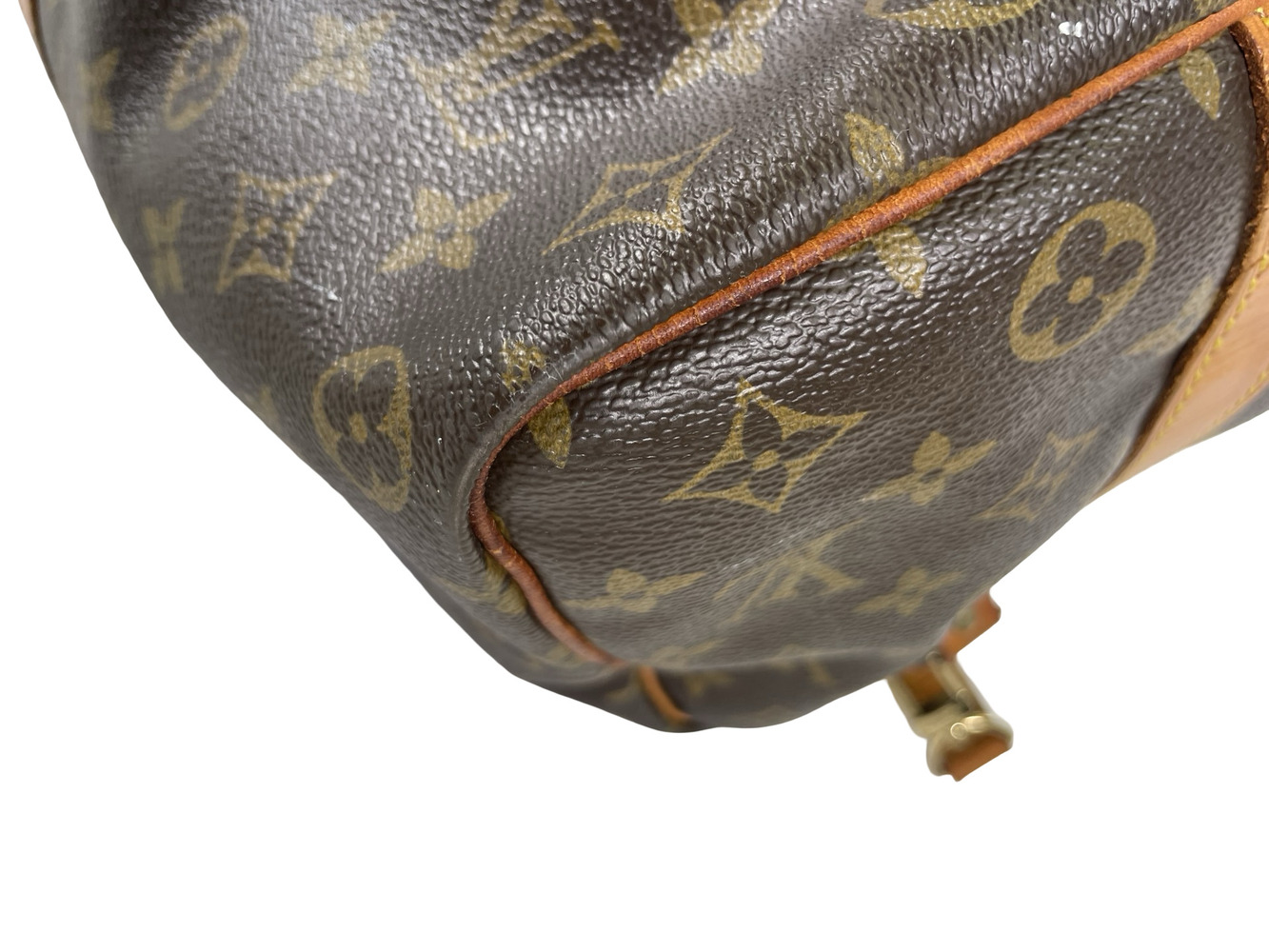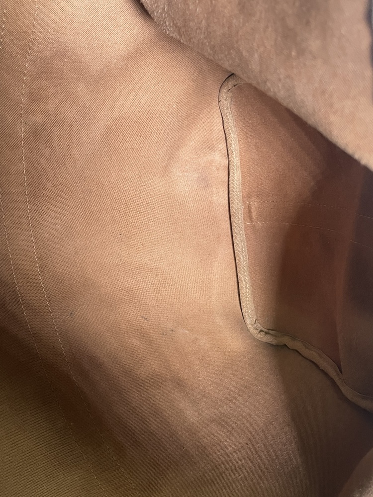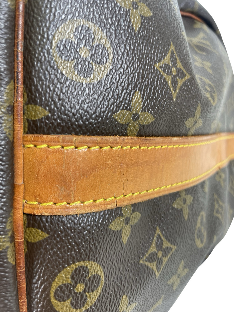 -This duffle is in good pre-owned condition, showing signs of wear, darkened handles, worn on all four corners, interior stains, discoloration, patina and scratches in the hardware, the leather trim is showing signs of scuffing and water marks.