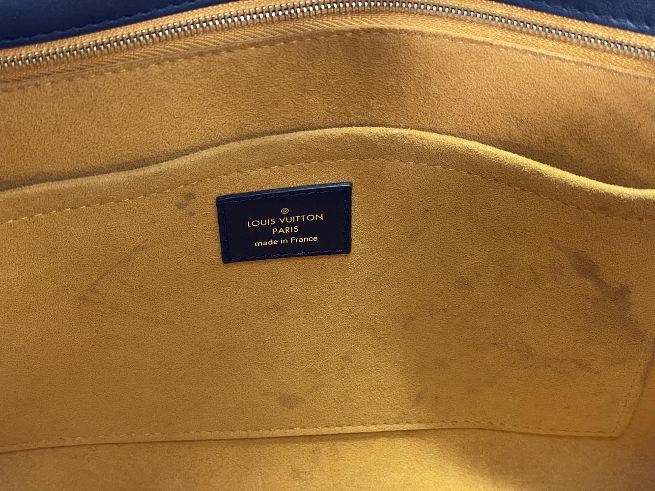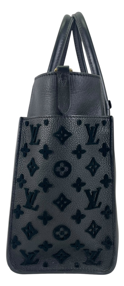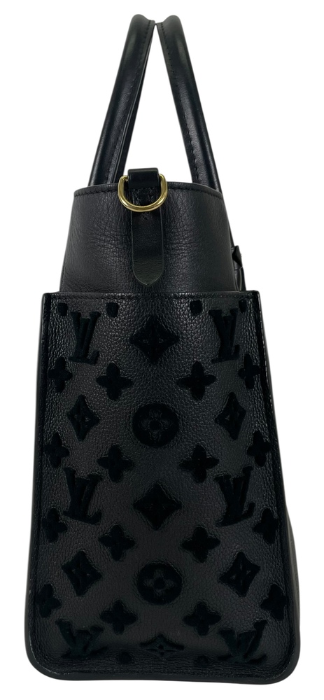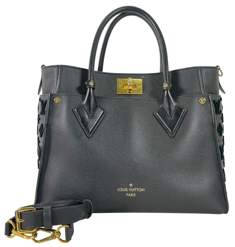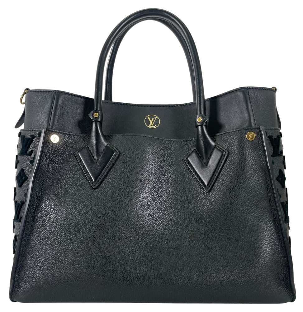 -The On My Side MM tote bag is fashioned from an elegant combination of small-grained calf leather and emblematic Monogram canvas. The large outside pockets in contrasting canvas create a bag-in-a-bag look. The roomy interior can easily hold everything needed for a day at the office while the adjustable strap makes for practical cross-body carry.
