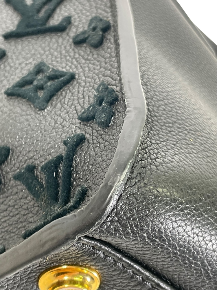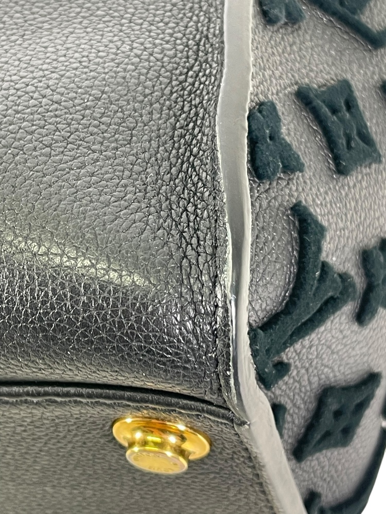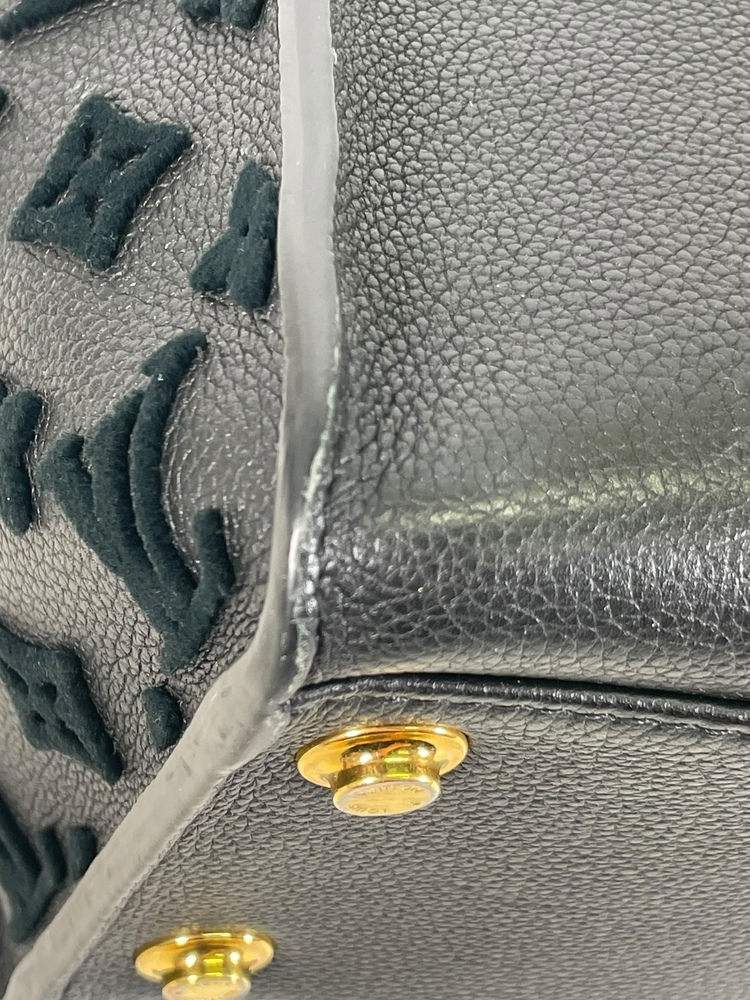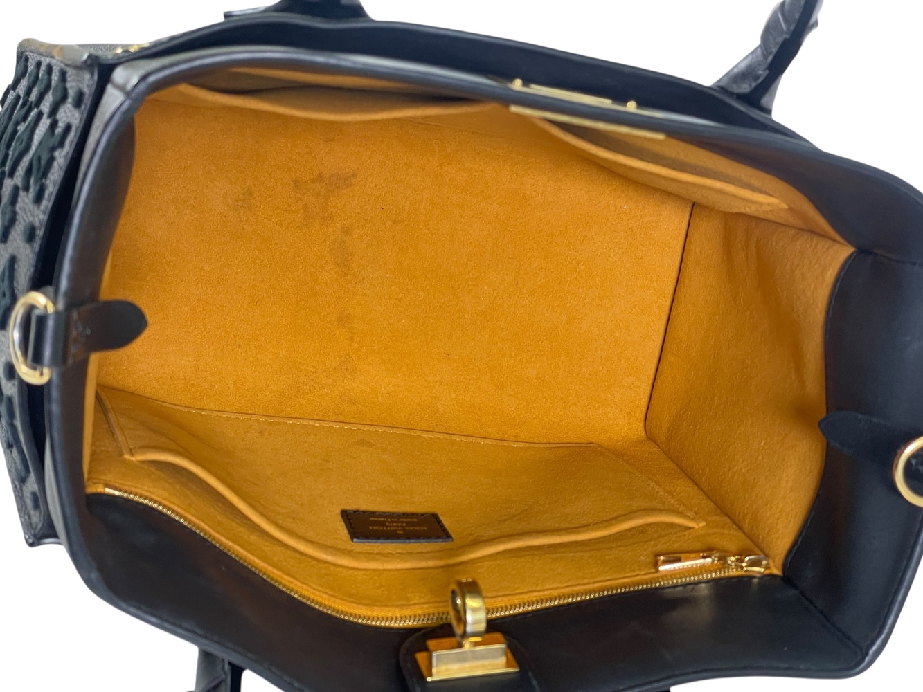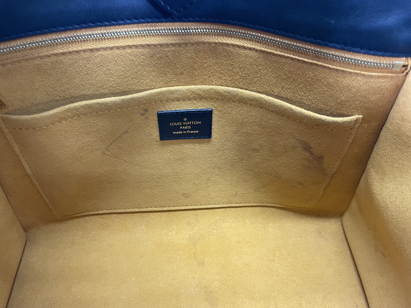-The On My Side MM tote bag is fashioned from an elegant combination of small-grained calf leather and emblematic Monogram canvas. The large outside pockets in contrasting canvas create a bag-in-a-bag look. The roomy interior can easily hold everything needed for a day at the office while the adjustable strap makes for practical cross-body carry.