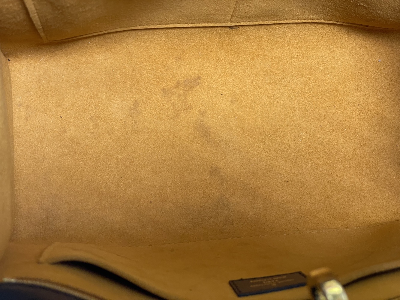 -This bag is in very good pre-owned condition shows wear on the corners, scratches on the hardware and feet, and some stains inside, But overall remains very funcional.
