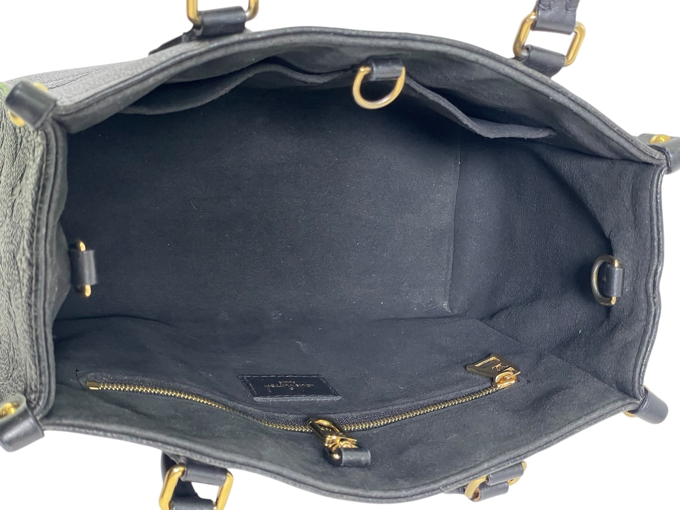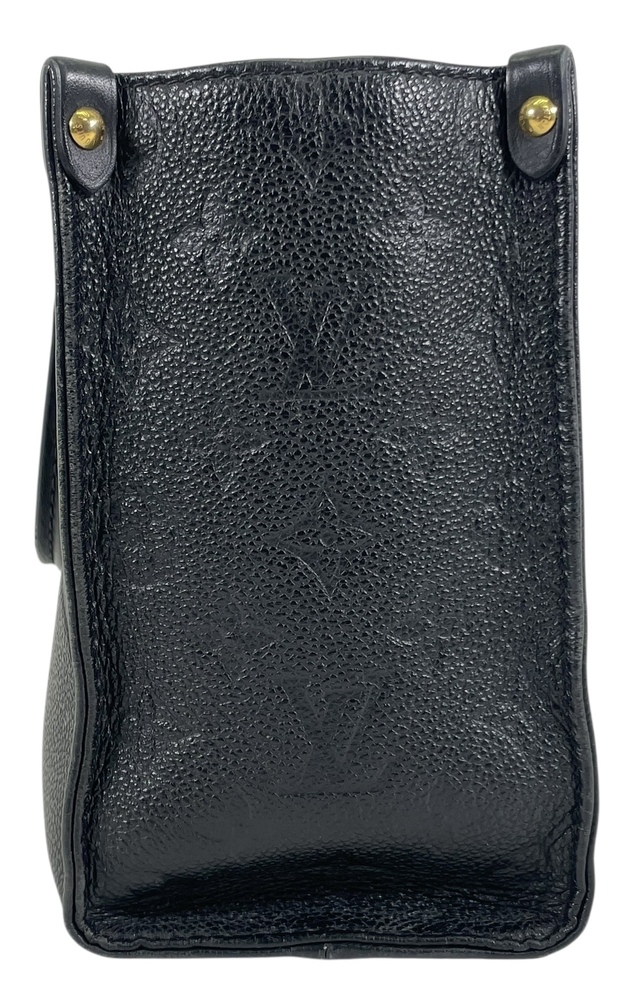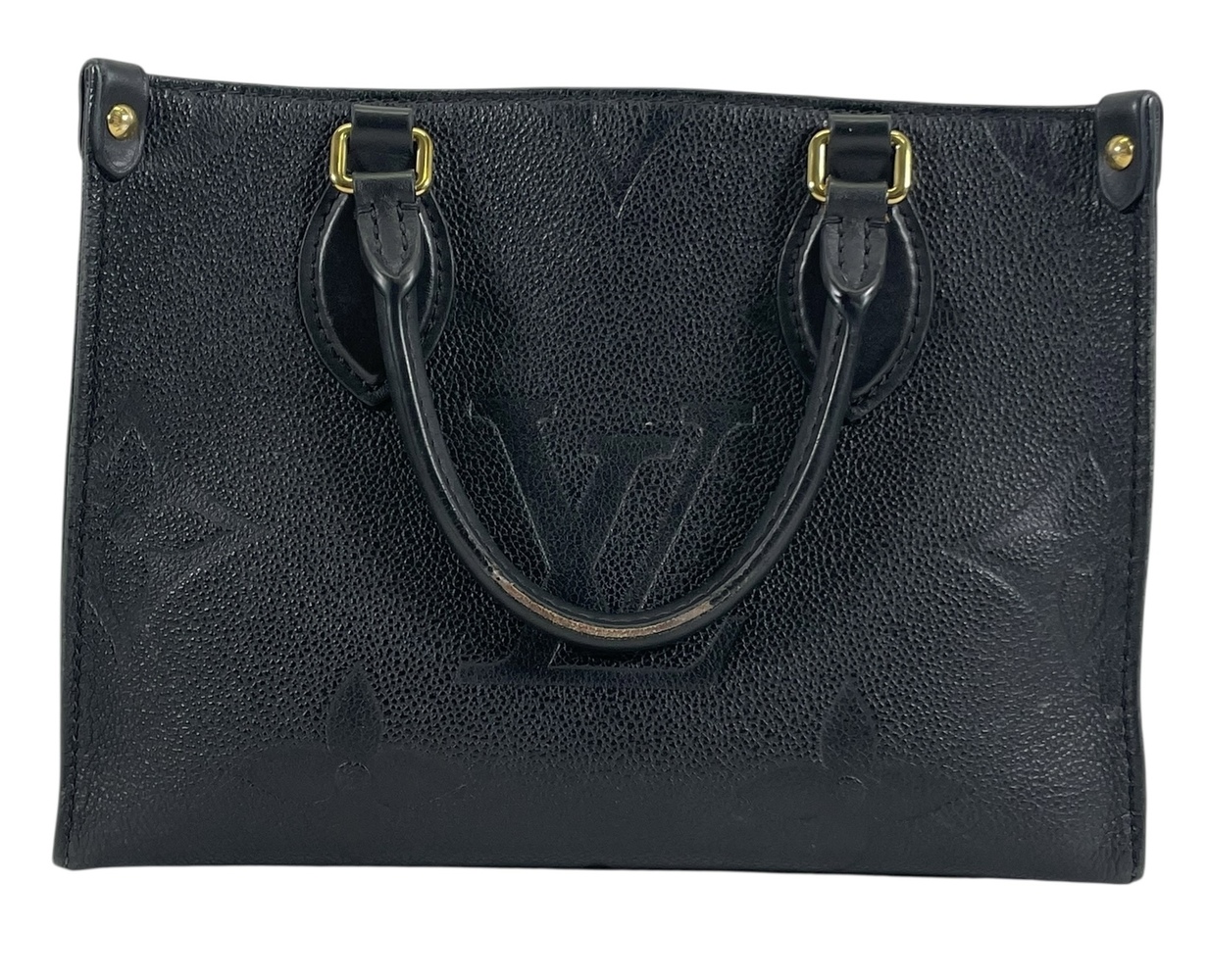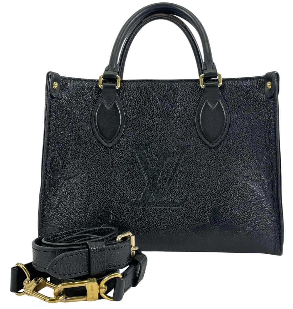 -Inspired by Louis Vuitton’s famous Sac Plat from 1968, the Onthego PM tote is fashioned in Monogram Empreinte leather, embossed with a subtle embossed Giant Monogram pattern. This smaller version of the original Onthego fits essentials such as an iPad Mini. Articulated top handles and an adjustable removable strap offer a variety of carry options.