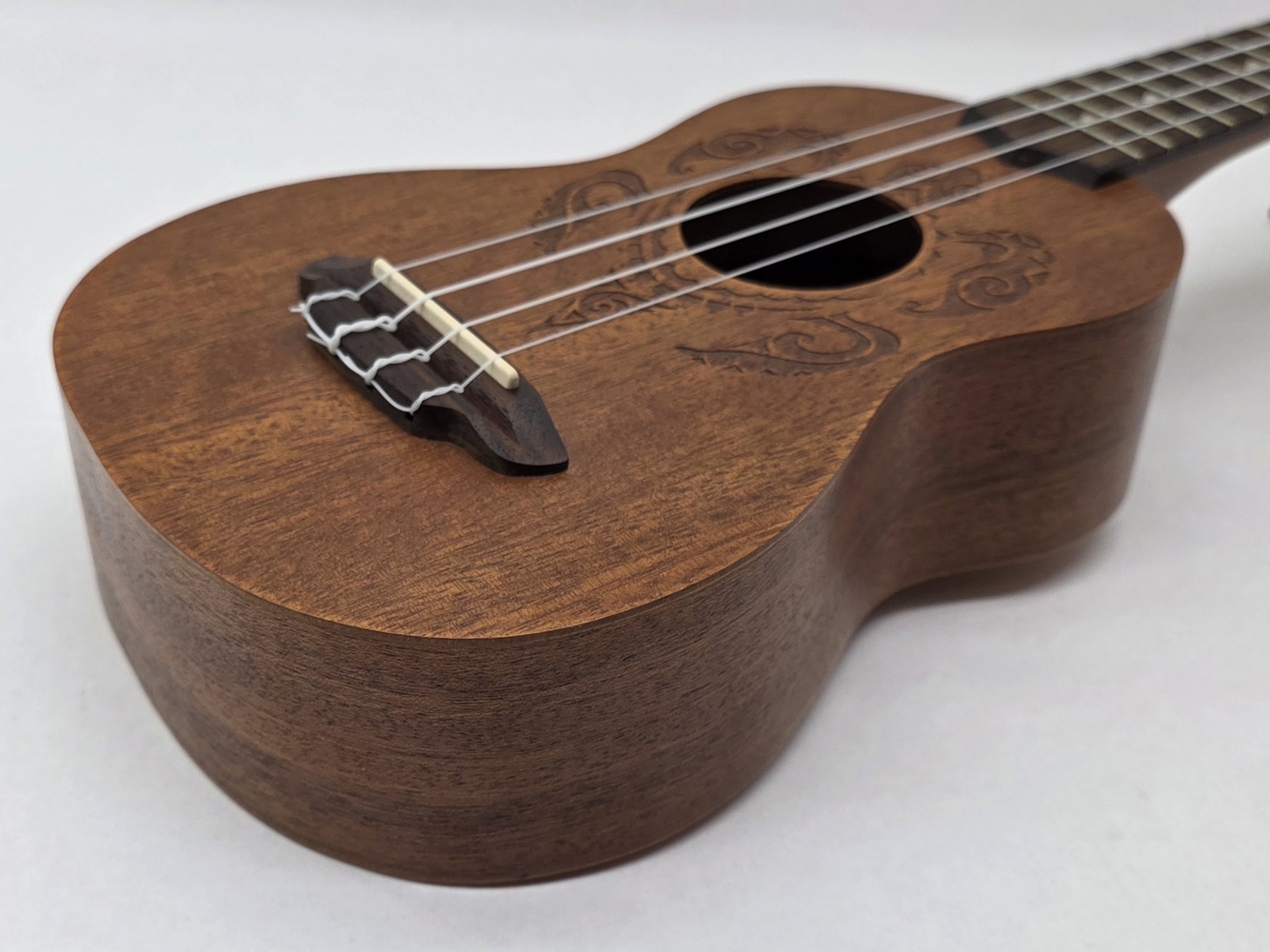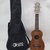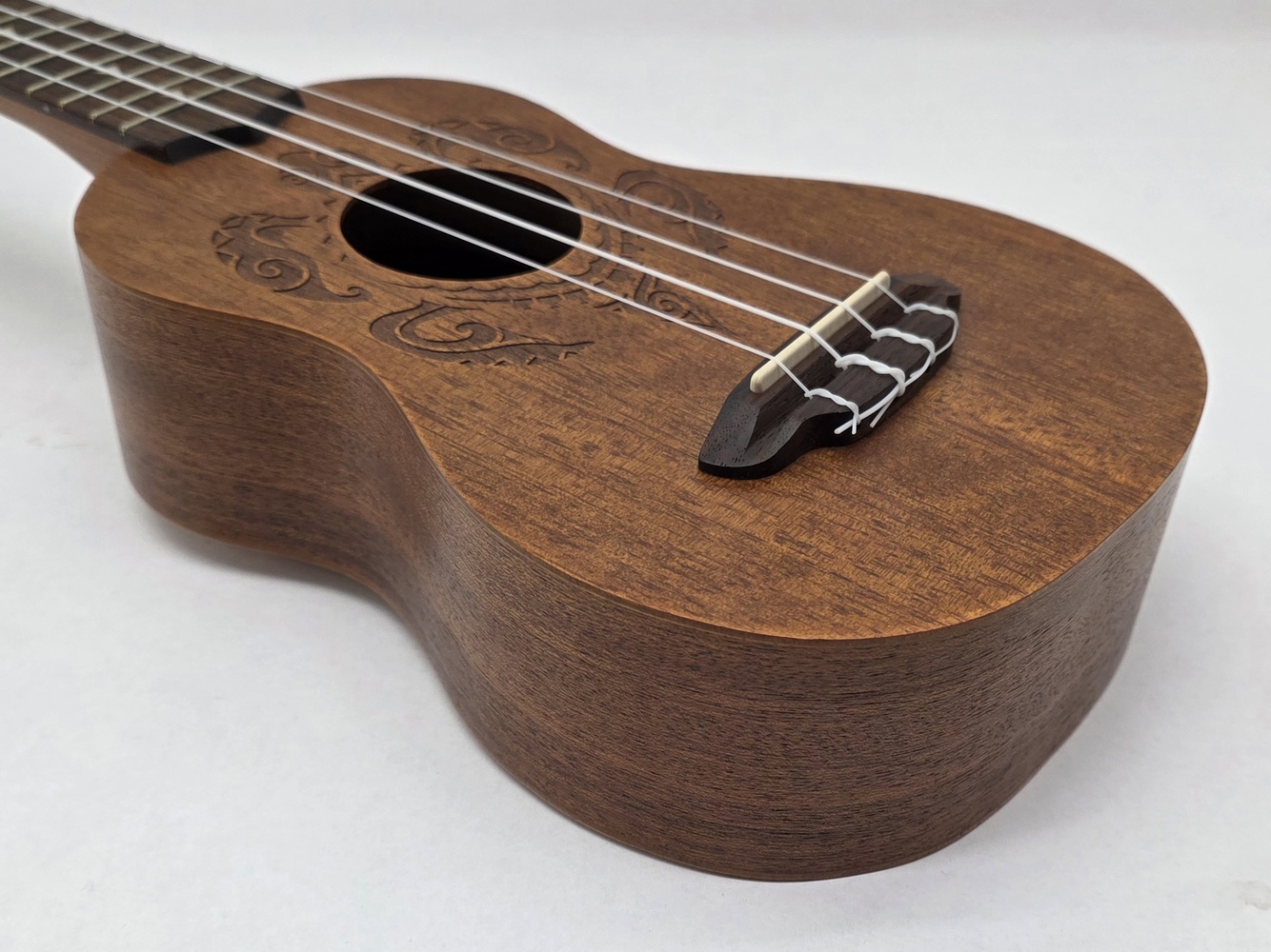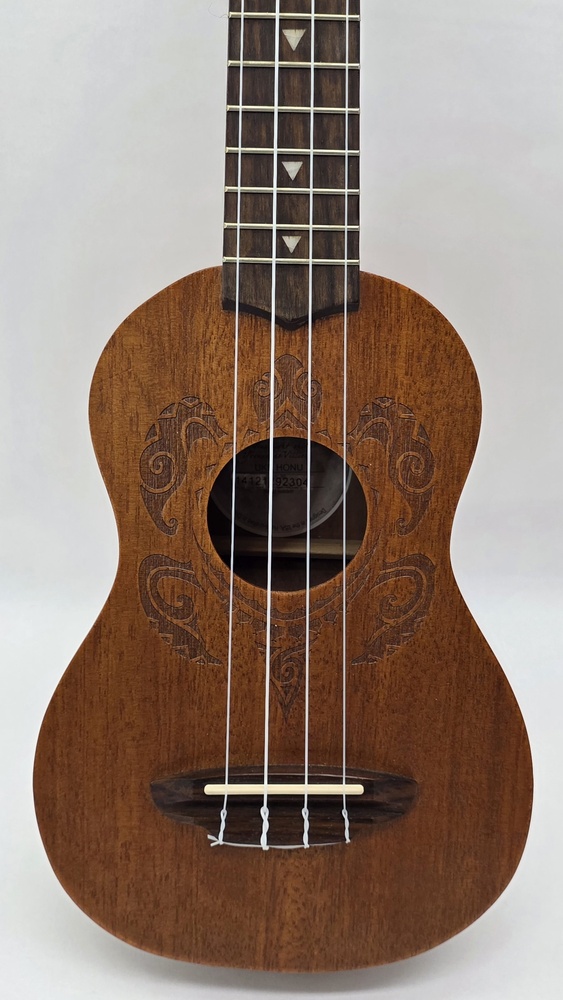 Acoustic soprano ukulele with mahogany body. In very good condition with little wear from previous use. Traditional Hawaiian Honu/Turtle design. Right handed. Includes original soft travel case. Will need to be tuned! See all pictures for exact physical condition.