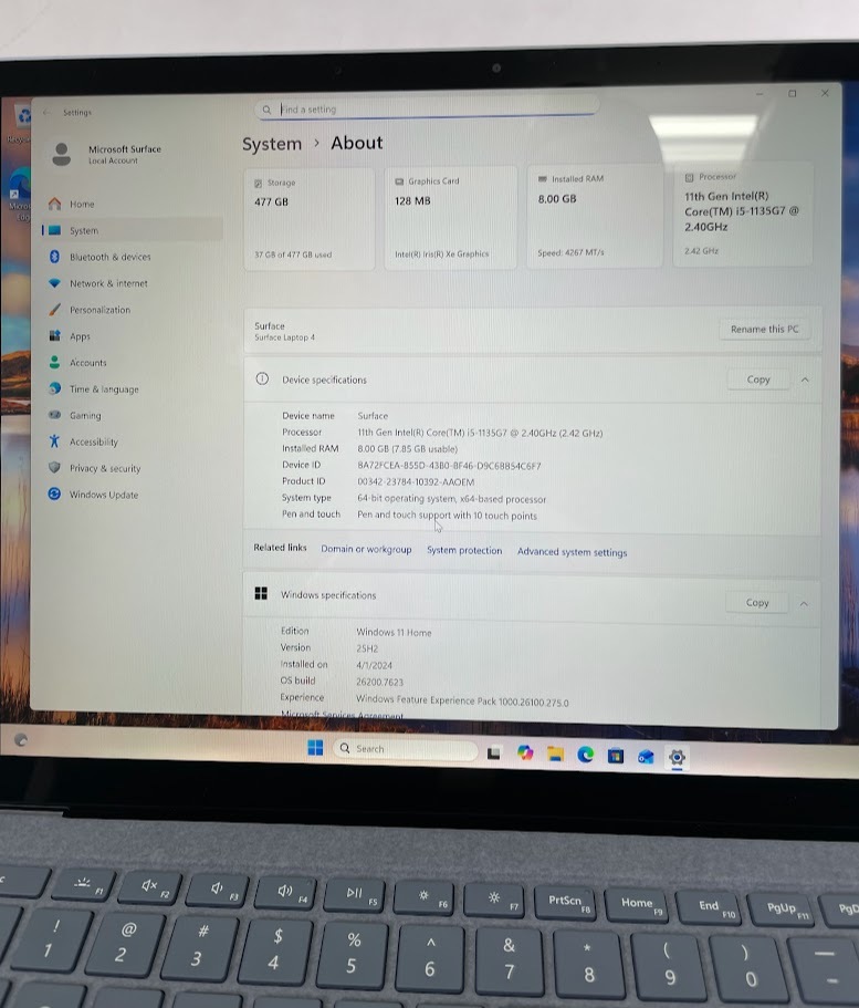 The Microsoft Surface Laptop 4 13.5 in Ice Blue features an Intel Core i5-1135G7 processor (4 cores, 8 threads, 2.42GHz base clock), 8GB LPDDR4x RAM, and a 512GB NVMe SSD. It runs Windows 11 Home for optimized productivity. The 13.5-inch PixelSense touchscreen offers a 2256x1504 resolution with 3:2 aspect ratio, delivering sharp visuals. Connectivity includes Wi-Fi 6 and Bluetooth 5.0, making it ideal for business and multitasking tasks.
