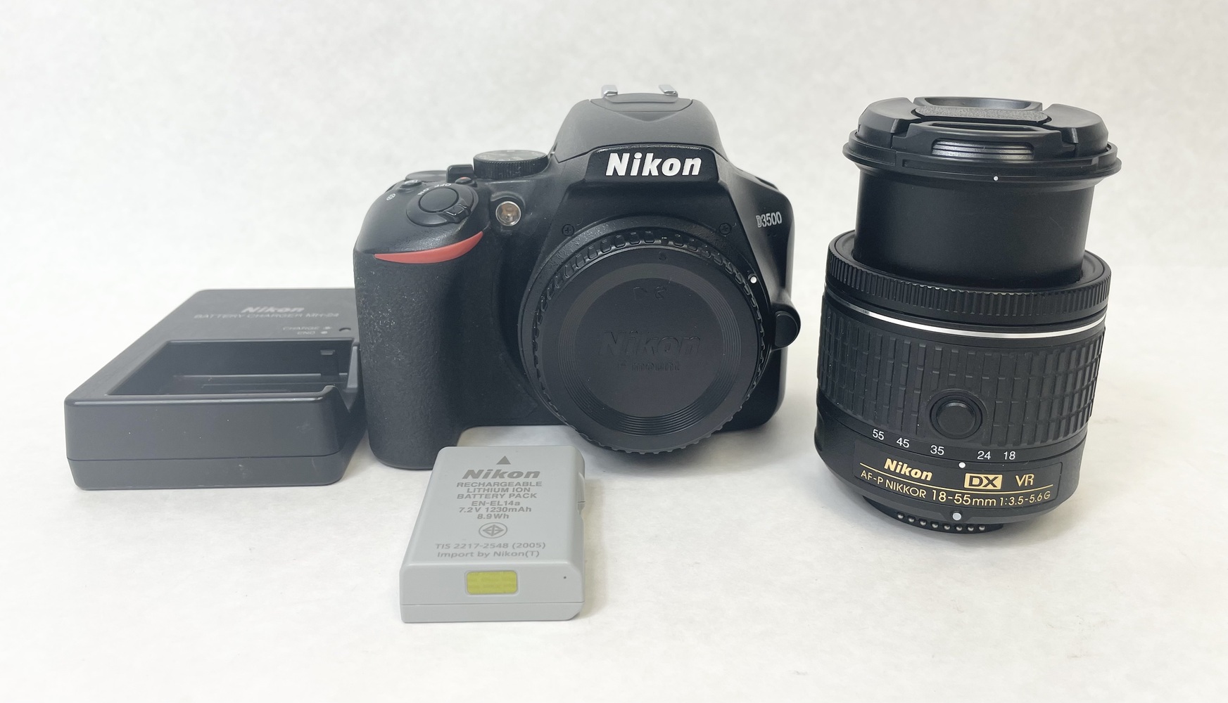 - Includes Camera Body, Battery, Charger, Front Lens Cap, 18-55mm Zoom Lens W/ Top Lens Cap