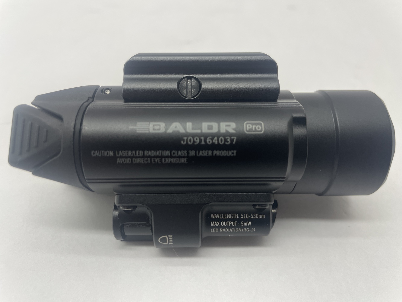 OLIGHT BALDR PRO Tactical Light & Green Laser. Tested and functions as intended. Featuring a class IIIa <5mW 1,350 max lumens green laser with strobe mode. Powered by two Olight CR123A batteries. Compatible with Glock and Picatinny sized rails. Also compatible with holster brands Werkz and Bucks. Check photos for full physical conditions of this product. No box. Scope only.
