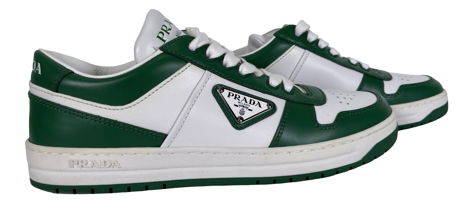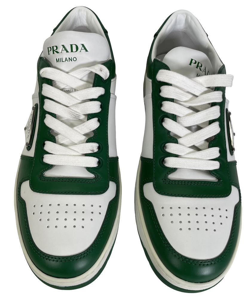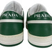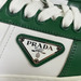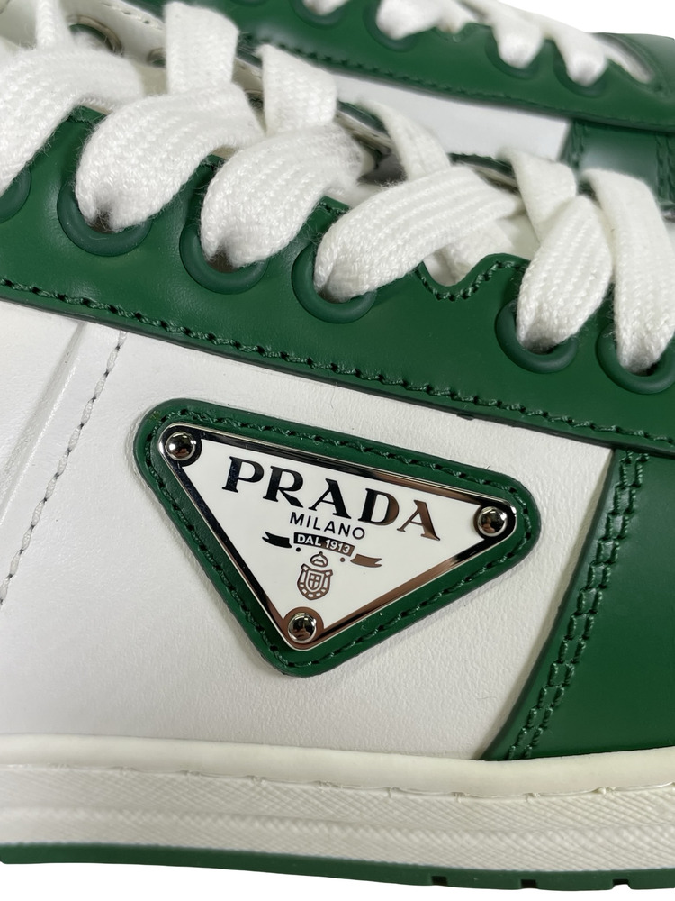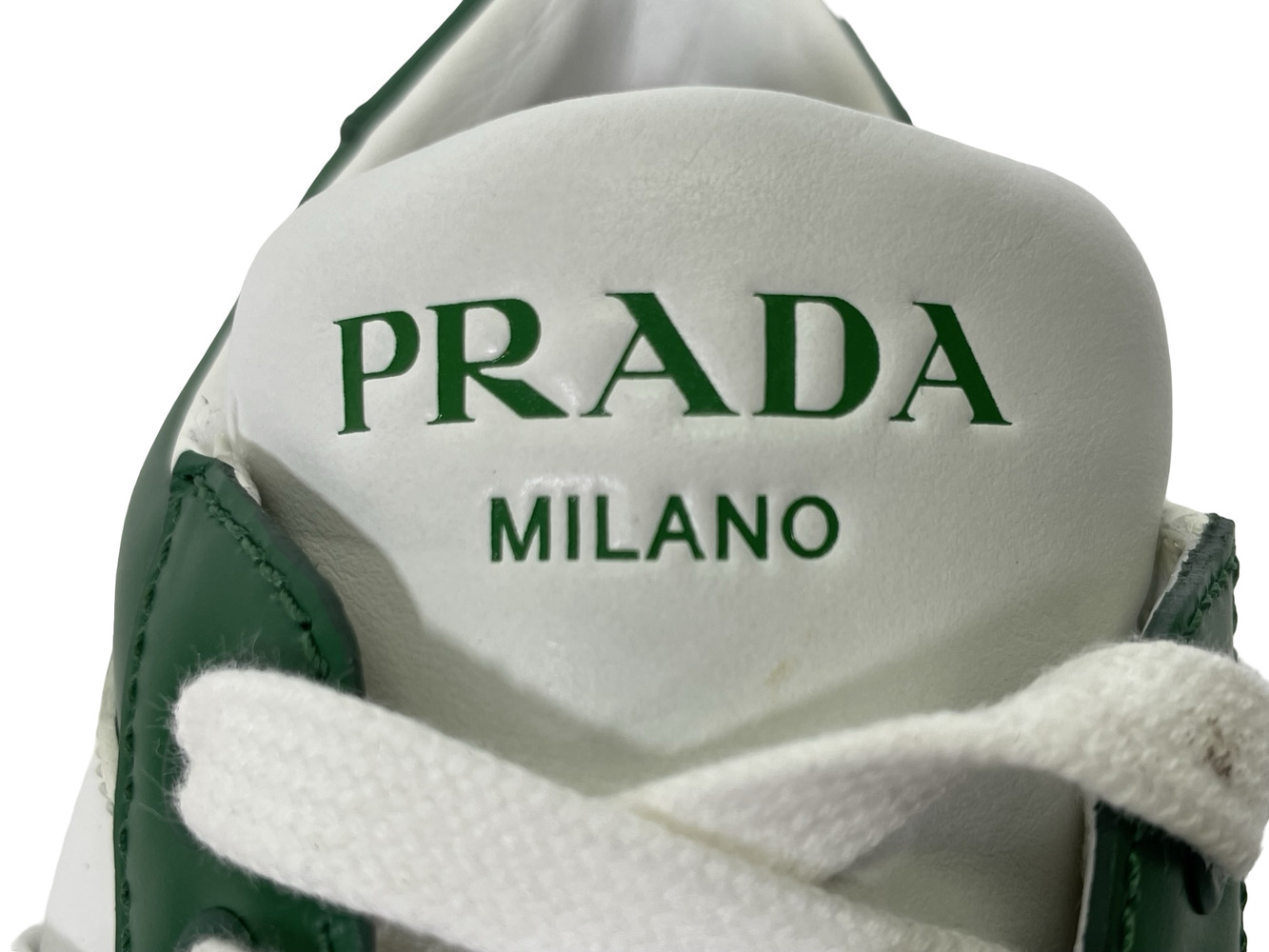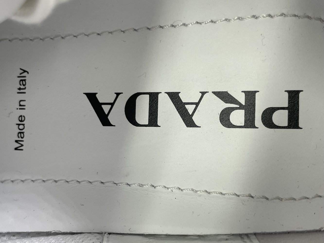 -These sporty leather sneakers are accented with different interpretations of the Prada logo that appears on the tongue, along the light rubber sole, and as the iconic enameled metal triangle decorating the side of the upper.