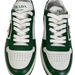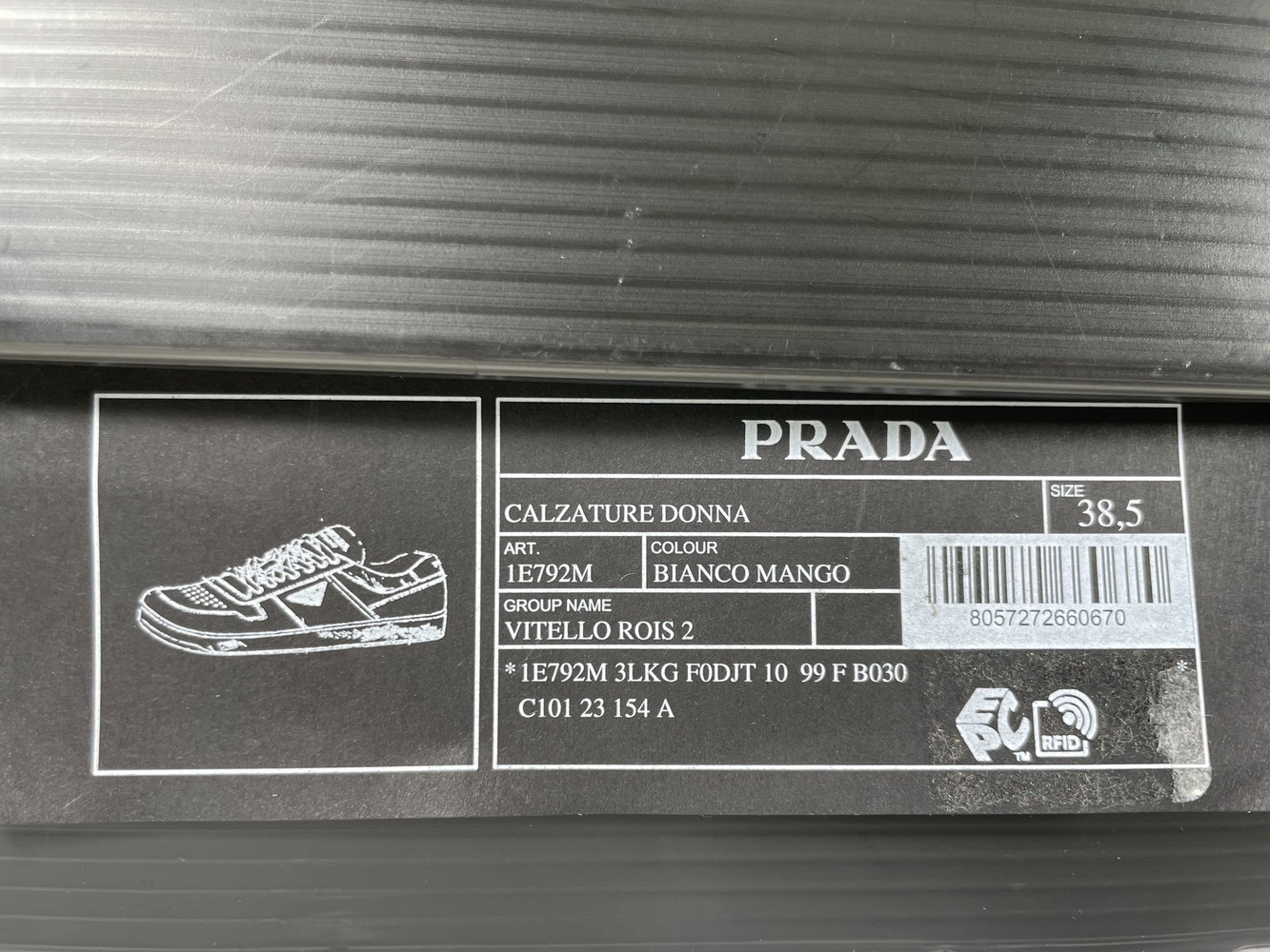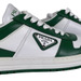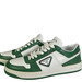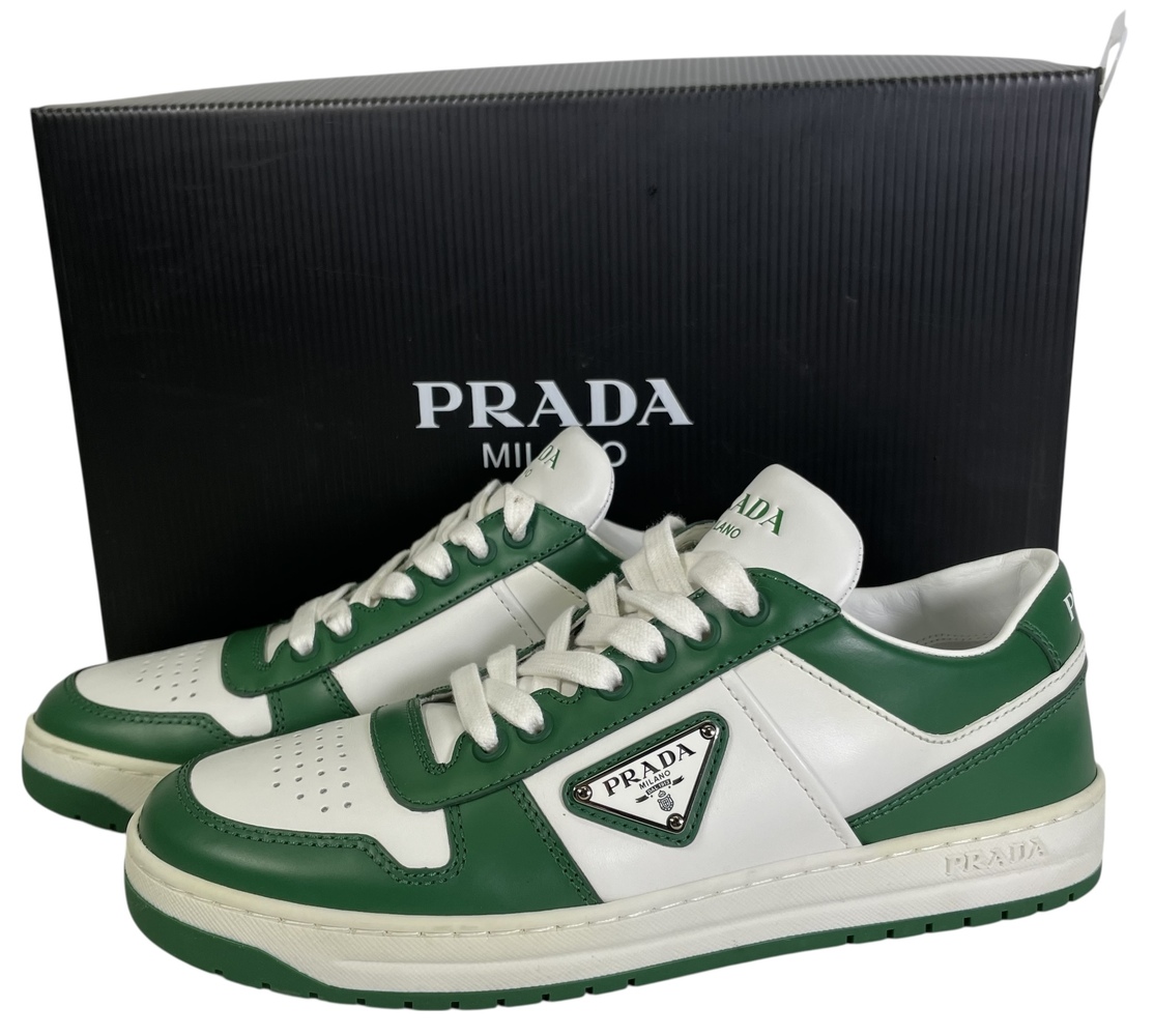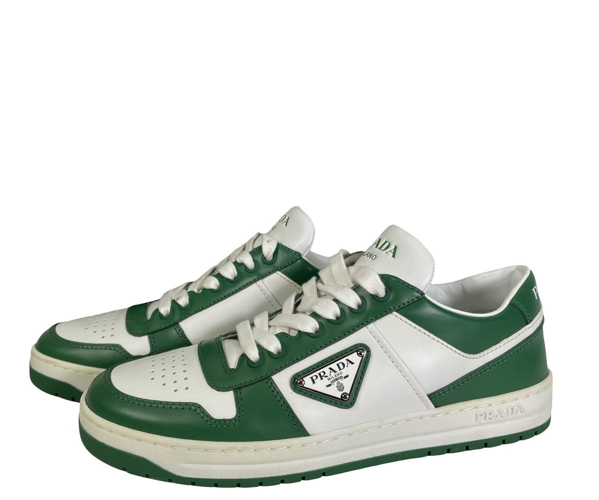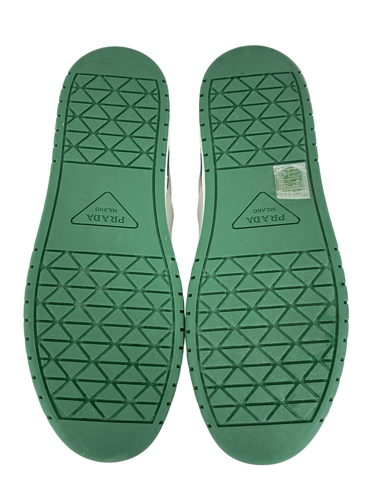 -These sporty leather sneakers are accented with different interpretations of the Prada logo that appears on the tongue, along the light rubber sole, and as the iconic enameled metal triangle decorating the side of the upper.