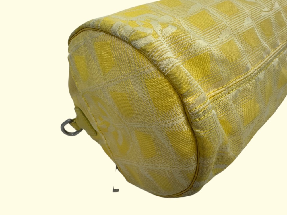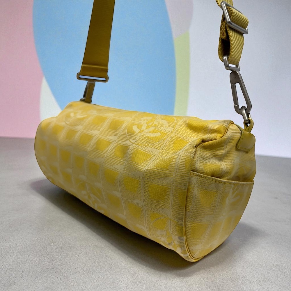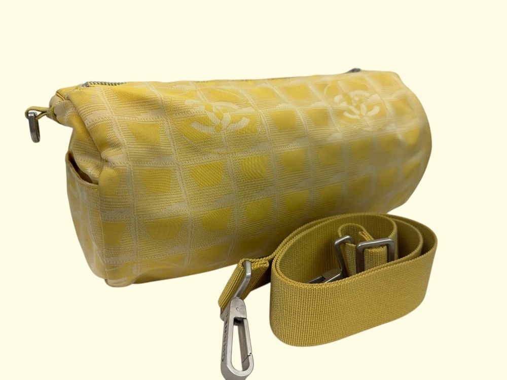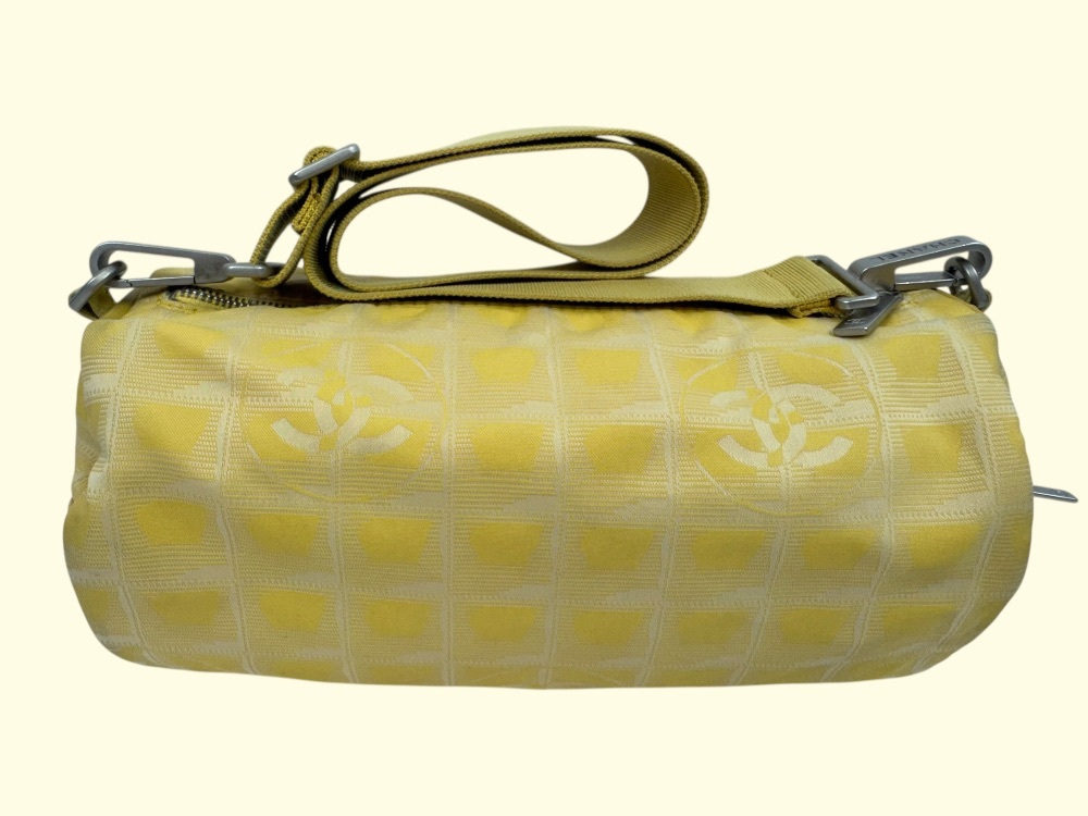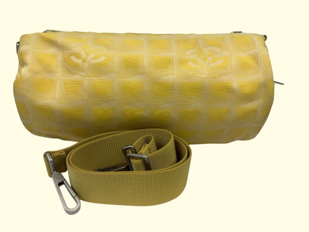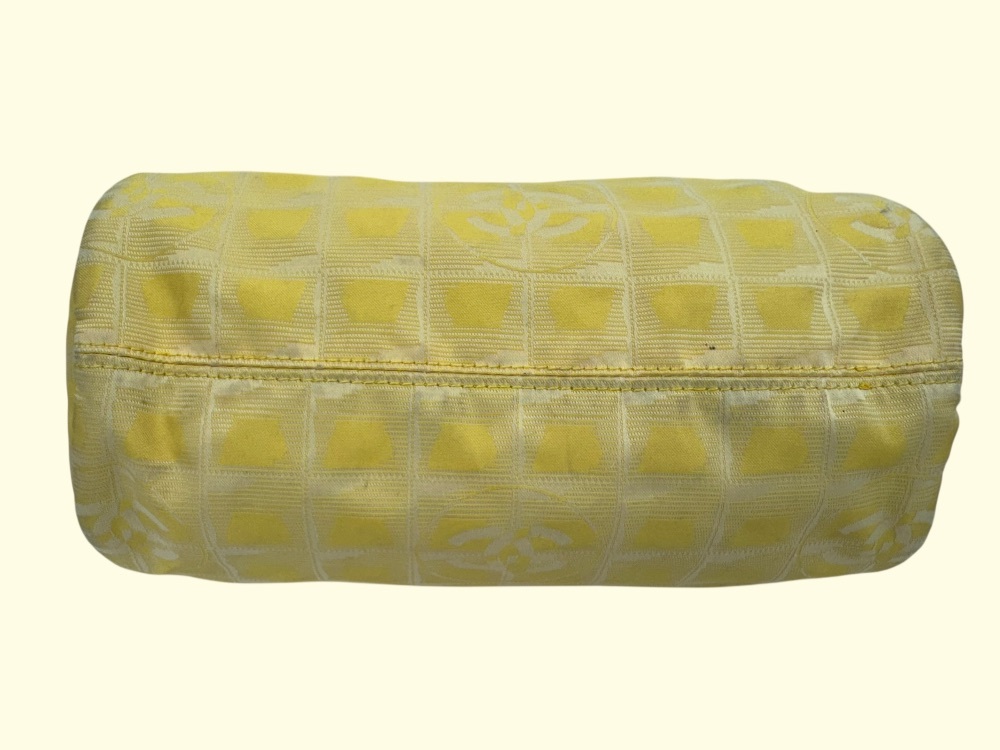 Chanel Nylon Printed Barrel Travel Bag Clutch Handbag Yellow