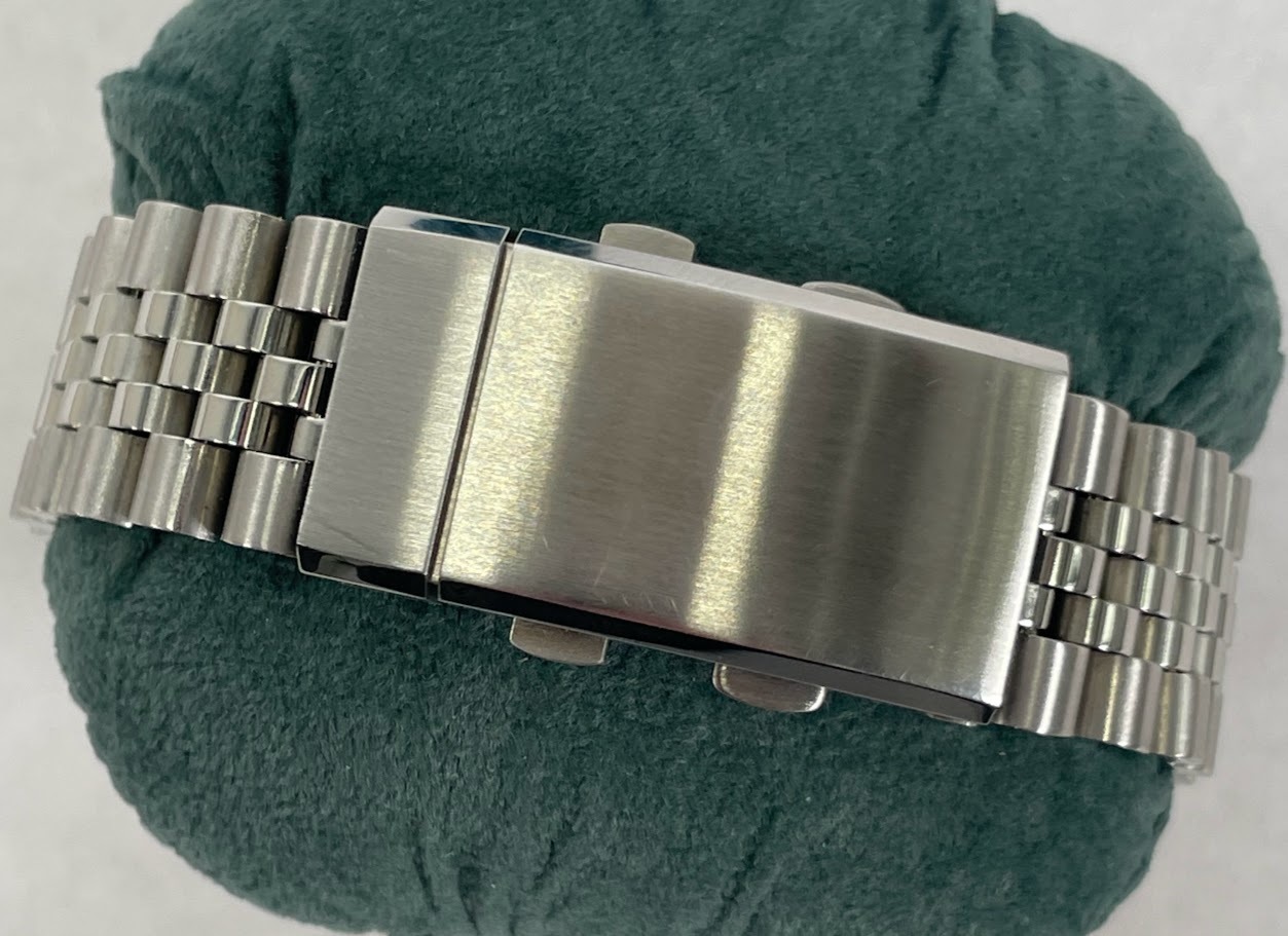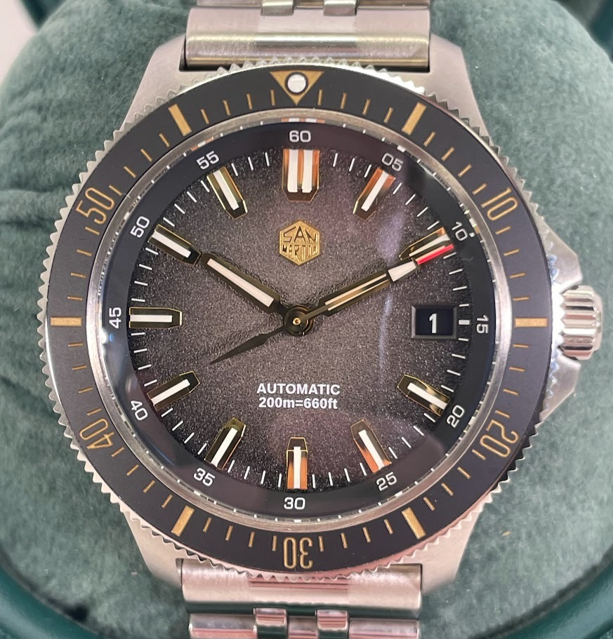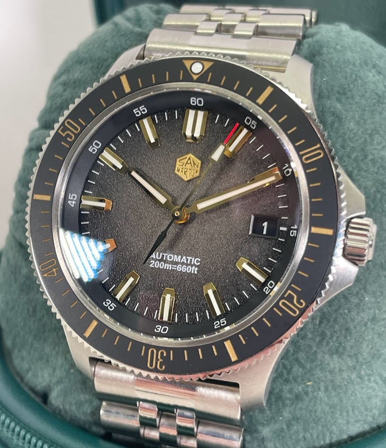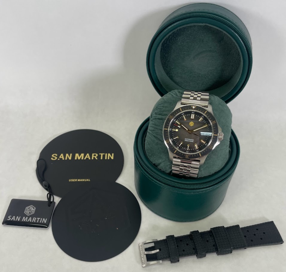 The San Martin Automatic for sale is preowned, but in excellent condition. It has been fully tested and is in perfect working order. Included is the original box, case, black band, and paperwork.