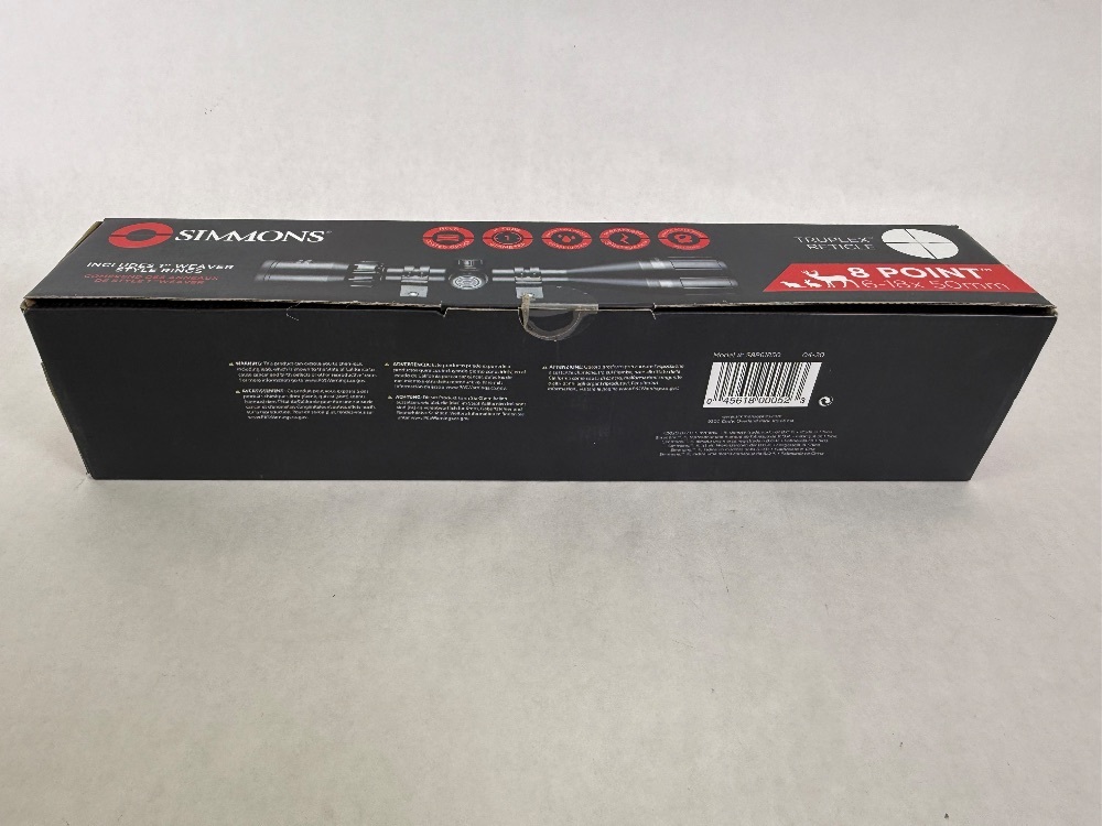 The Simmons 8 Point 6-18x50 Scope S8P6185O offers a variable 6-18x magnification range, 50mm objective lens, and a TrueZero flex erector system for repeatable accuracy. It carries a fully coated, high-quality optical glass for bright and sharp images. This waterproof, fogproof, and shockproof scope offers durable performance.