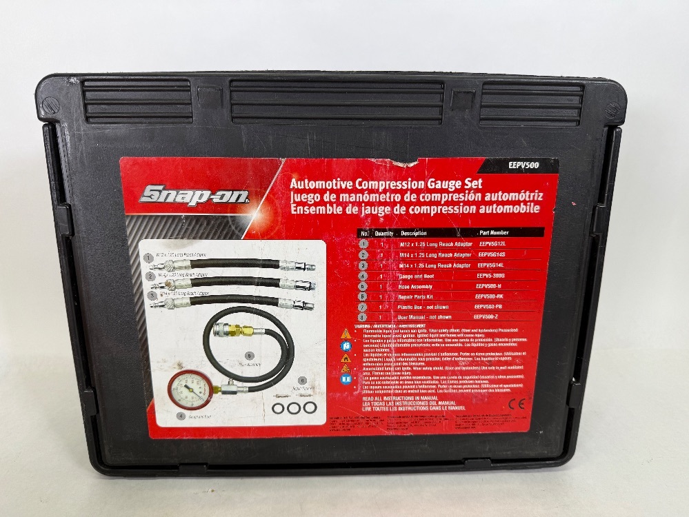 The Snap On EEPV500 Automotive Compression Gauge Set is a professional tool for assessing engine cylinder compression levels. Features include a user-friendly layout, high-quality pressure gauge, multiple adapter and extension sizes, and a sturdy carrying case for portability. Ideal for mechanics and automotive professionals.