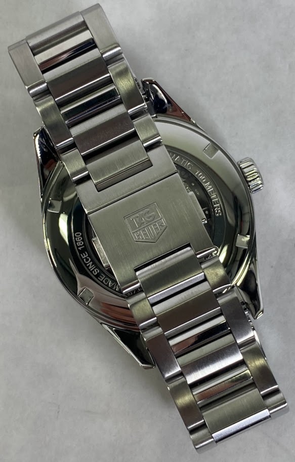 The Tag Heuer watch for sale is preowned but in great overall condition showing little to no signs of wear. The crystal, case, and band are all scratch free. Only the inside of the band and clasp show wear. The watch has been fully tested and is perfect working order. The original case is inlcuded but no papers. The watch currently fits up to a 7.5" wrist.