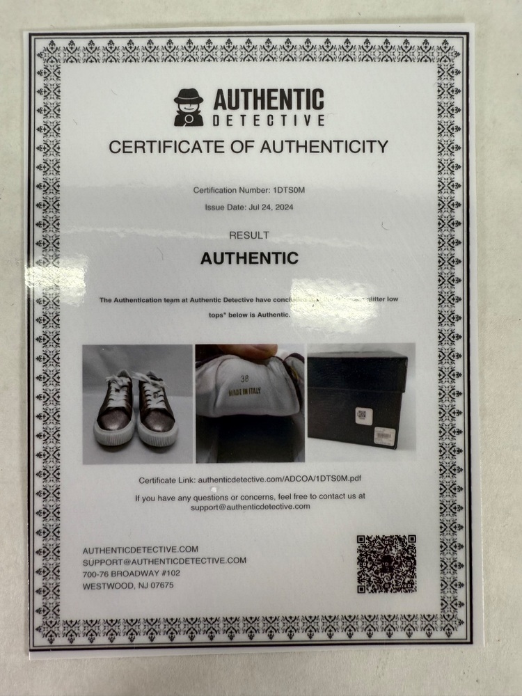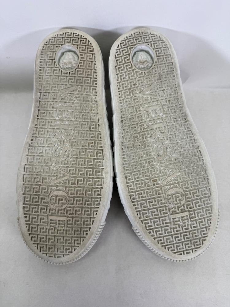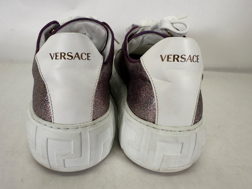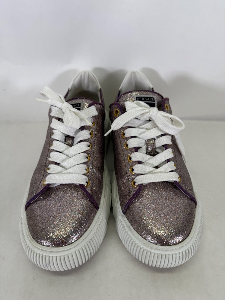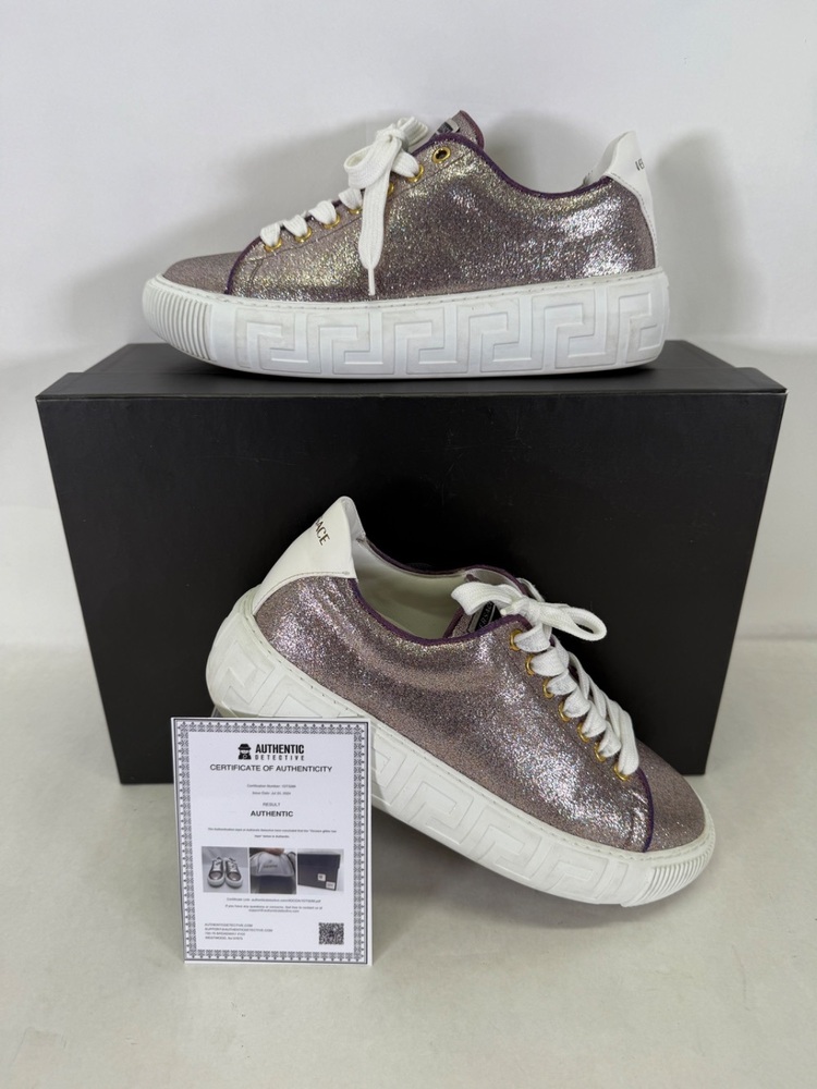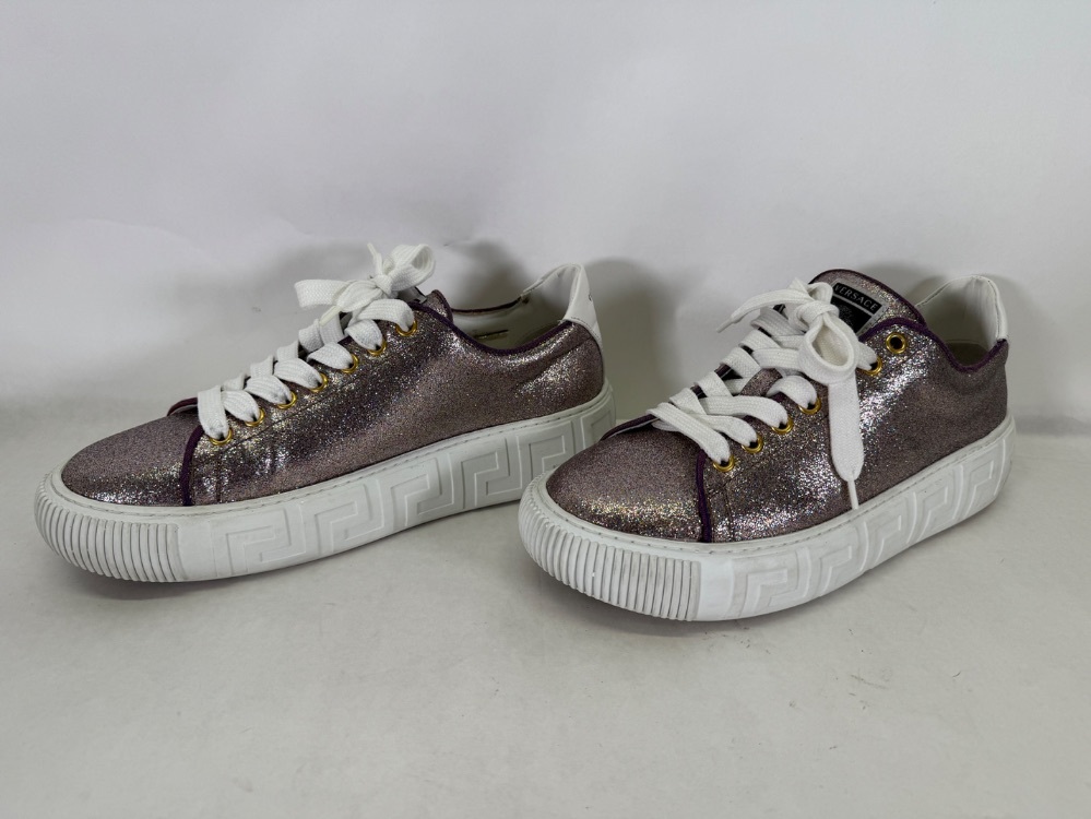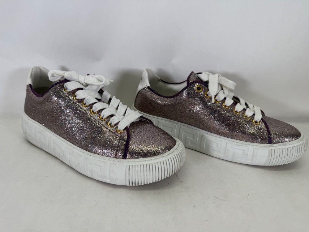 Versace Greca Glitter Low-Top Sneakers in size 38 are stylish and comfortable footwear. These sneakers feature a dazzling glitter design, low-top silhouette, and Versace's iconic Greca pattern. Perfect for casual or special occasions, providing a chic, luxurious touch to any outfit.